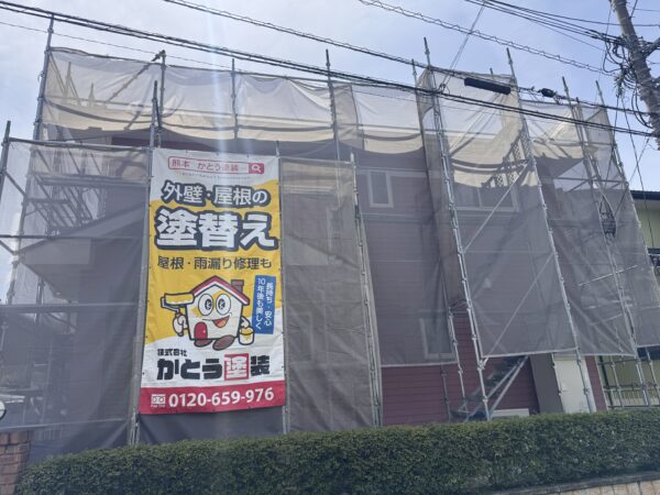 安全に作業を行うため、建物の周囲に足場を設置し、飛散防止ネットを張ります。