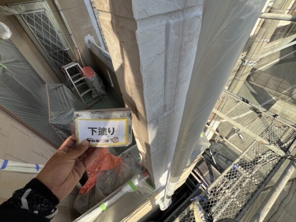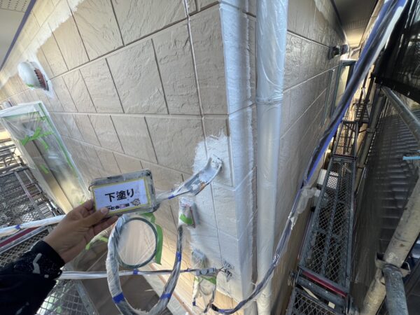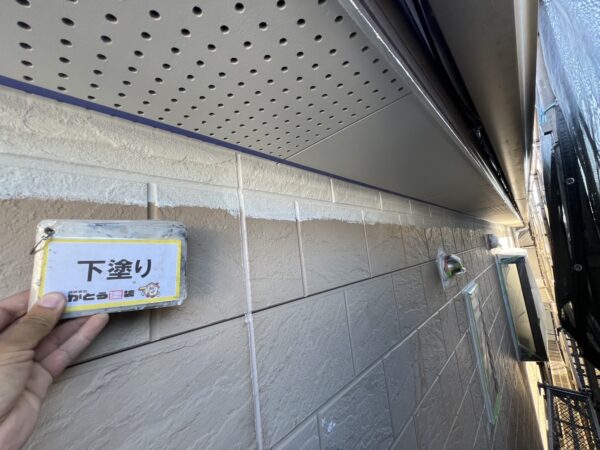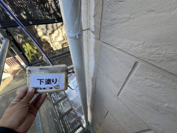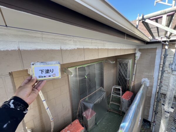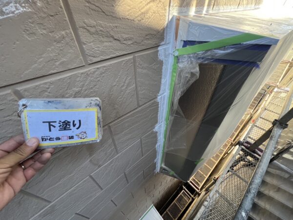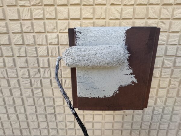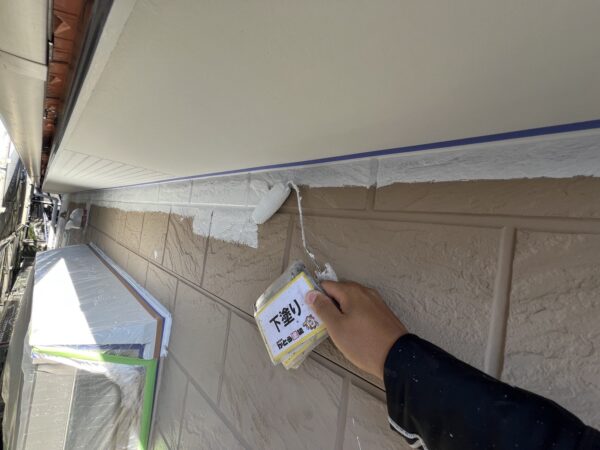 外壁下塗り状況です。ローラーで入らないところは刷毛で塗っていきます。