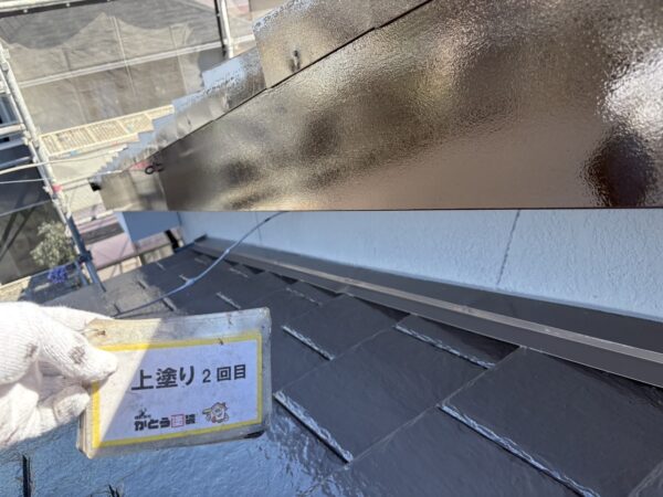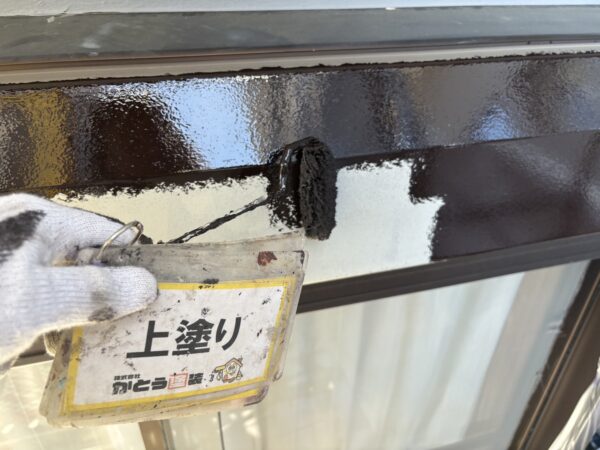 破風板2回目の上塗り状況です。一回目よりも艶が出てきました。