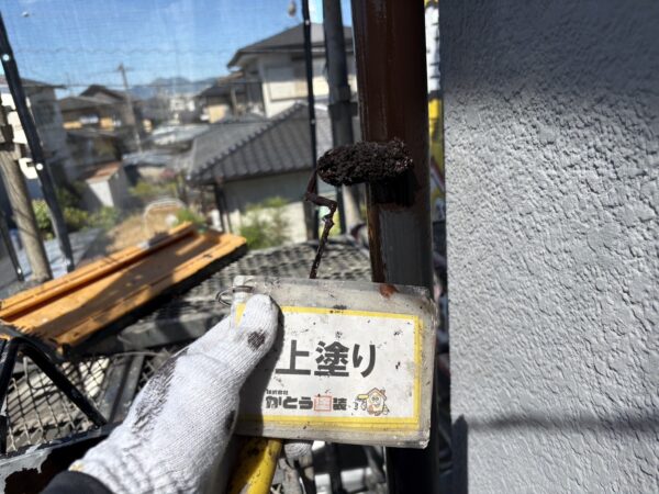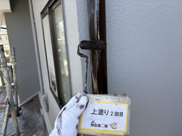 縦樋上塗り2回目の施工状況です。塗膜をつけていきます。