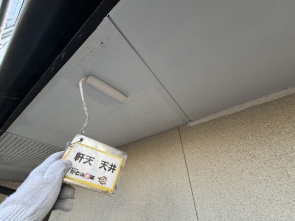 軒天に外壁の塗料が付着していたので、手直しをおこないました。