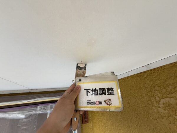 軒天や外壁に剥がれが見受けられましたので、下地調整をおこないます。