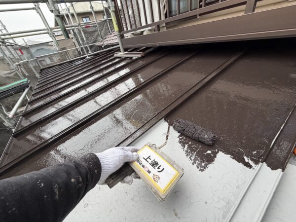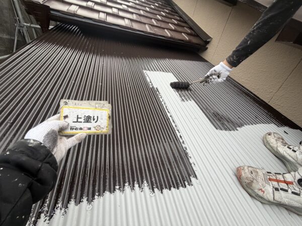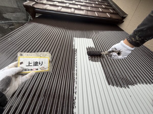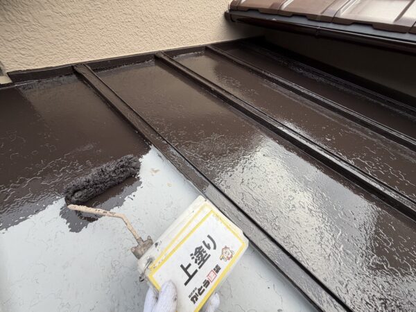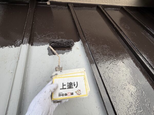 金属屋根の上塗りの様子です。