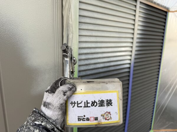 戸袋のケレン、サビ止め塗装、上塗りの様子です。