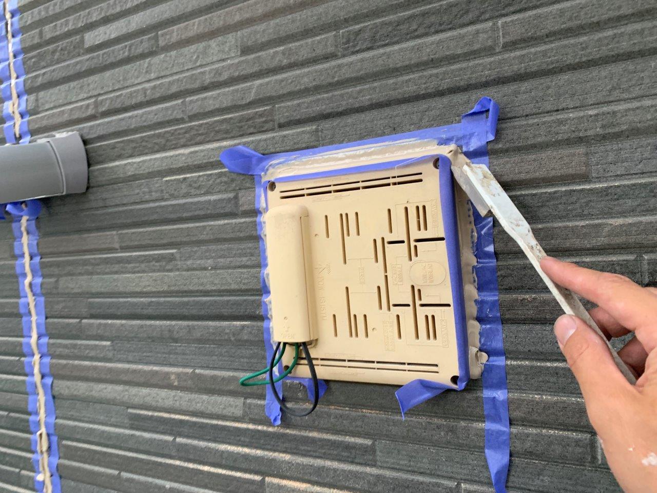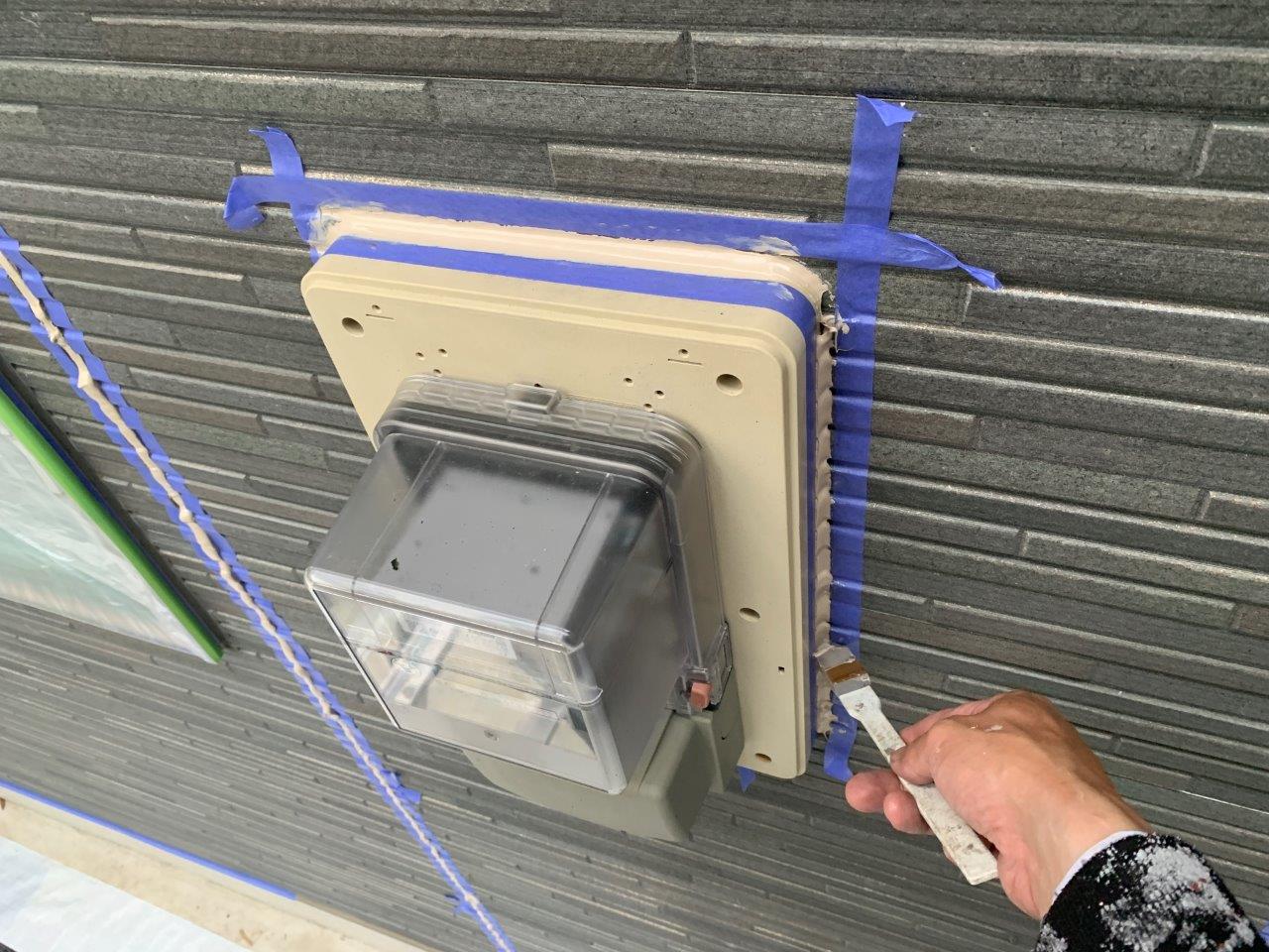 電気メーター回りもこの際うちました。中はサイディングボードに穴があいているので雨水が入水するのを防ぐためです。