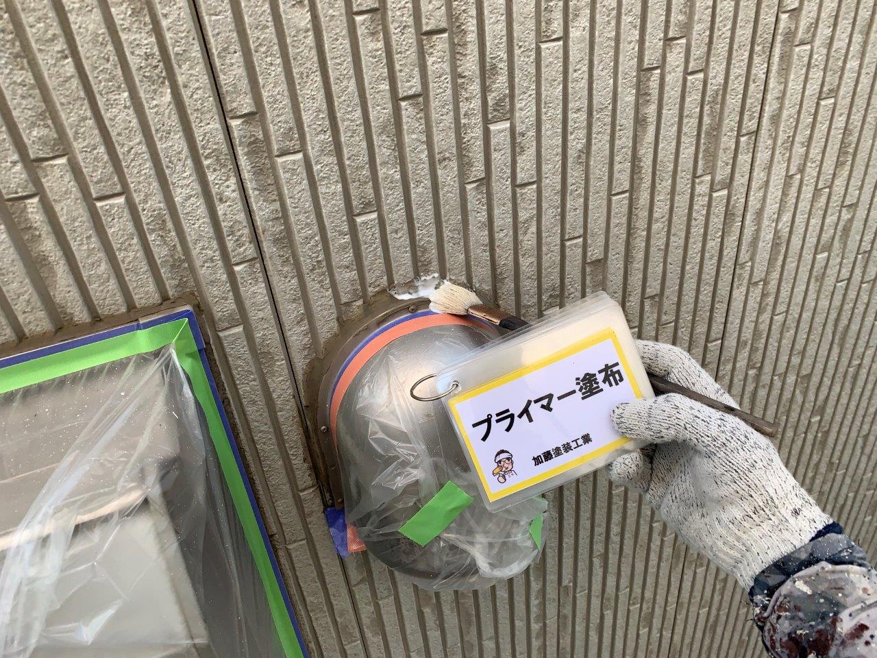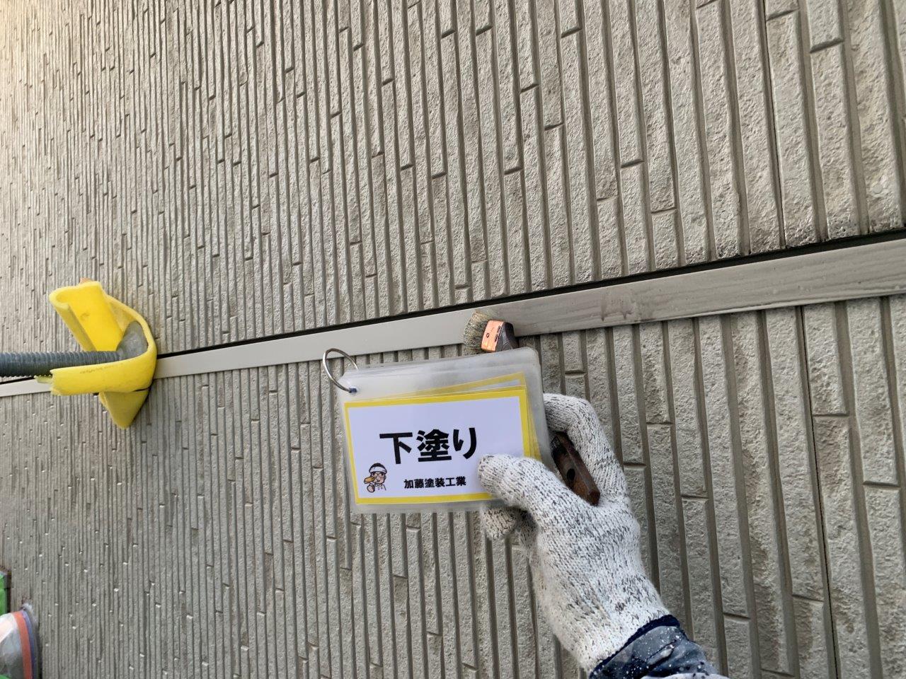 難付着サイディングボード 下塗り状況です。WB工法で施工します。ので5回塗り仕上げとなっております。