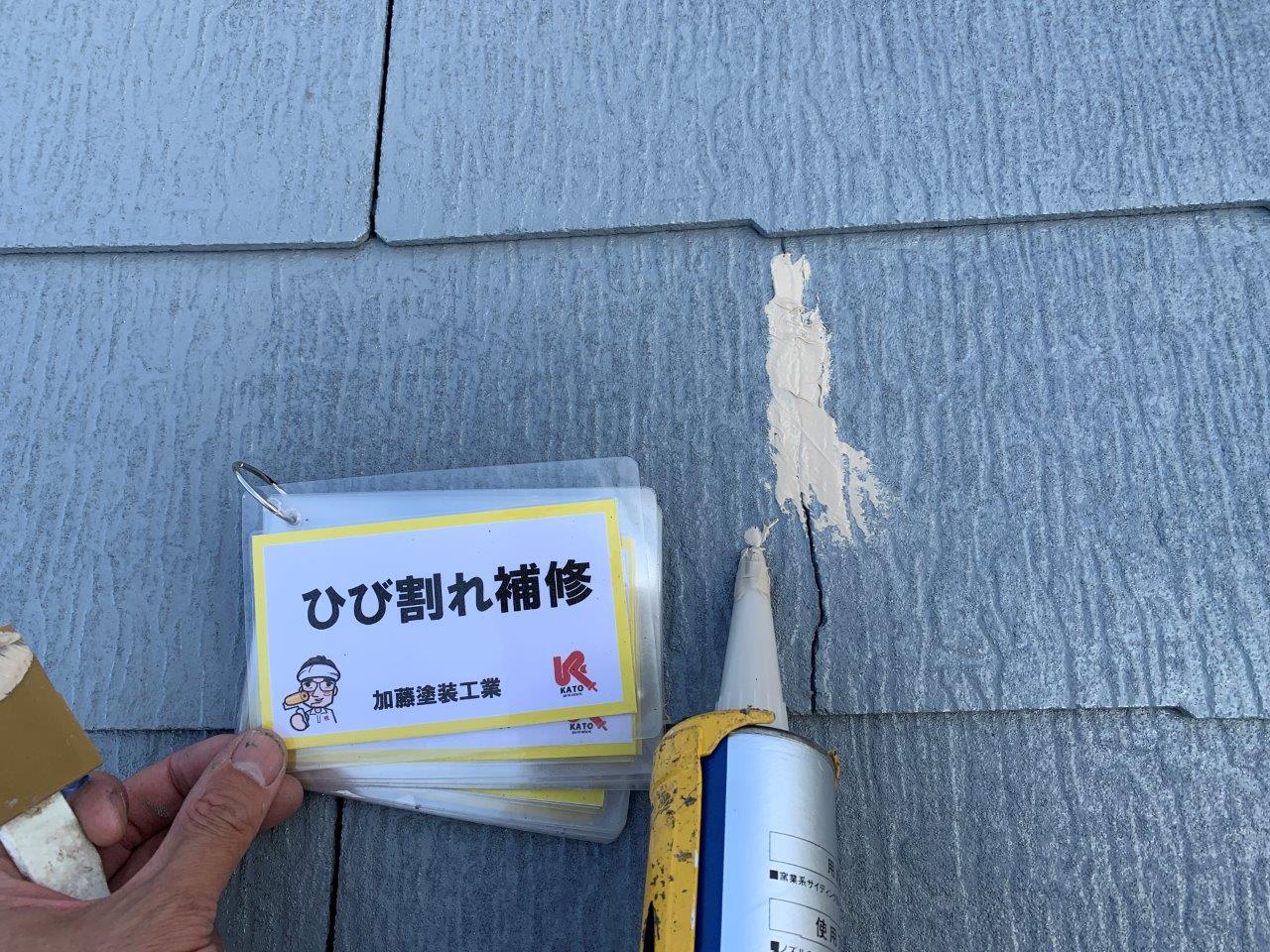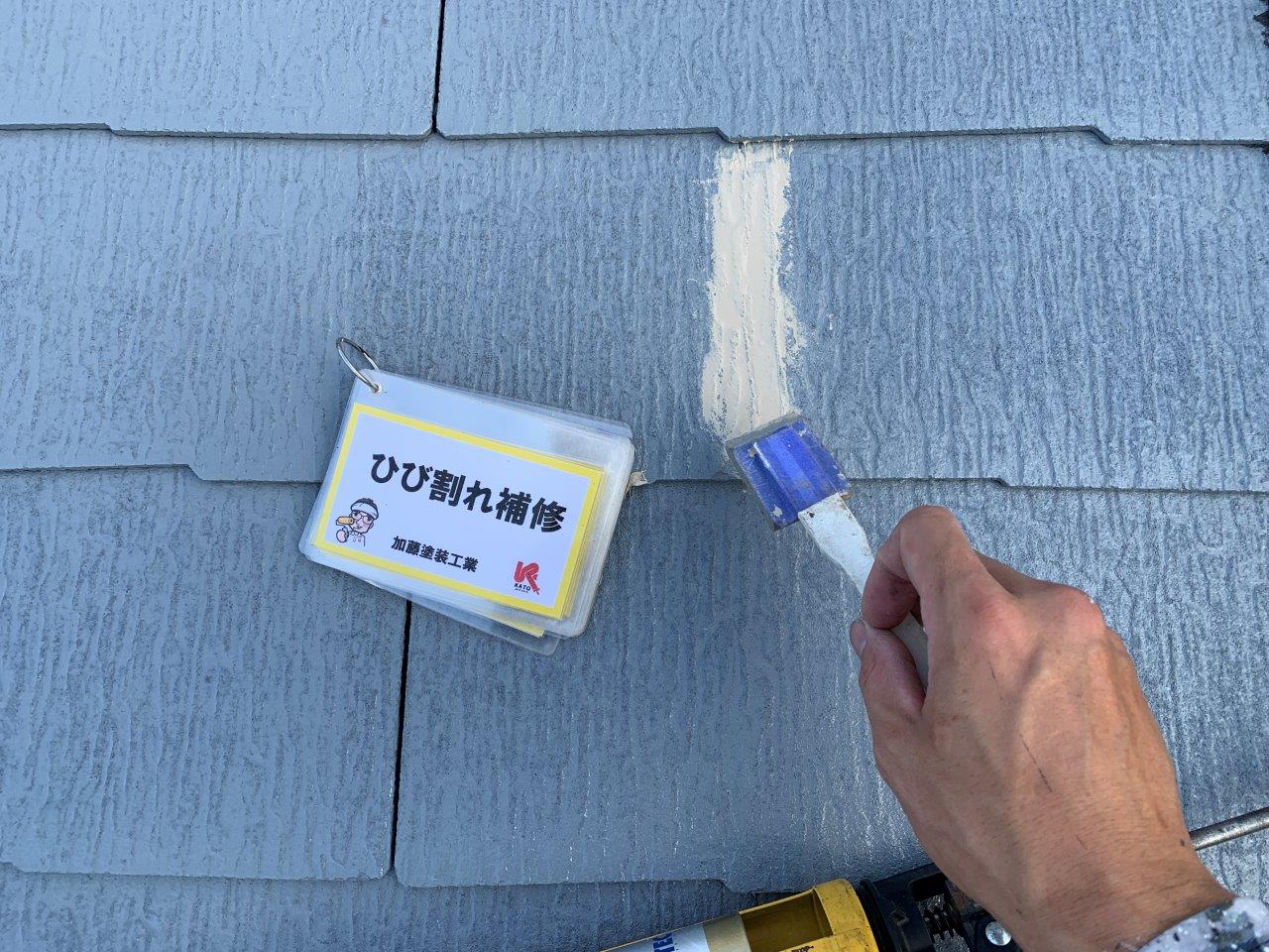 下塗りいったあとに下地調整をします、屋根のひび割れ補修になります、
