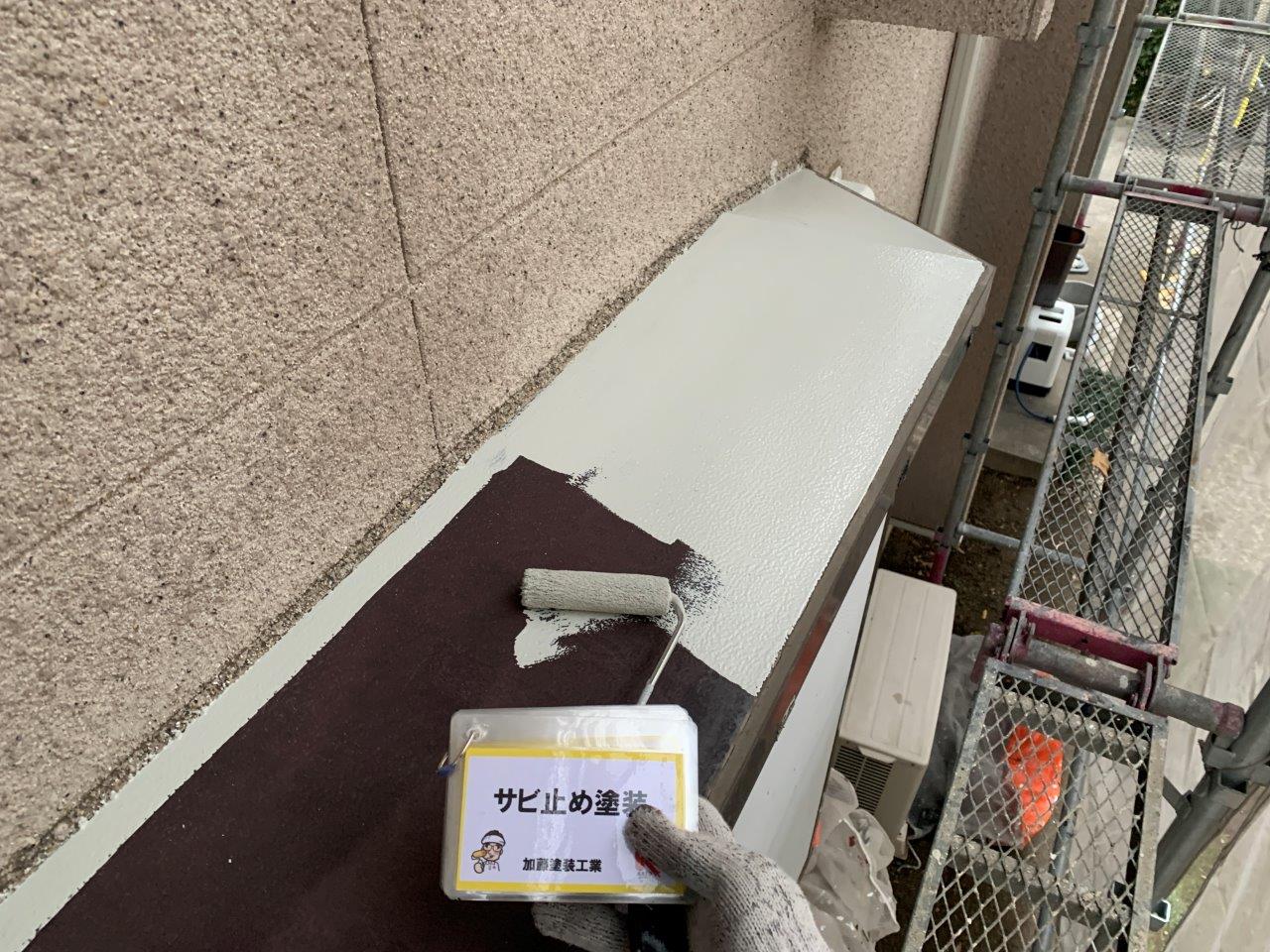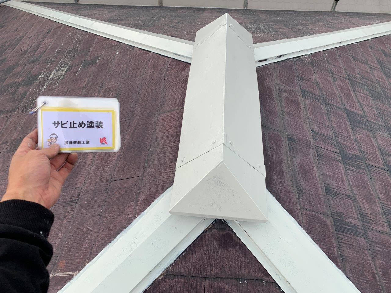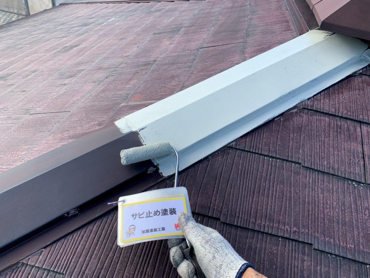 サビ止め塗装状況です。 屋根は鉄部が存在していますので屋根の下塗りは浸透性系のシーラーなので鉄部は塗装が厳しいので先に塗装しときます。
