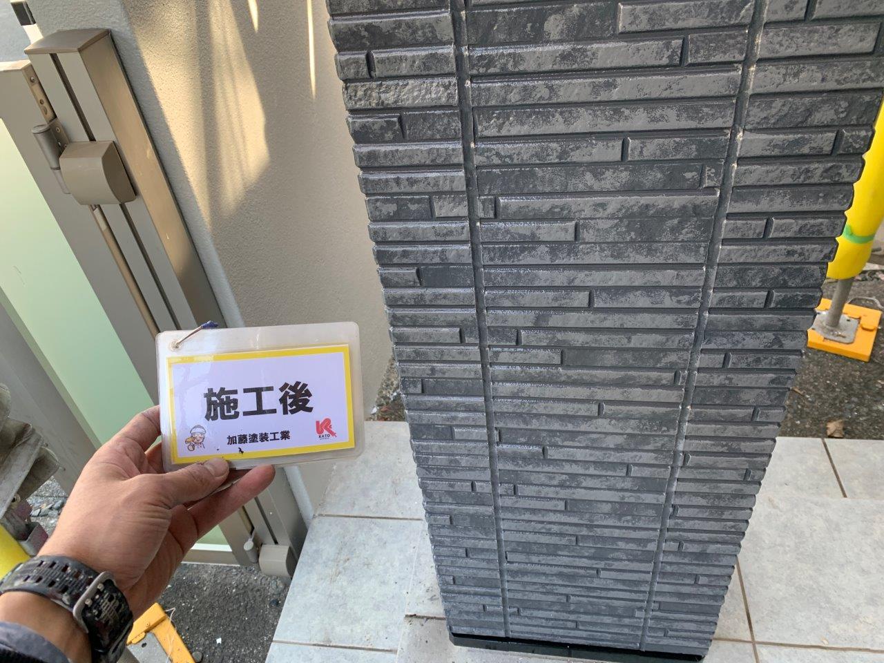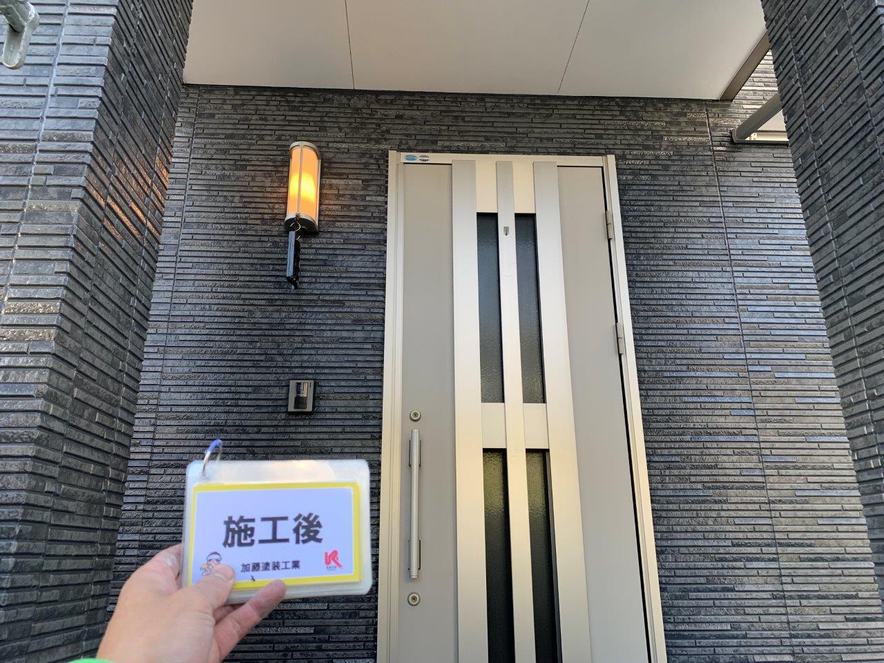 玄関回りは非常にイイ感じです。ご近所さんの評判もいいとのことです。単色仕上げよりも高級感ただよう仕上がりとなっています。張替えたんじゃなくて塗装でこのようになります。