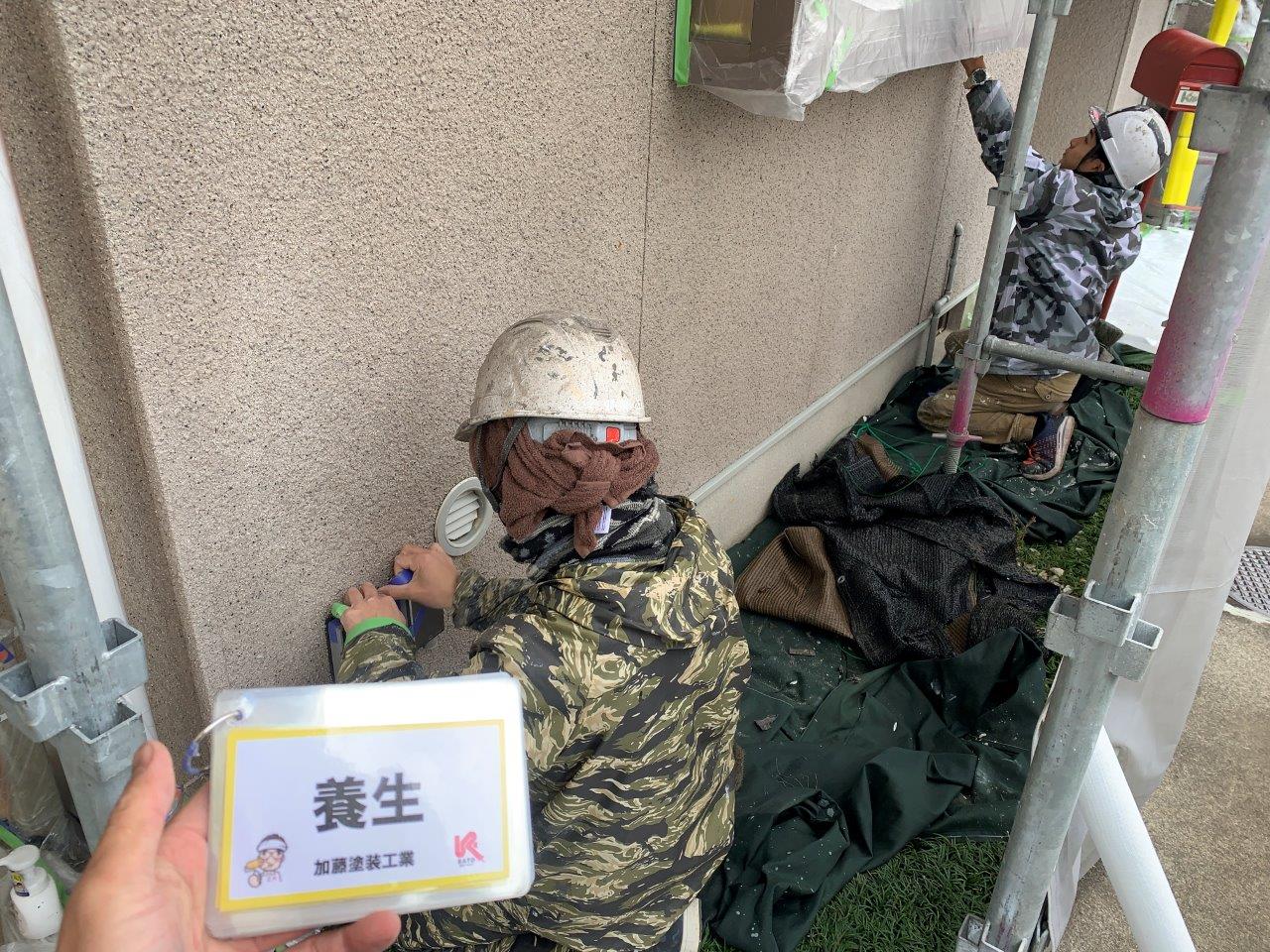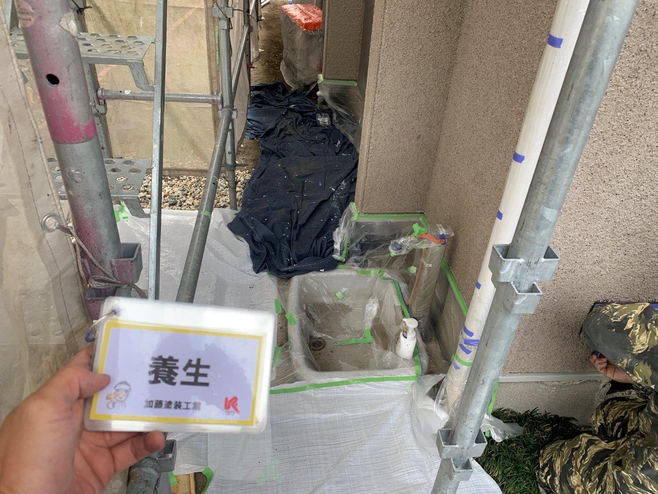 熊本市東区 御領 外壁塗装工事 養生 軒天塗装 外壁下塗りをおこないました。
