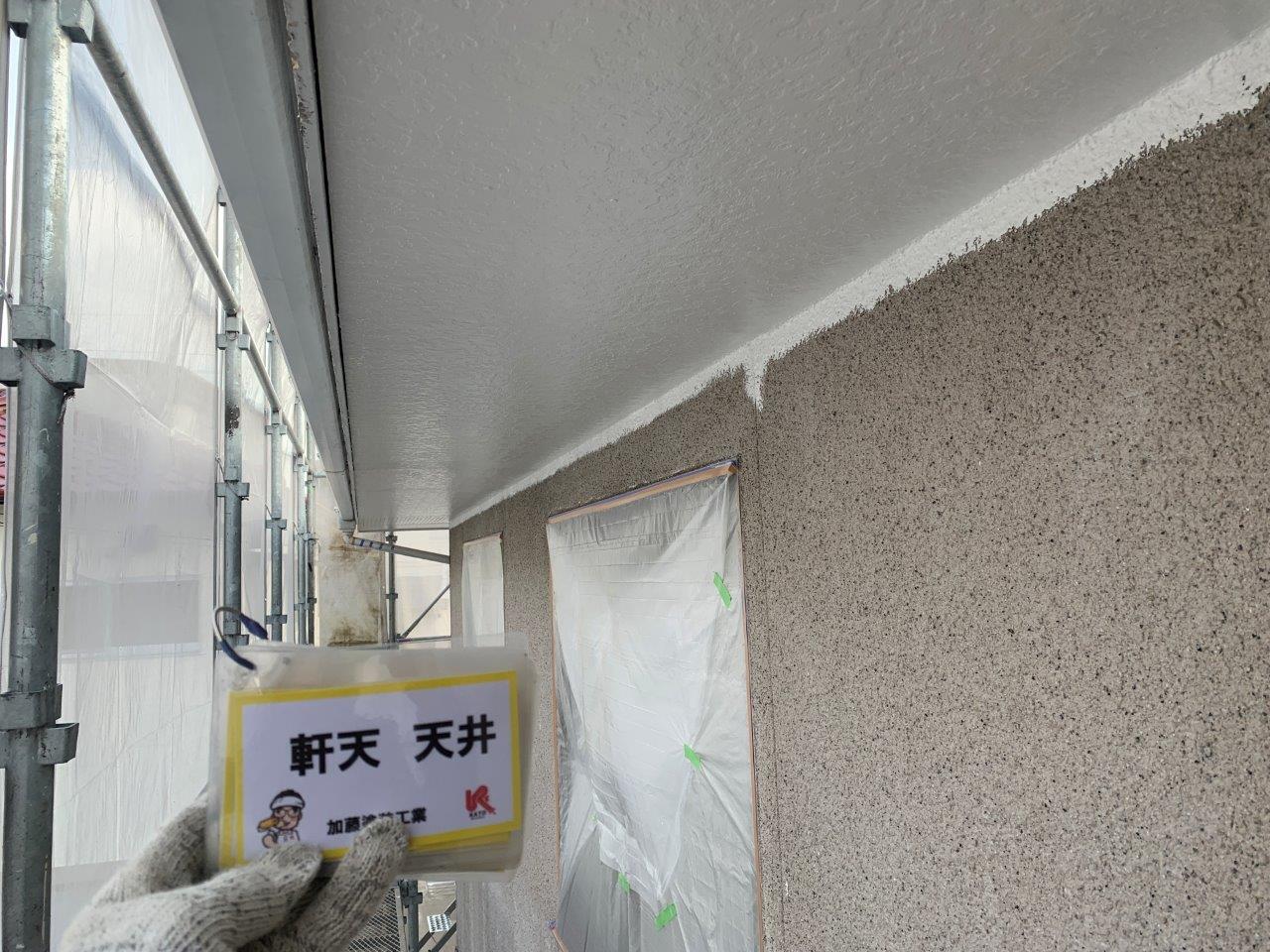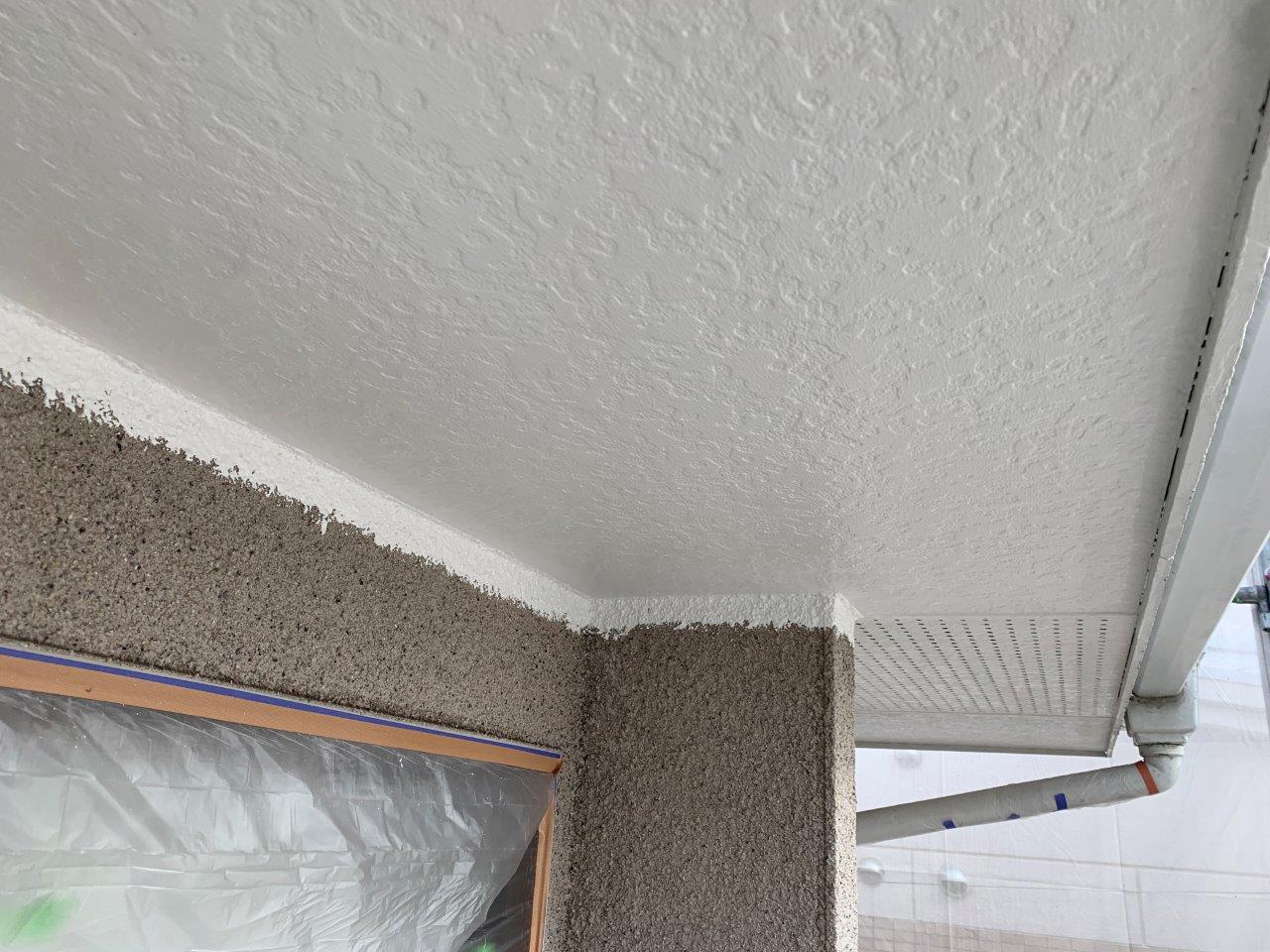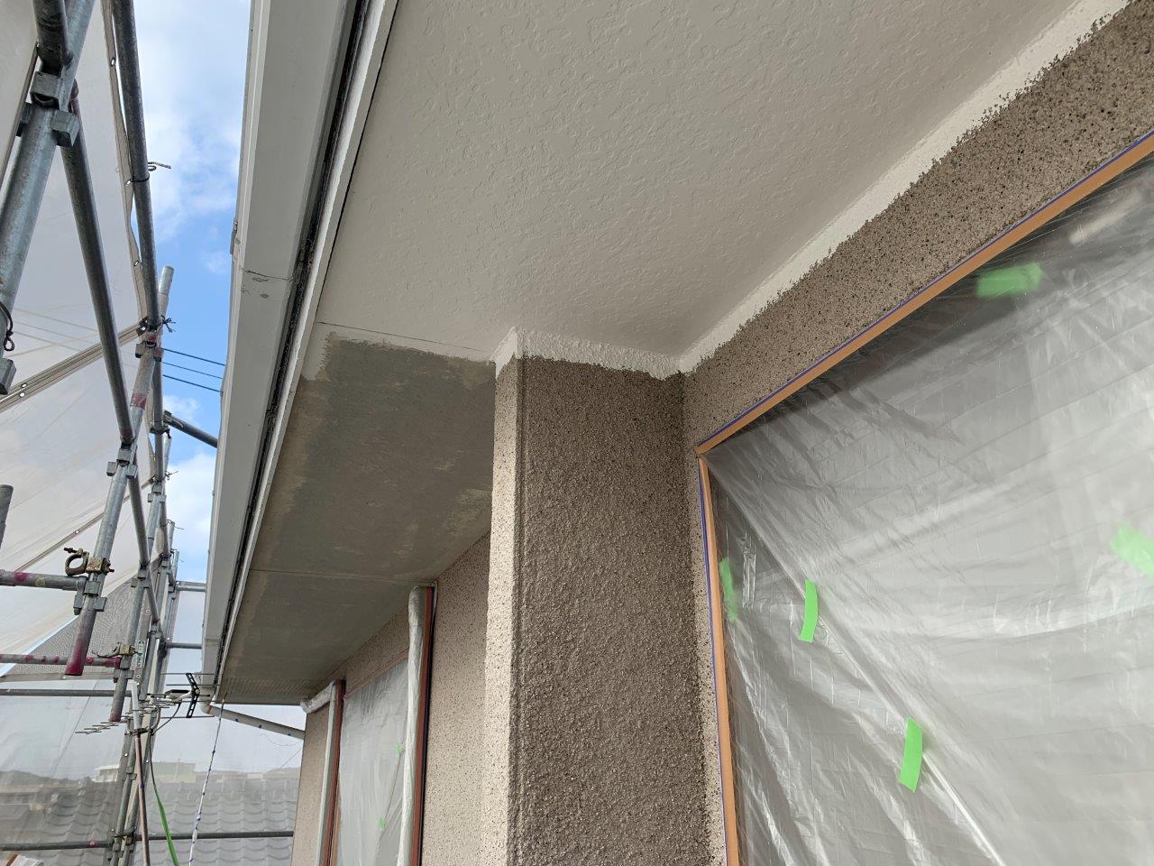 軒天塗装状況です。しっかりとケレンして高圧洗浄をかけておりますので剥離する箇所はありません。下地を調整が大変でしたけど丁寧に作業していきます。