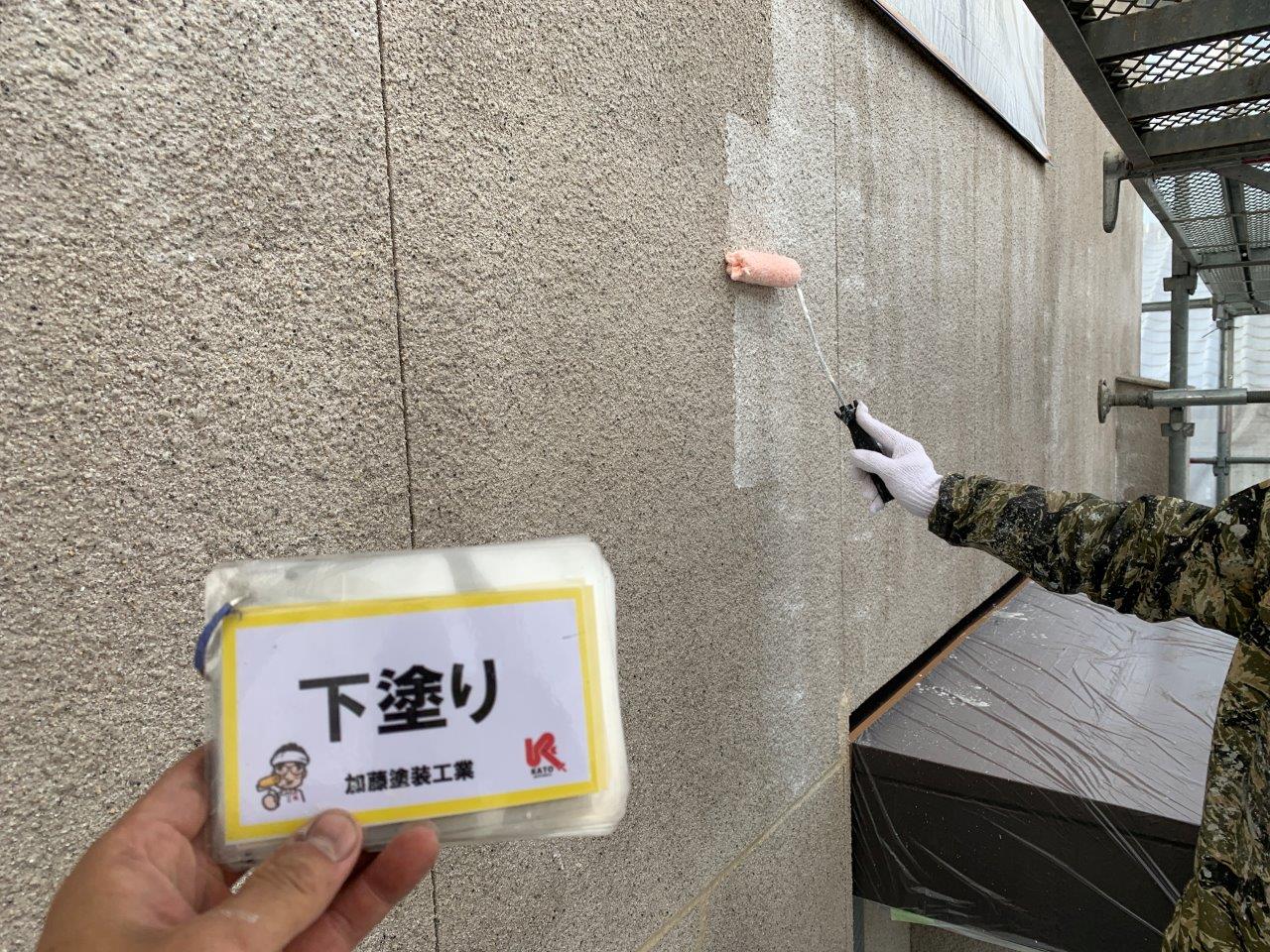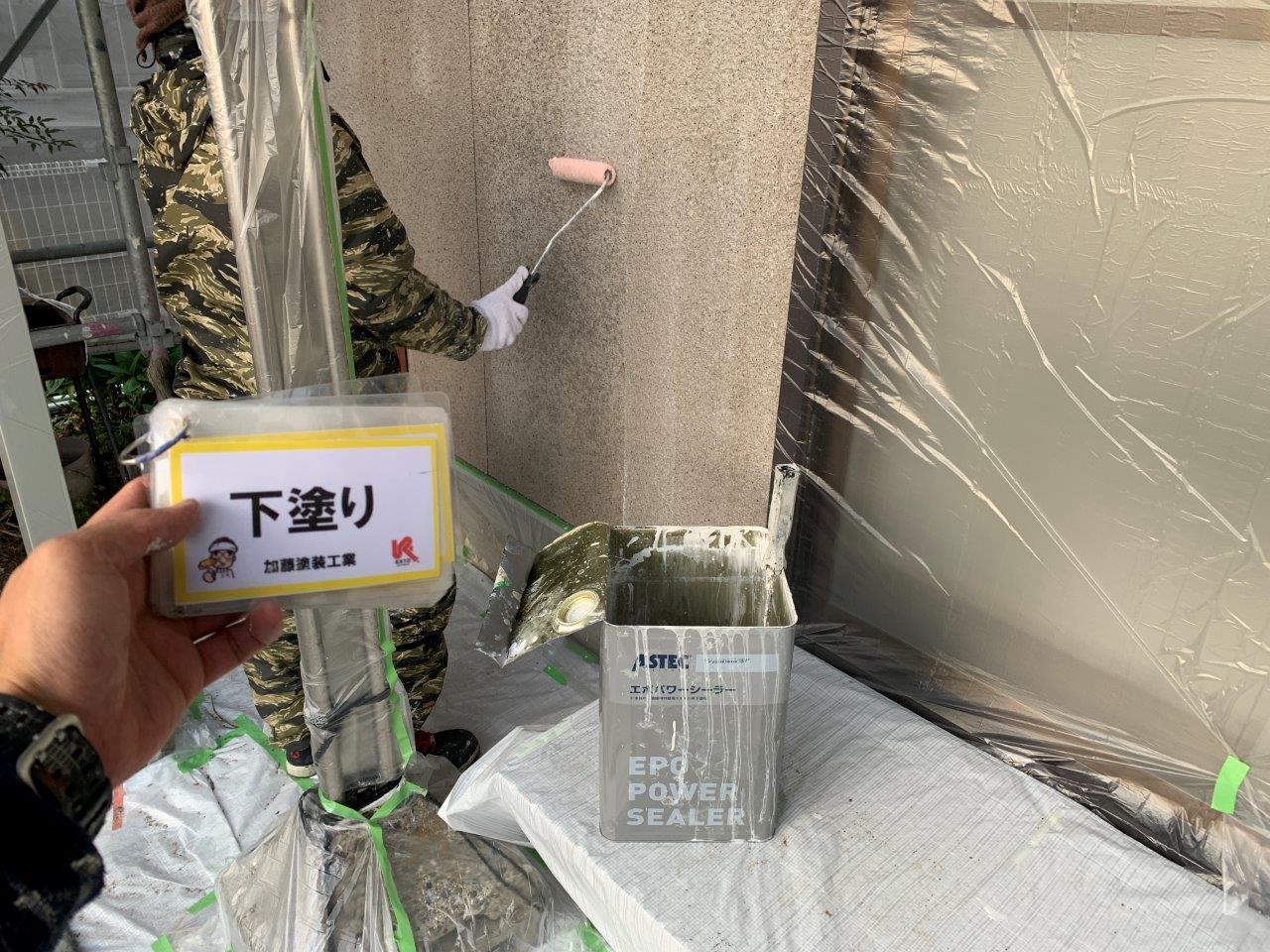 下塗り状況です。浸透性系の下塗り材を使って外壁に染み込ませていきます。ザラザラしているので下地を固める働きがあります。
