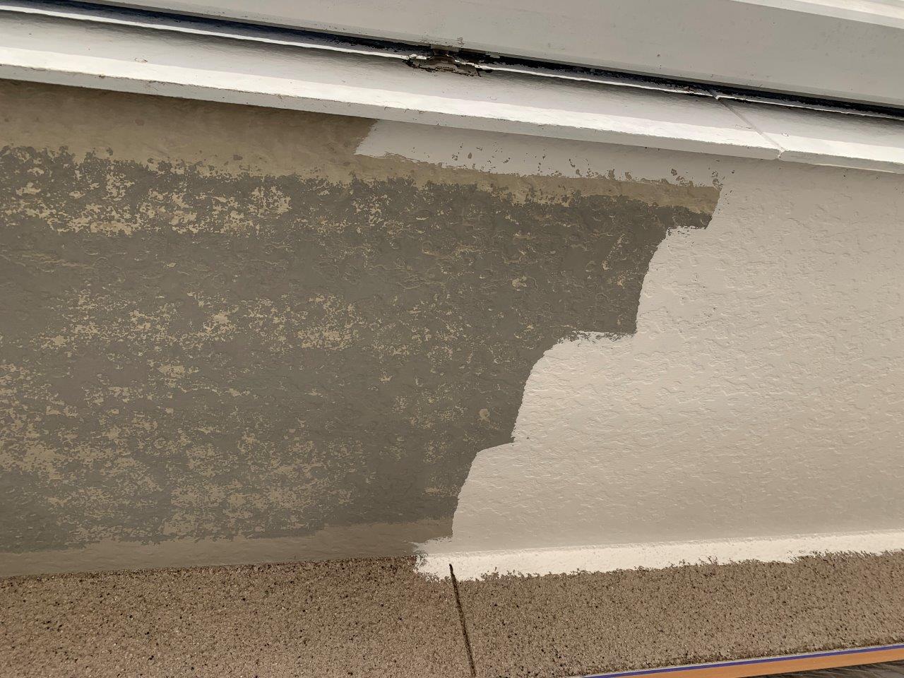 バルコニーの金属壁はストーンが吹き付けられていました。下地が金属だと相性が悪いので後からこのように剝がれてしまいます。ケレンしてミッチャクロンを塗布します。