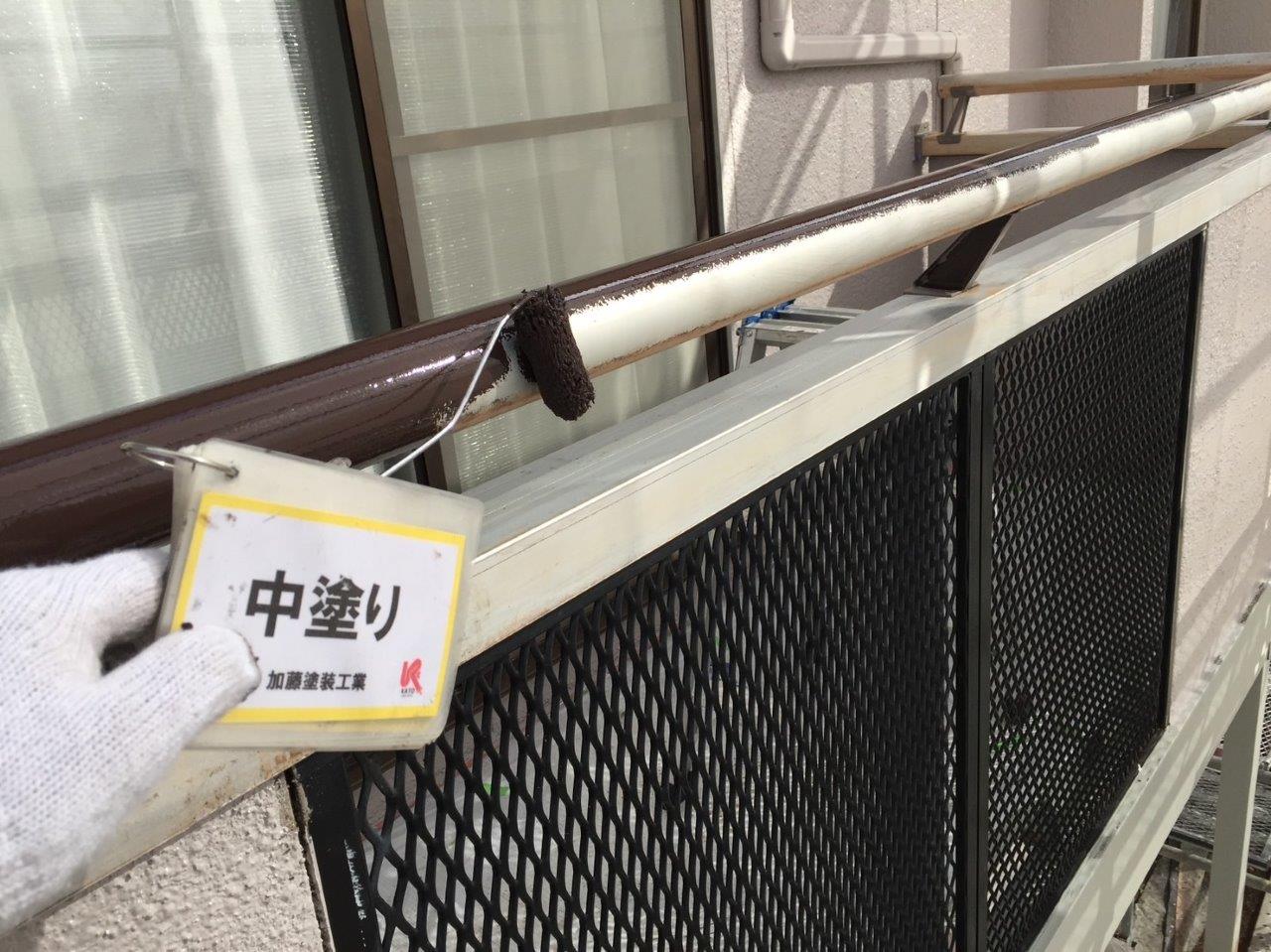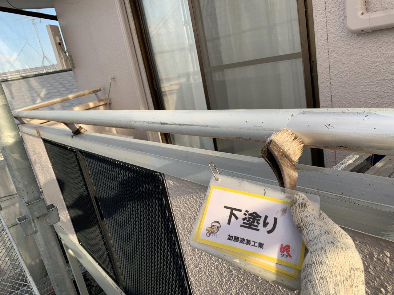笠木部分も塗装いたします。アルミで塗装は必要ない箇所になりますけど色褪せや汚れが付着していたためです。ケレンをして下塗りをいれます。
