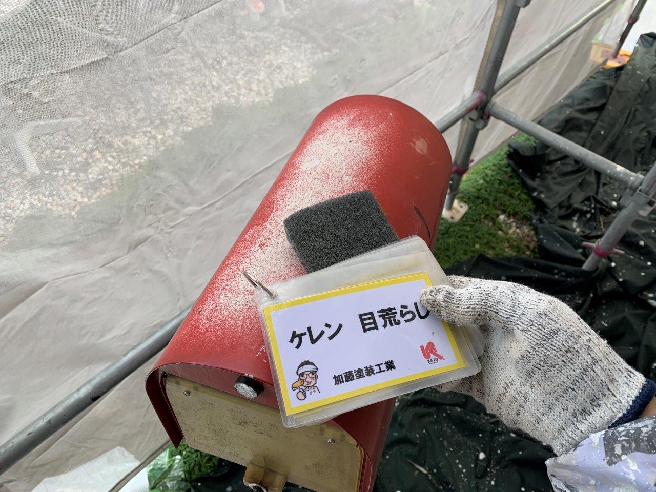 ポストを塗装します。ケレン状況です。天板部分が褪色などで白くなっています。