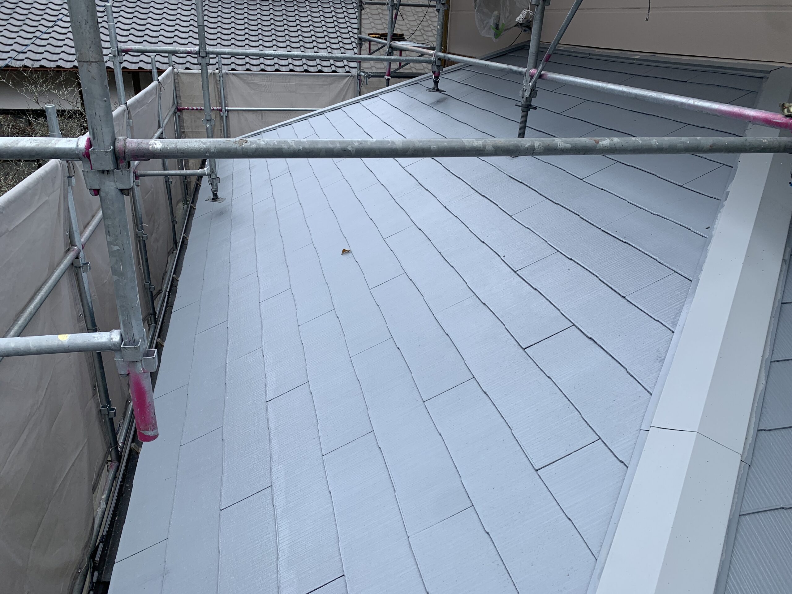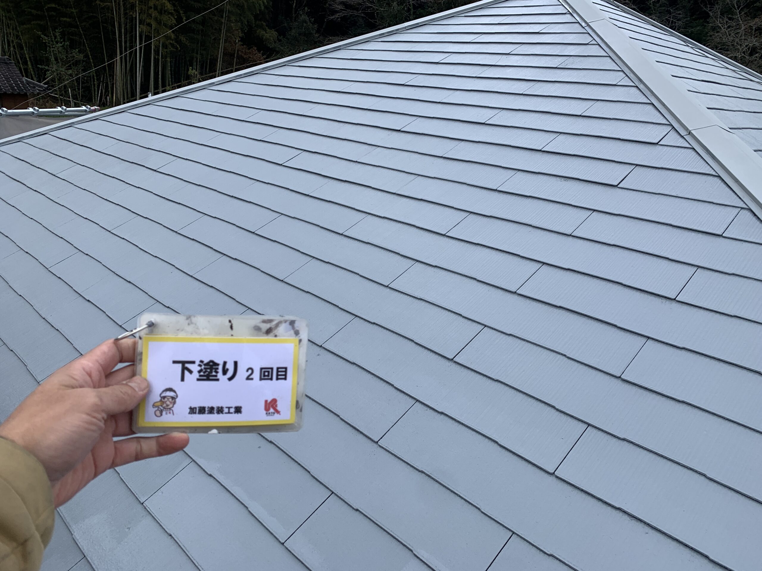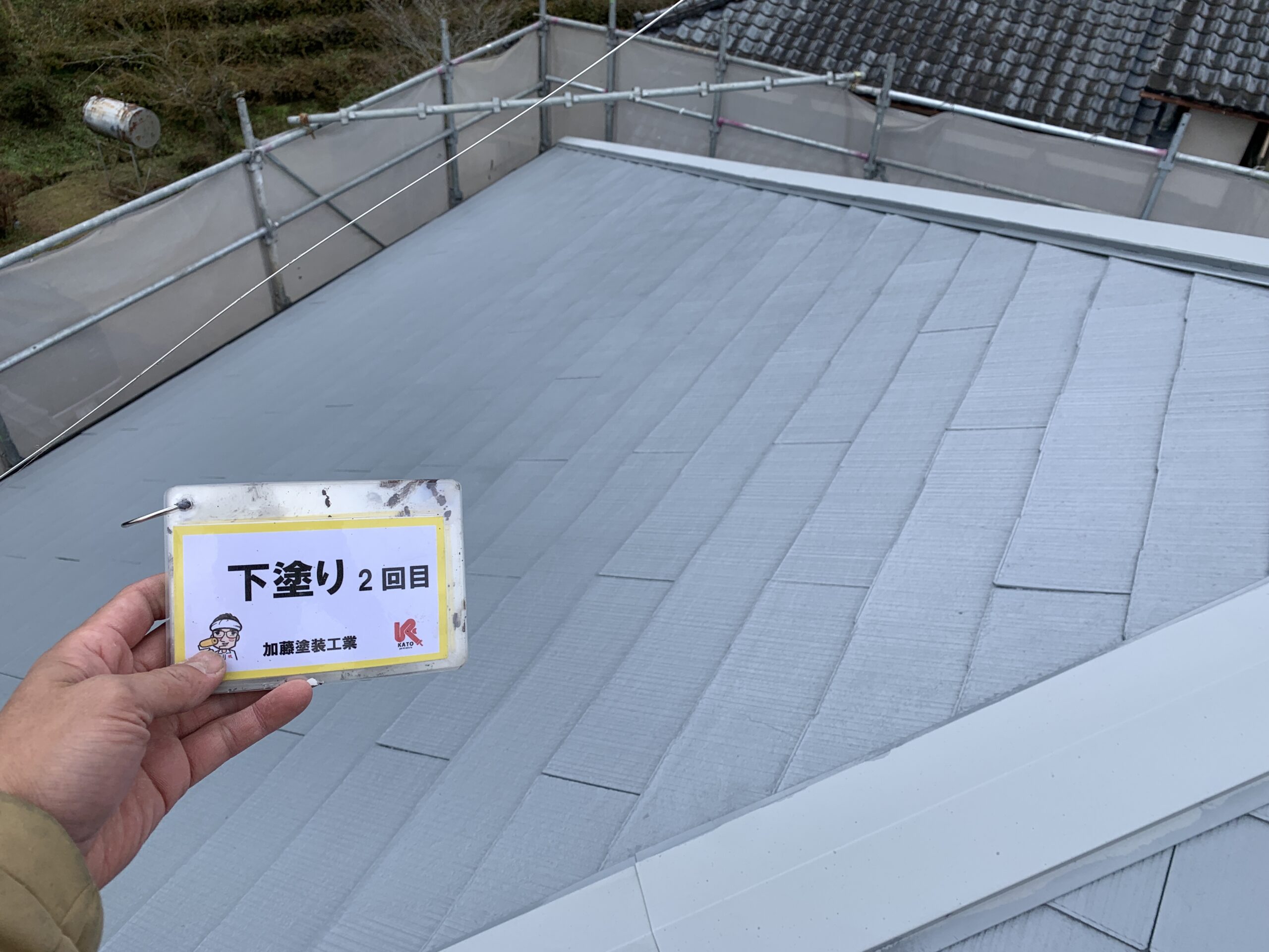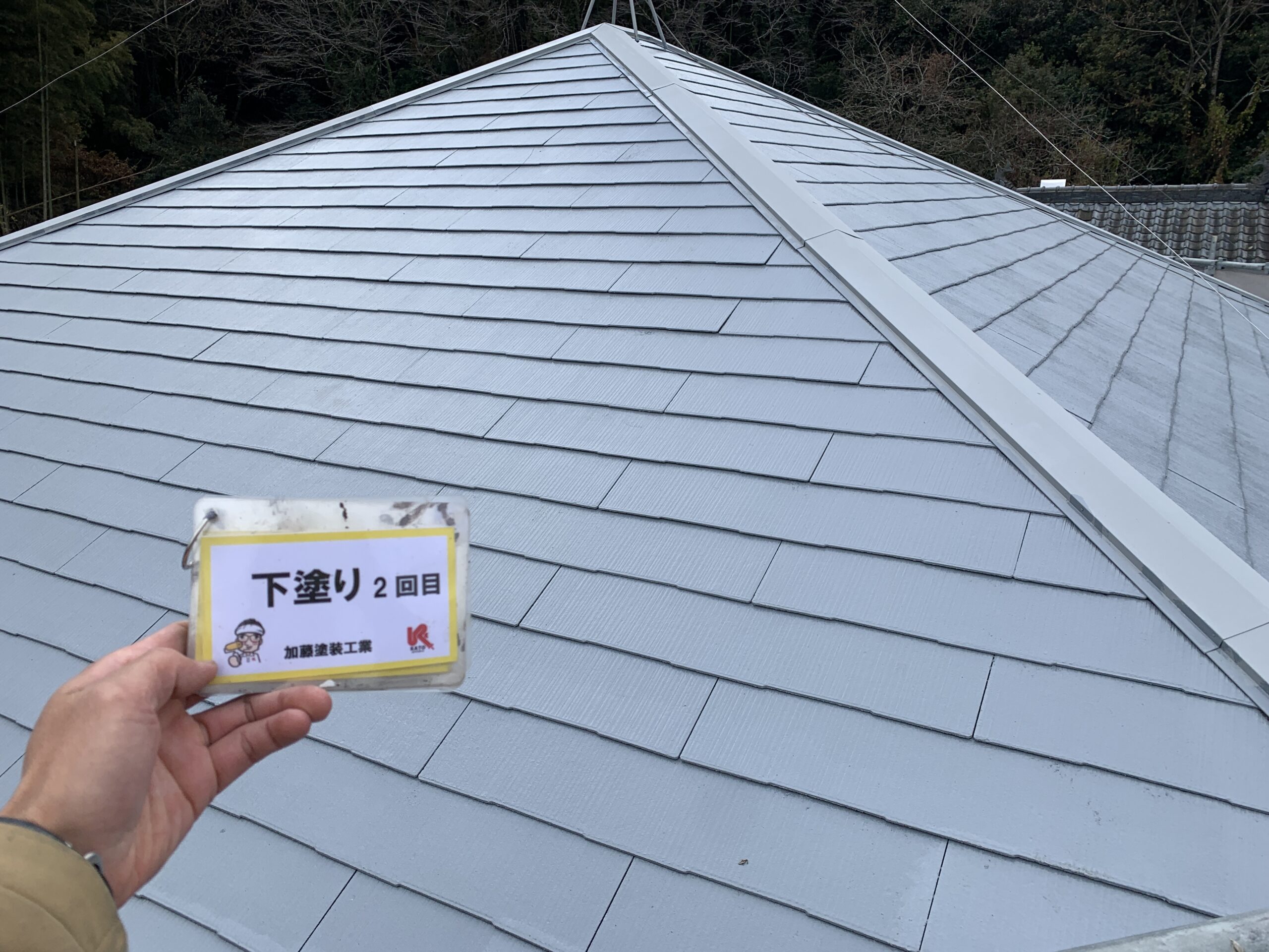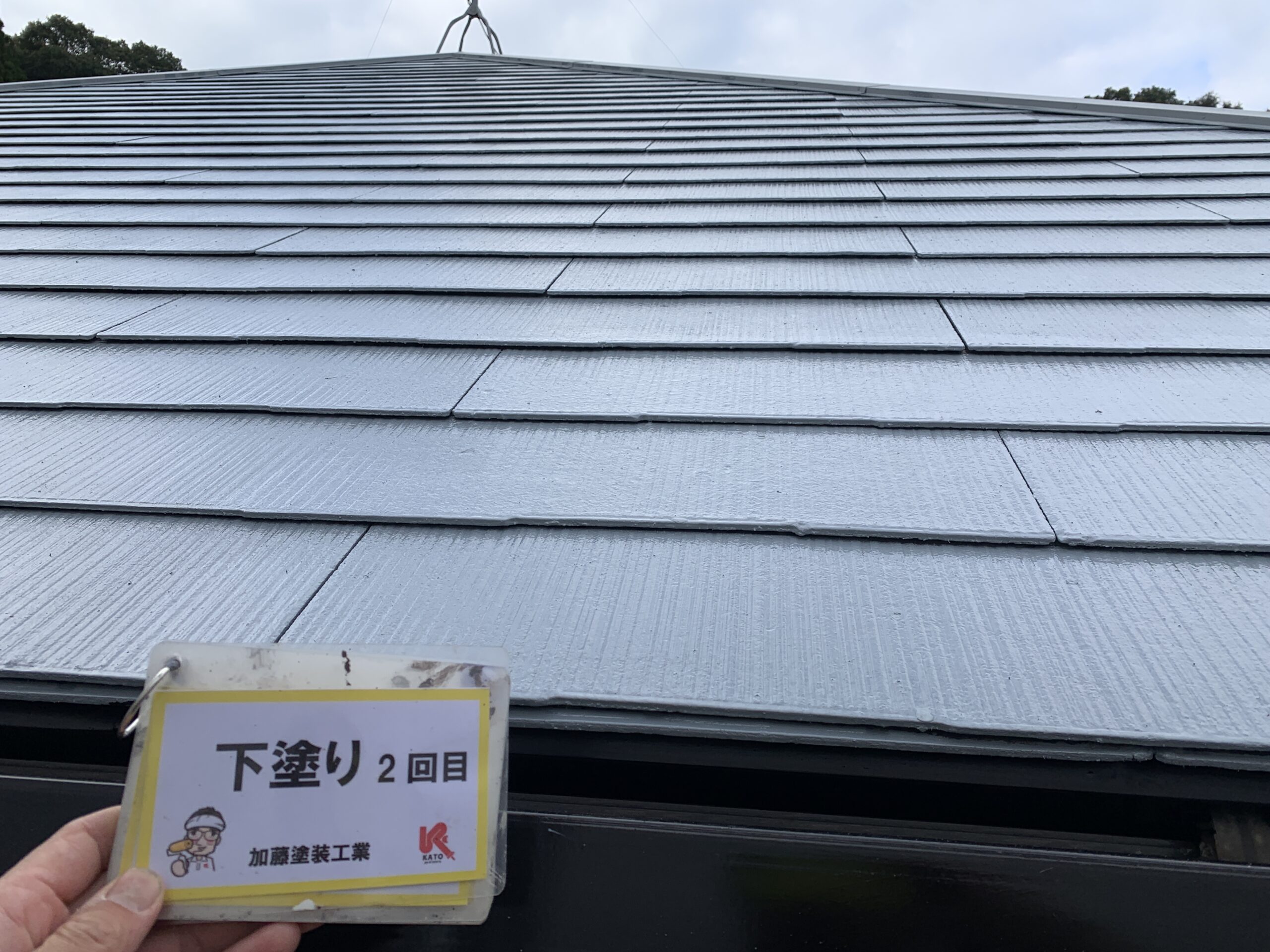 屋根下塗り2回目完了しました。下地の吸い込みが止まりました。普通はどこの施工店も下塗りは1回です。