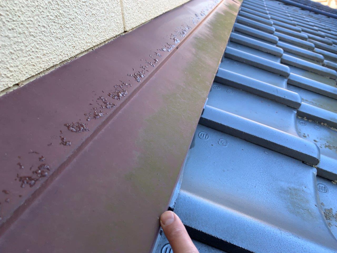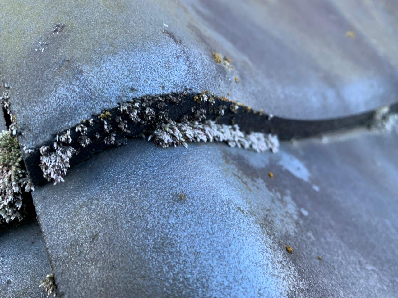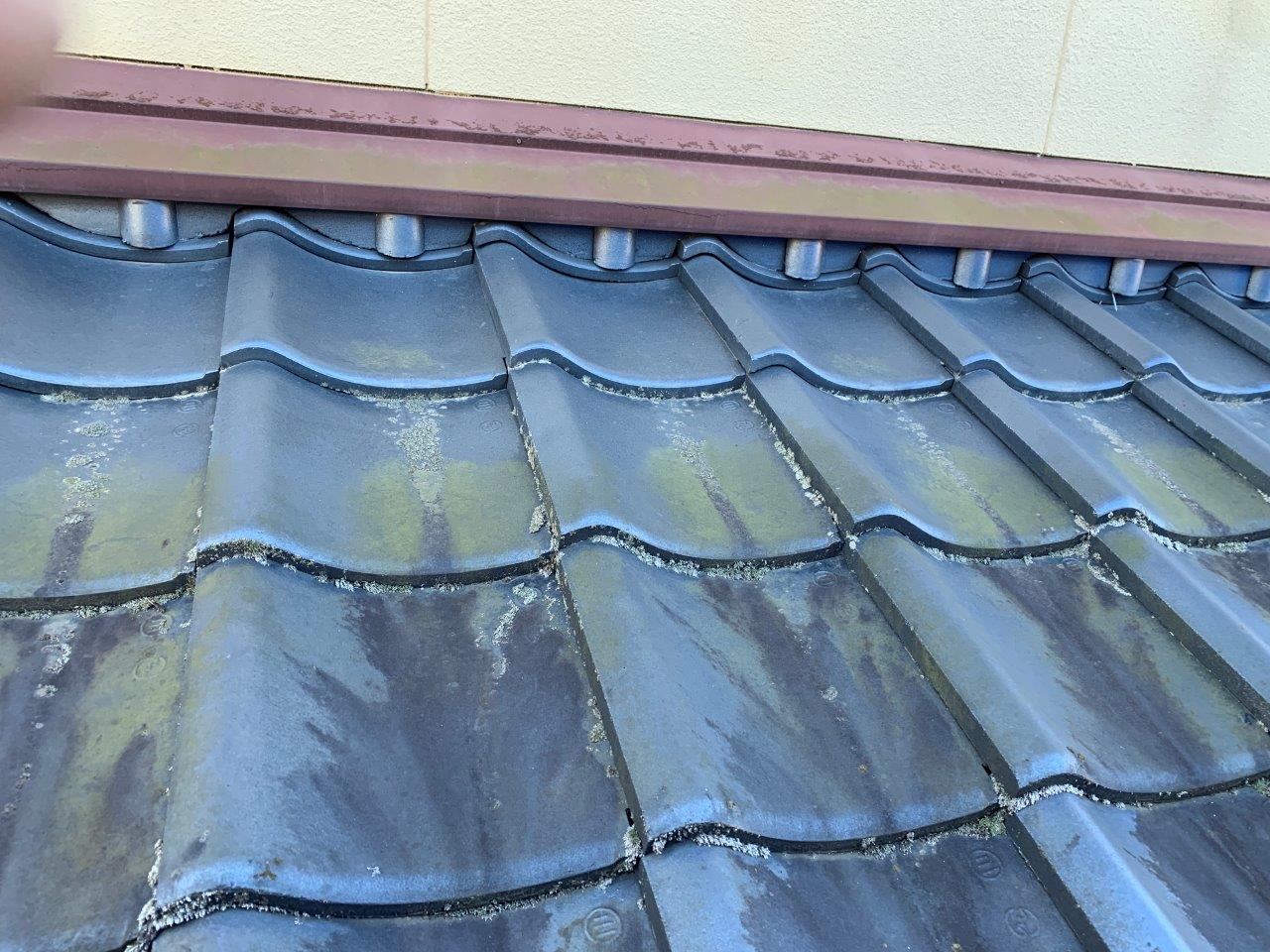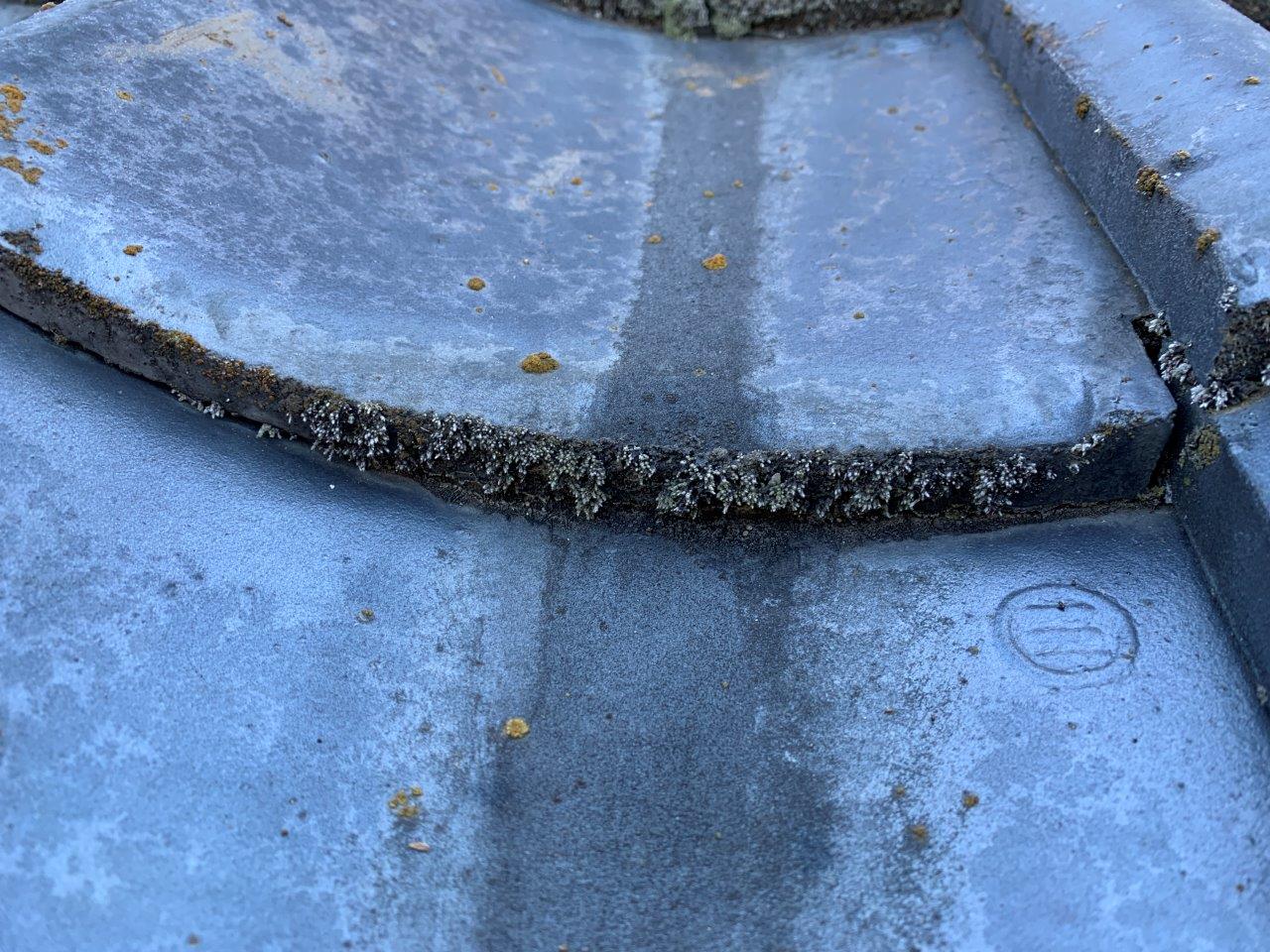 瓦の重なり目にコケや藻が発生しています。前回塗替えでは塗装が乗っていないのでこのようになります。屋根瓦の吹付は技術がいります。手首をかえさないで吹付つけるとか面でしかやらないとか。なんとでもできますよね。お客様は塗装会社はどこも一緒と思われていますが違います。ここの部分を洗浄すらしない所もあるぐらいですから。こんなに汚れてコケがついているのにですよ、信じられないかもしれないですけどこれが現実なんですね。弊社では写真、動画をとりますので、きちっと証拠を残して施工しますのでご安心ください。必要ならばいっしょに屋根に上がっても大丈夫です。