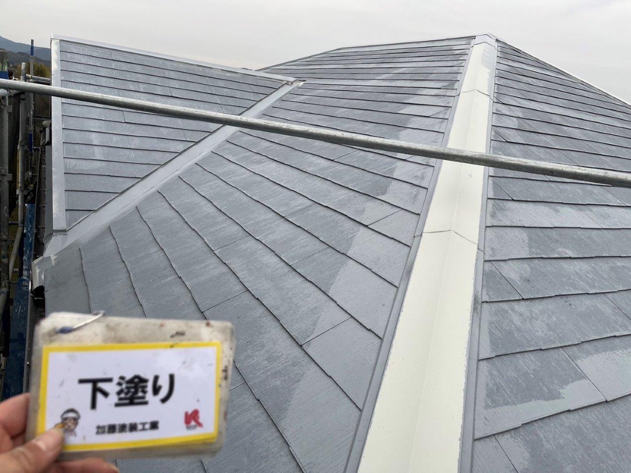 屋根の下塗り状況です。高圧洗浄後はこのように下地が真っ白になります。アスベスト入りの素材なので強度がありますが、今のスレート屋根だとこうはなりません。