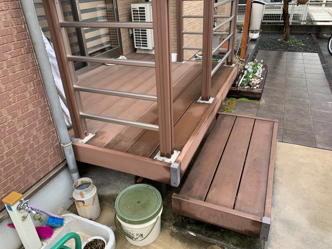人工木の施工前のお写真です。部分的に黒ずみがあります。