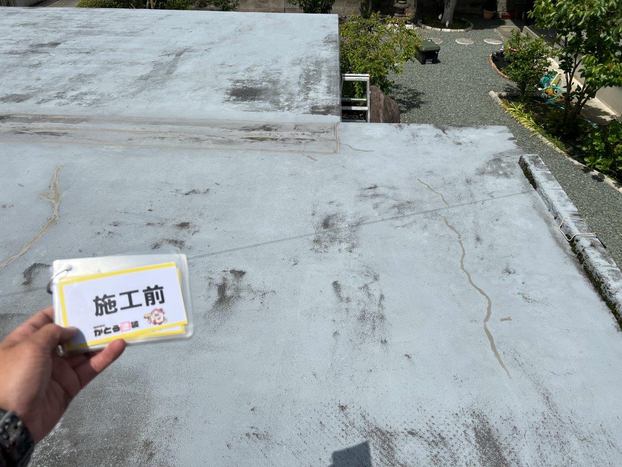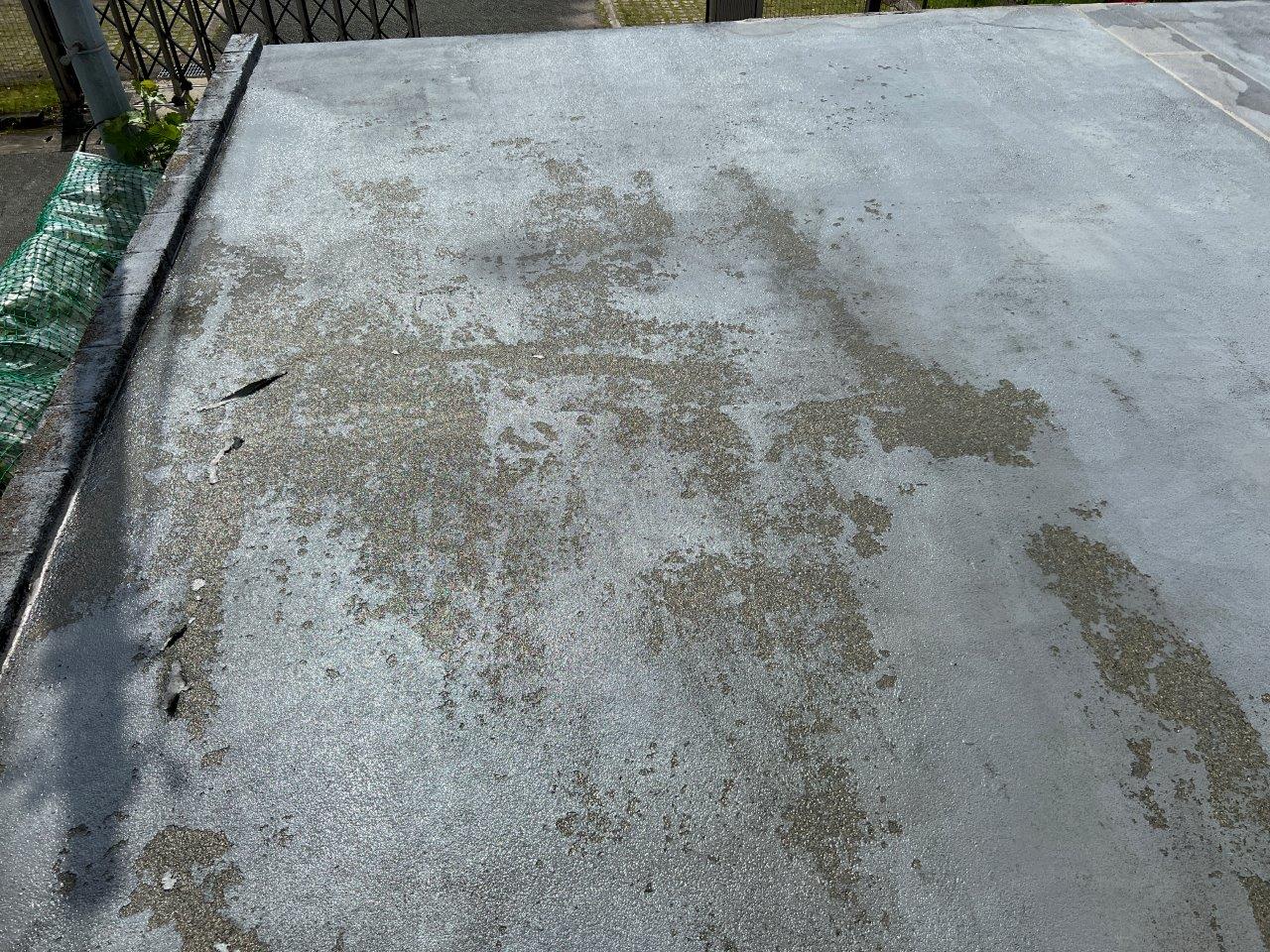 旧塗膜が剝がれきました。前回の塗装では防水塗装をしてなくて普通の外壁の塗料で塗装した形跡がありました。近くの業者さんにお願いしたとおっしゃっていましたけどおそらく塗装会社の職人が施工してないですね。