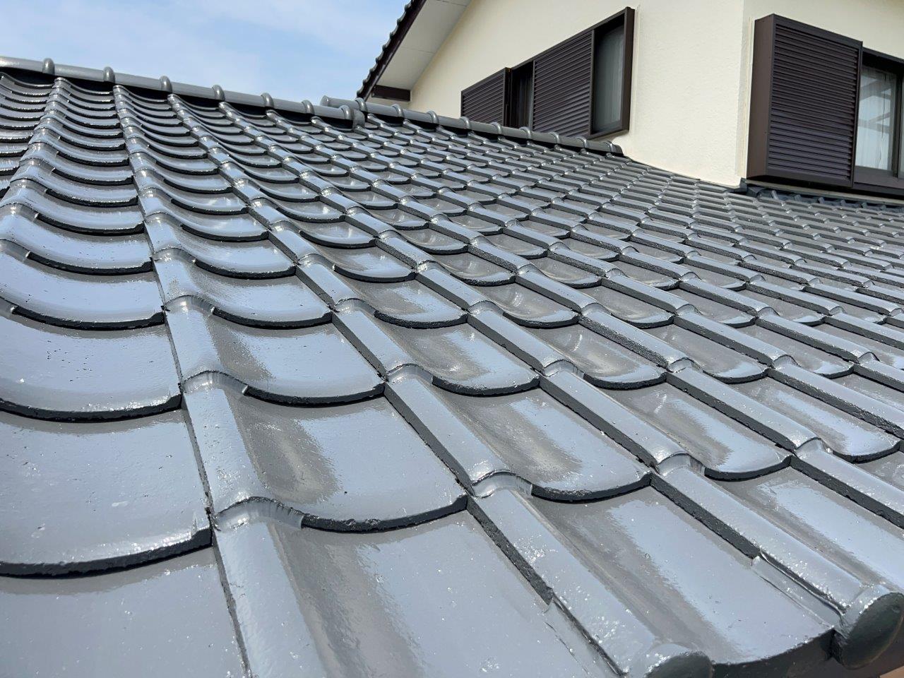 屋根瓦のアップのお写真です。最後のトップコートにクリアーを塗装してコーティングしています。
