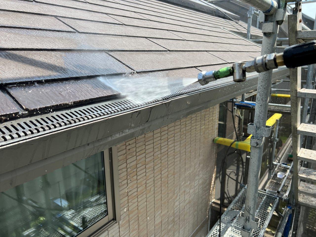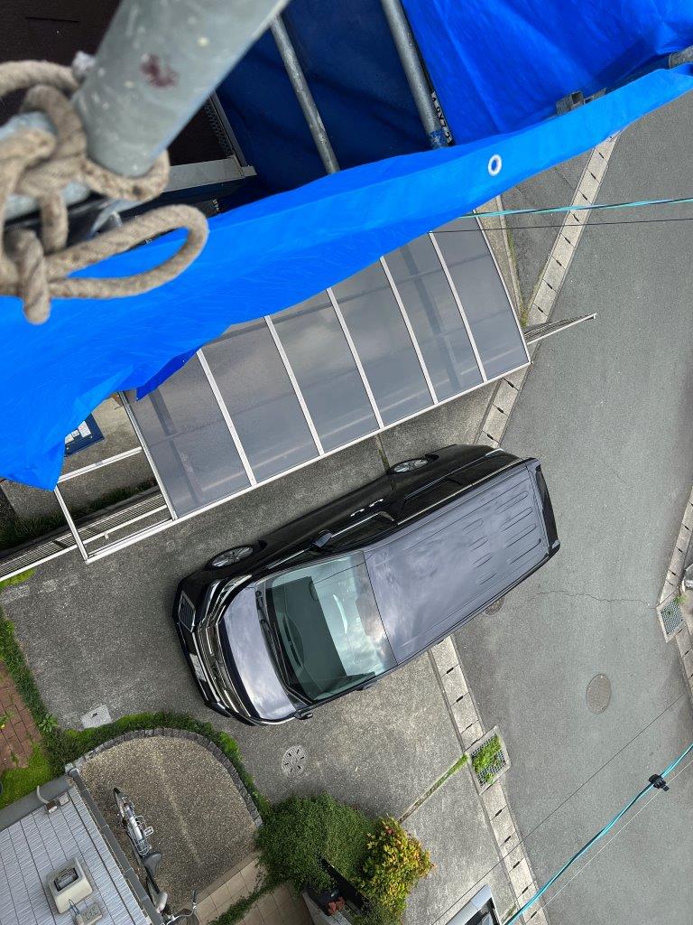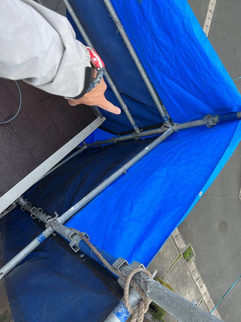 ブルーシートでメッシュシートの上から養生しました。洗浄するときに屋根の汚れなどが飛散しないためにします。