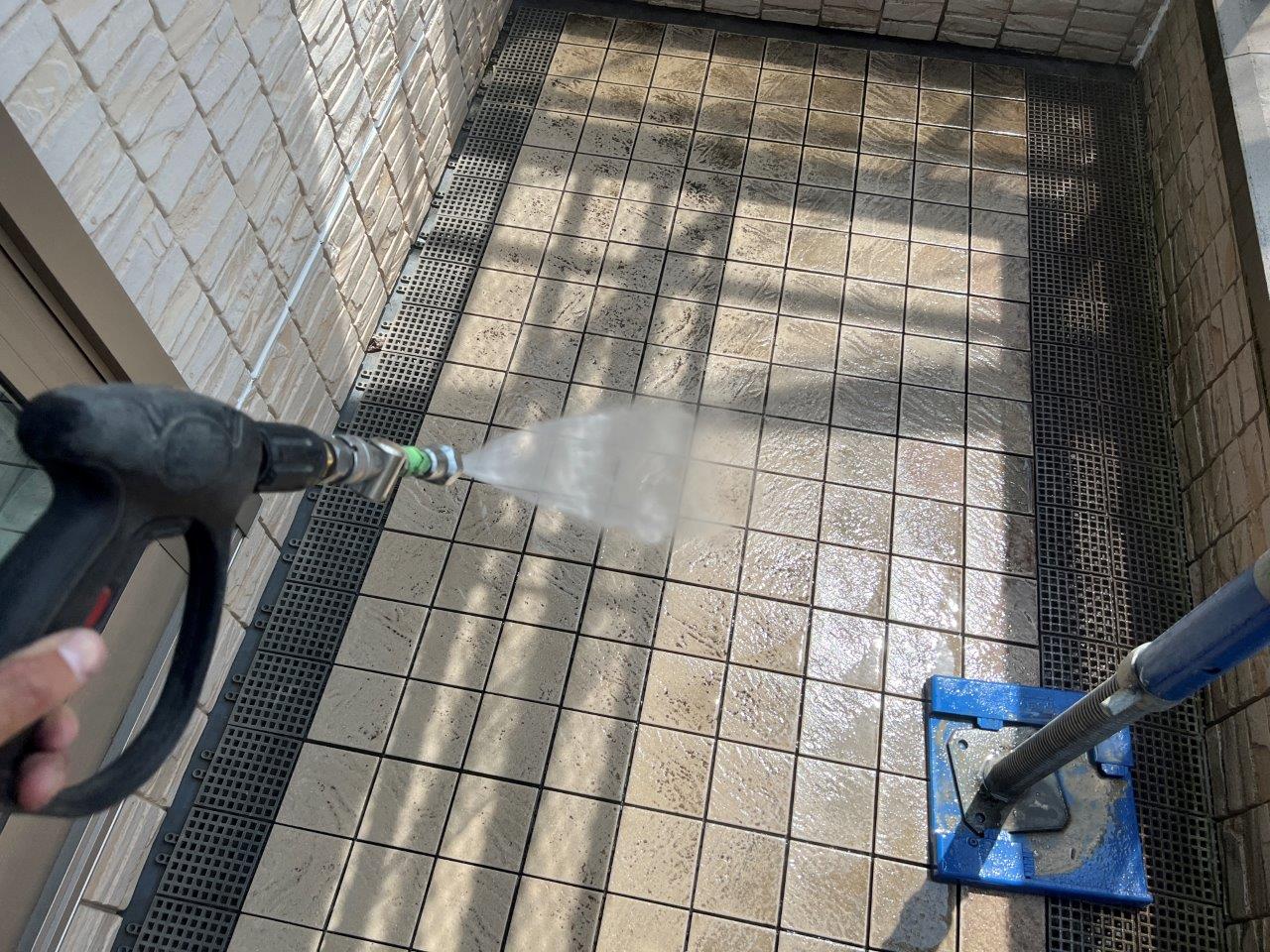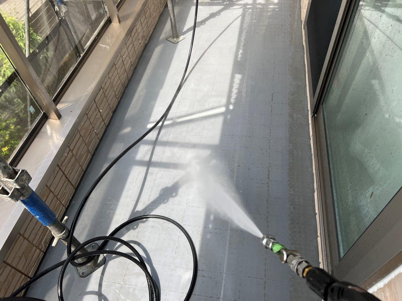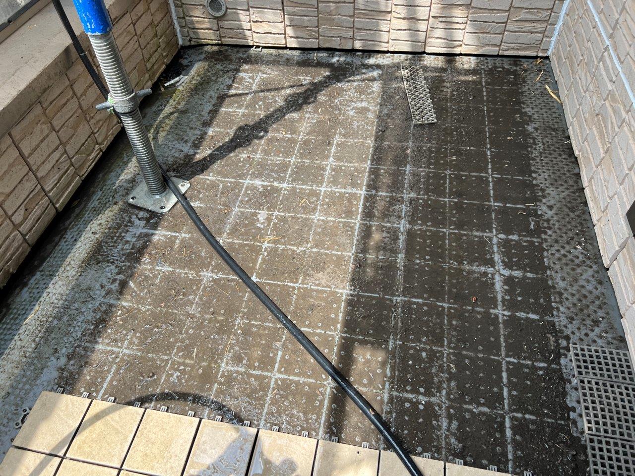 バルコニー内の防水塗装をするので洗浄をします。まずは敷物から洗浄をします。