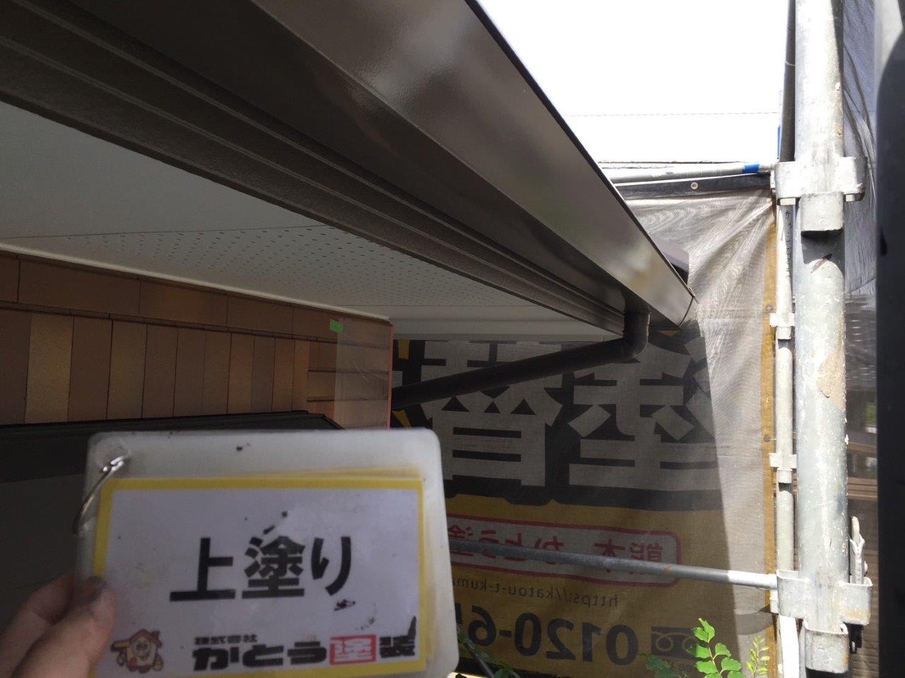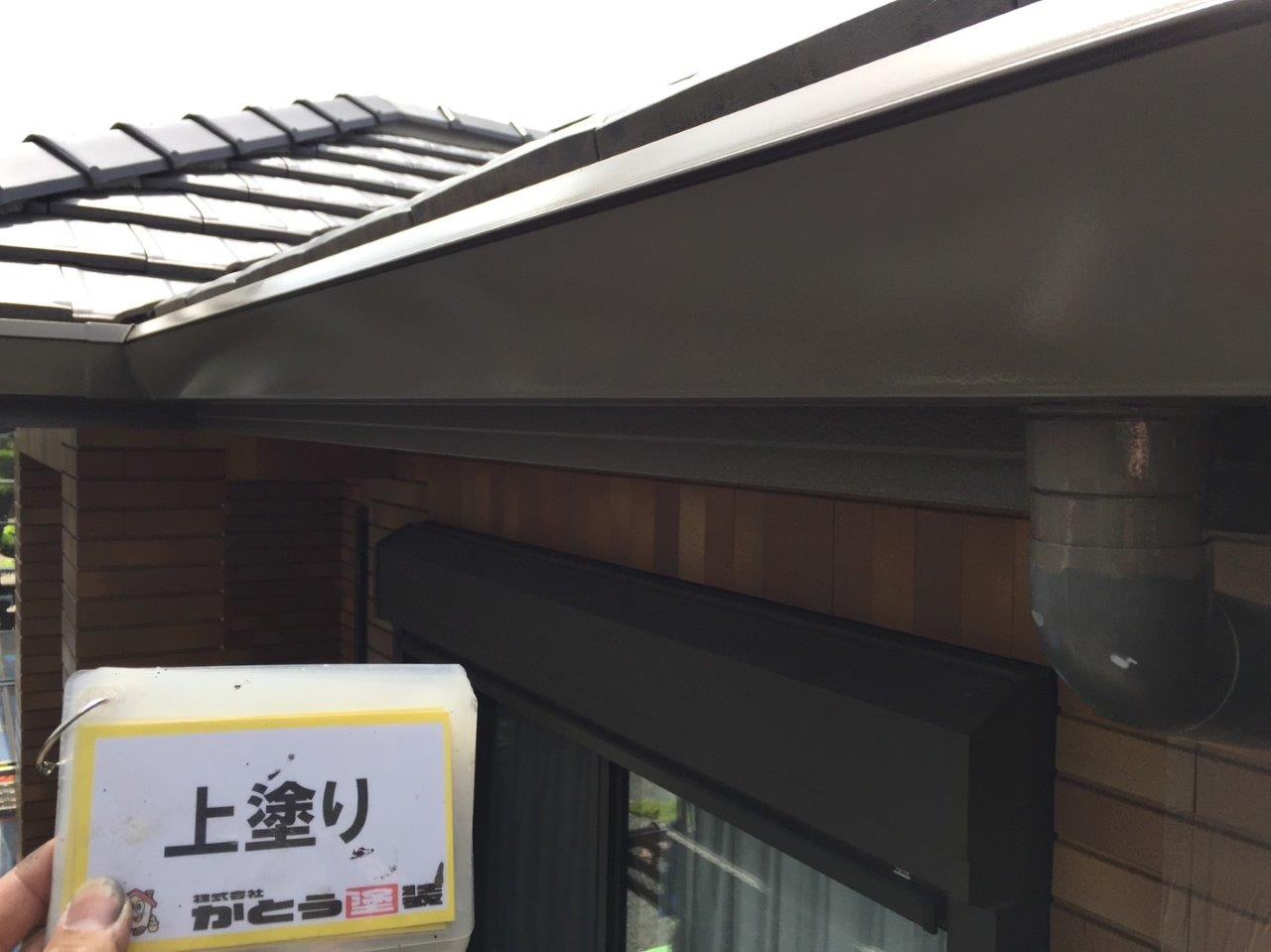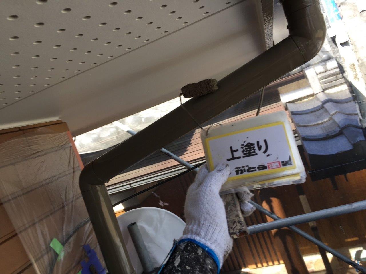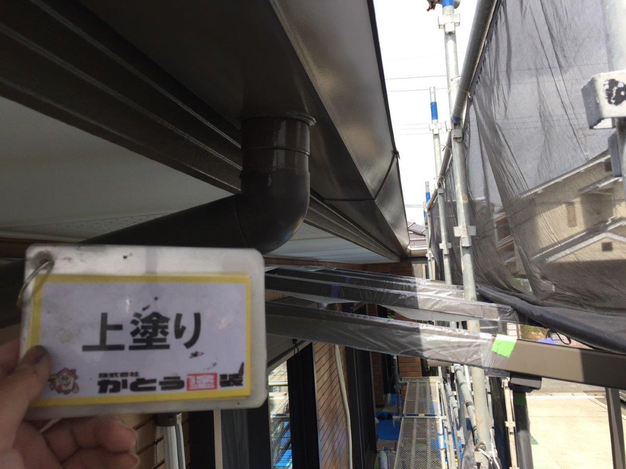 雨どい塗装 上塗り状況です。高耐候性のフッ素4Fで施工しております。普通はウレタンかシリコンでやる箇所ですが当社では高耐候性の塗料を使用しています。ここがウレタンで一回塗りだと3年もしないでだめになります。今出ている塗料は一回塗りでもツヤが伸びます、素人目ではまず違いがわかりません。弊社のようにしっかりと写真に残こしちゃんとやってるかが大事になります。