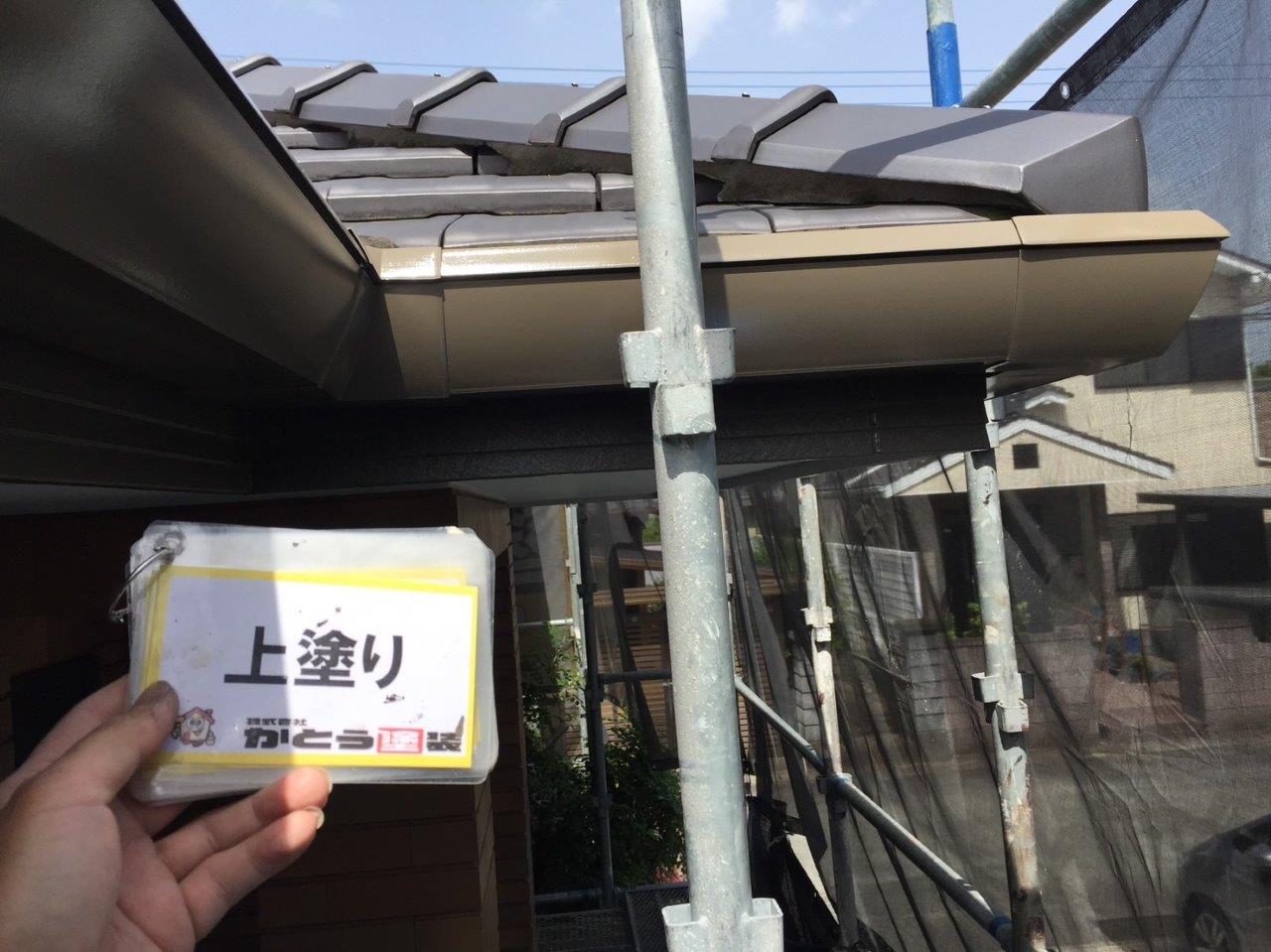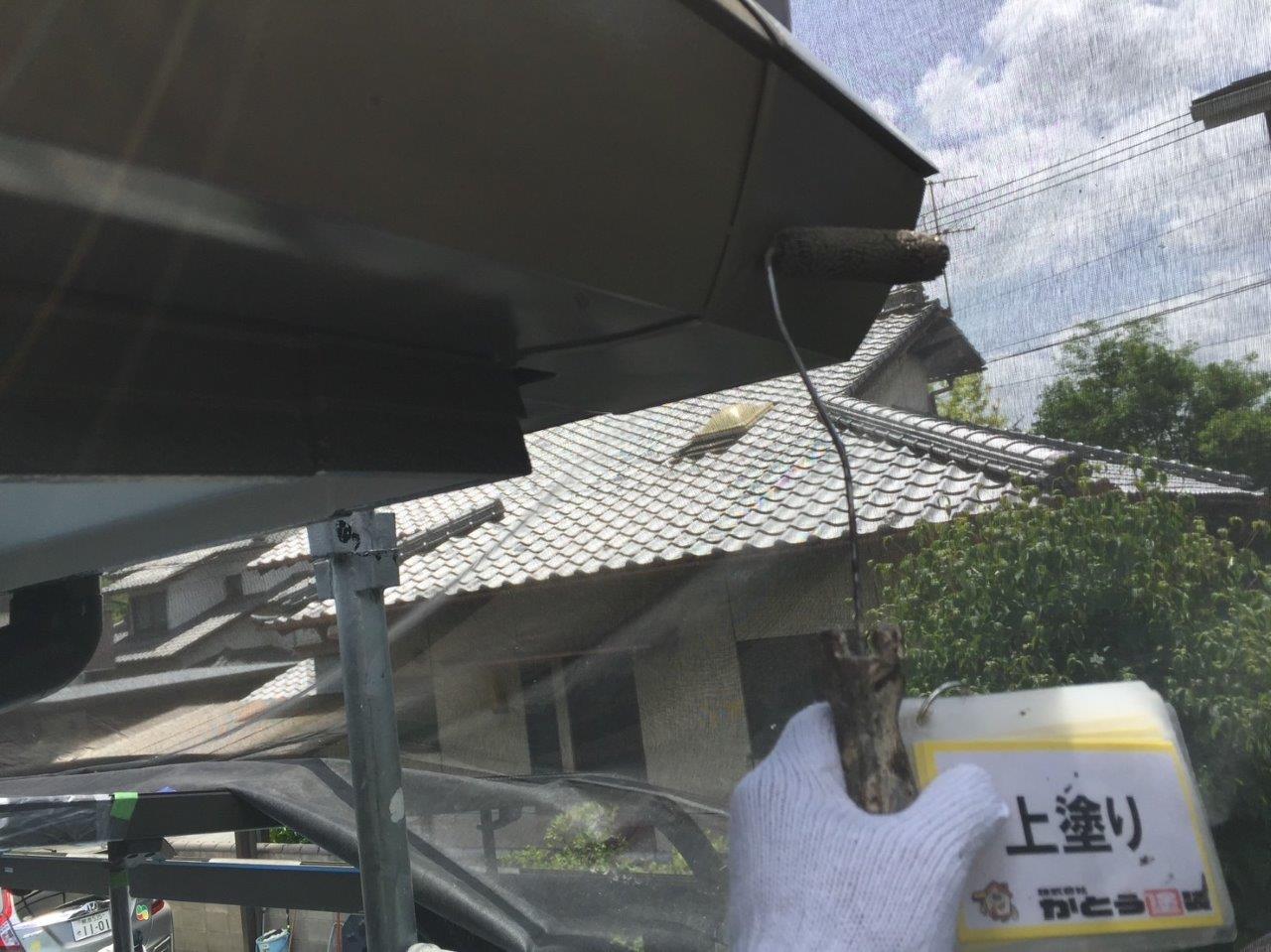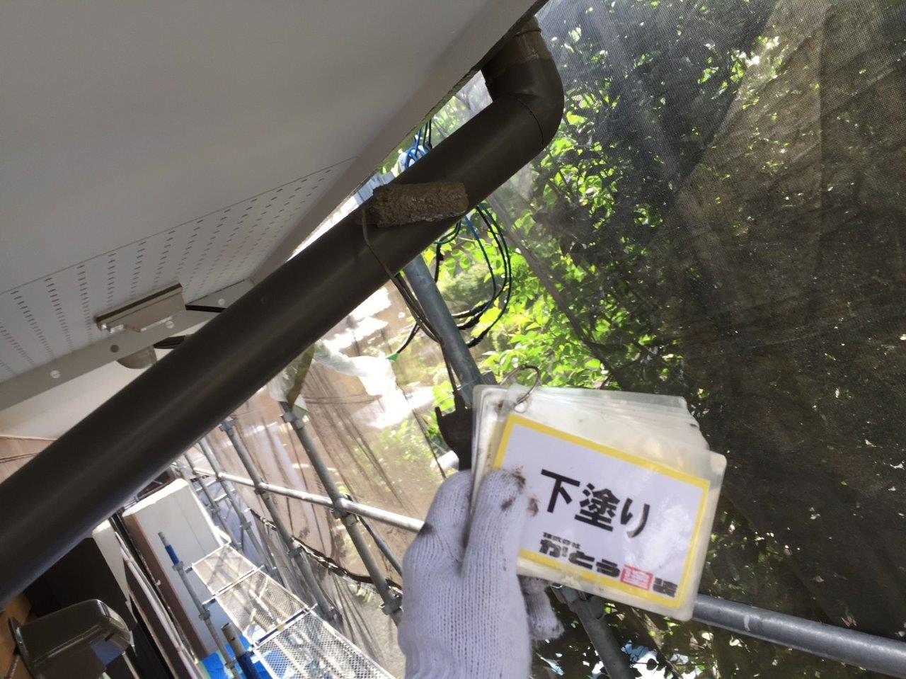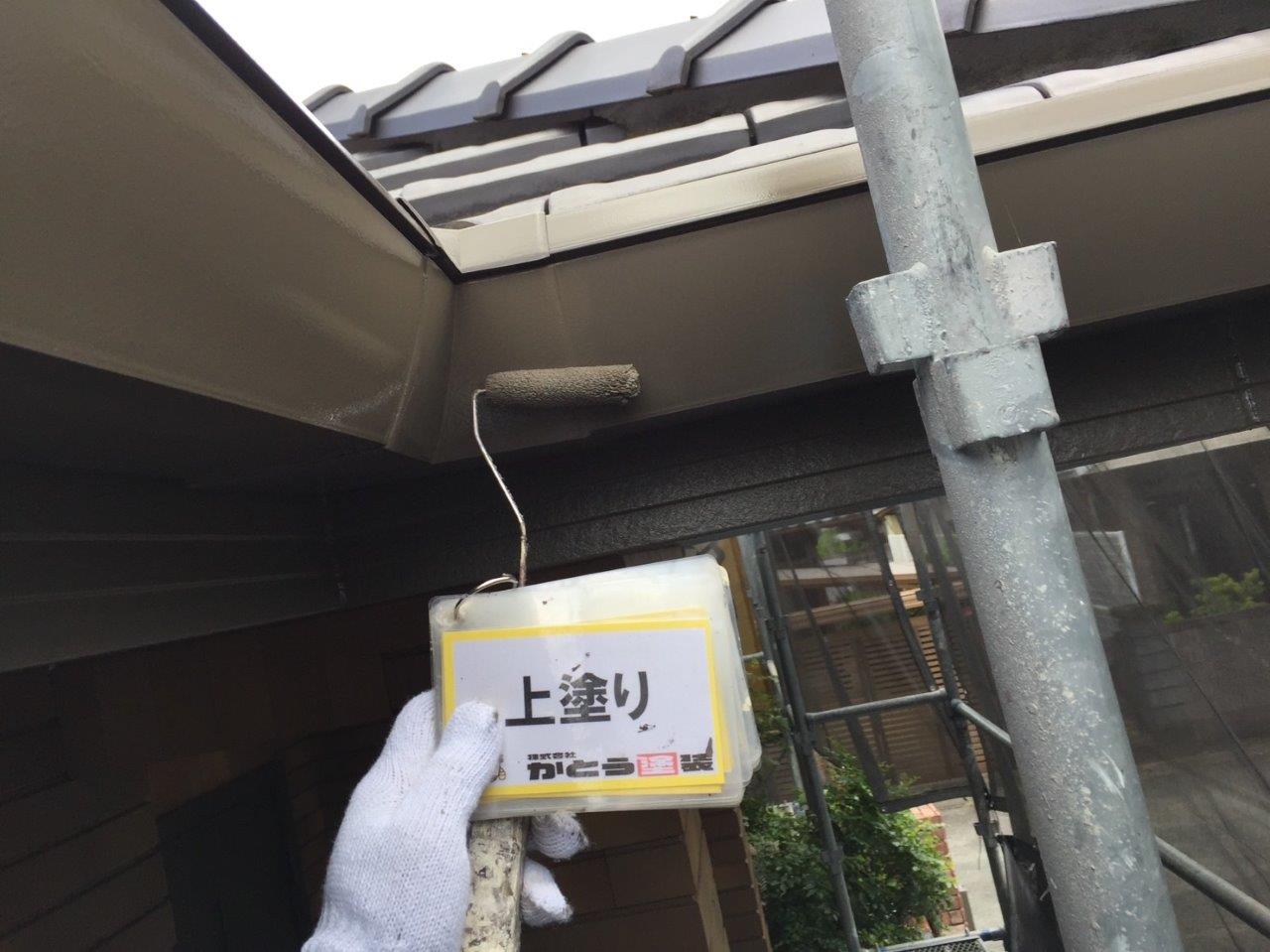 雨どい塗装 上塗り状況です。高耐候性のフッ素4Fで施工しております。普通はウレタンかシリコンでやる箇所ですが当社では高耐候性の塗料を使用しています。ここがウレタンで一回塗りだと3年もしないでだめになります。今出ている塗料は一回塗りでもツヤが伸びます、素人目ではまず違いがわかりません。弊社のようにしっかりと写真に残こしちゃんとやってるかが大事になります。