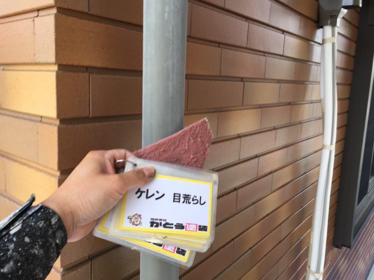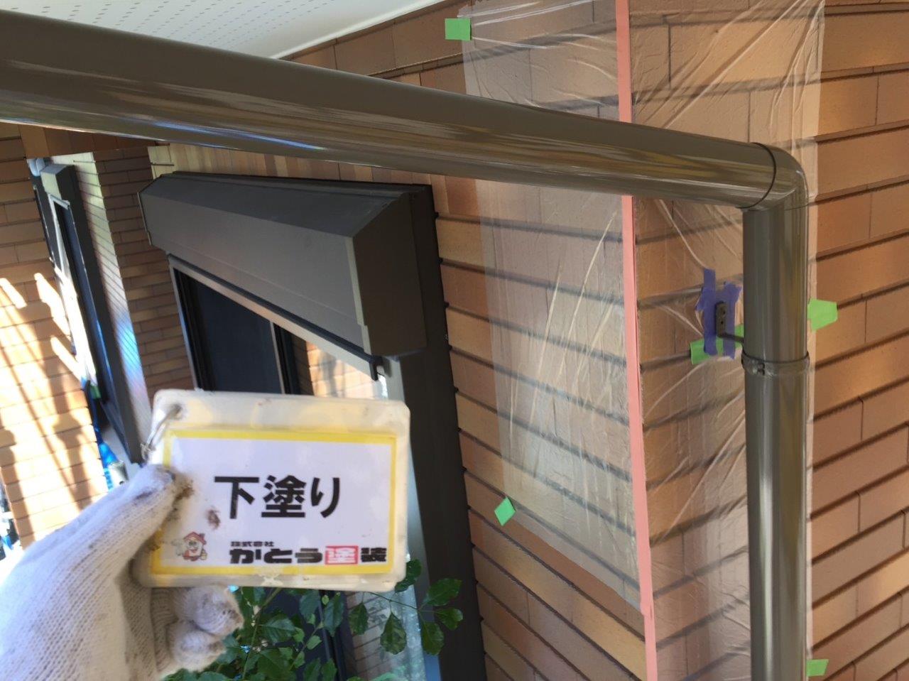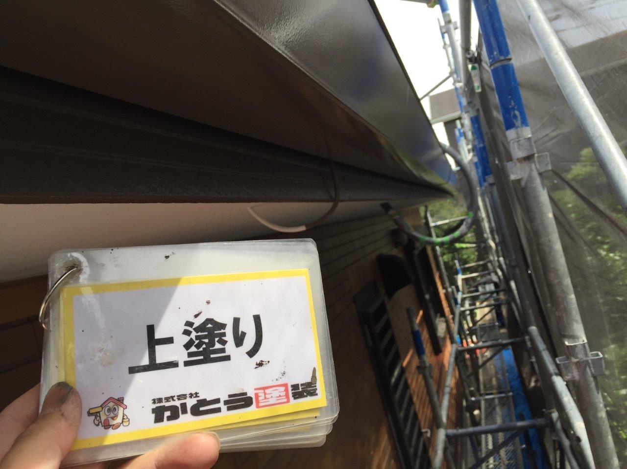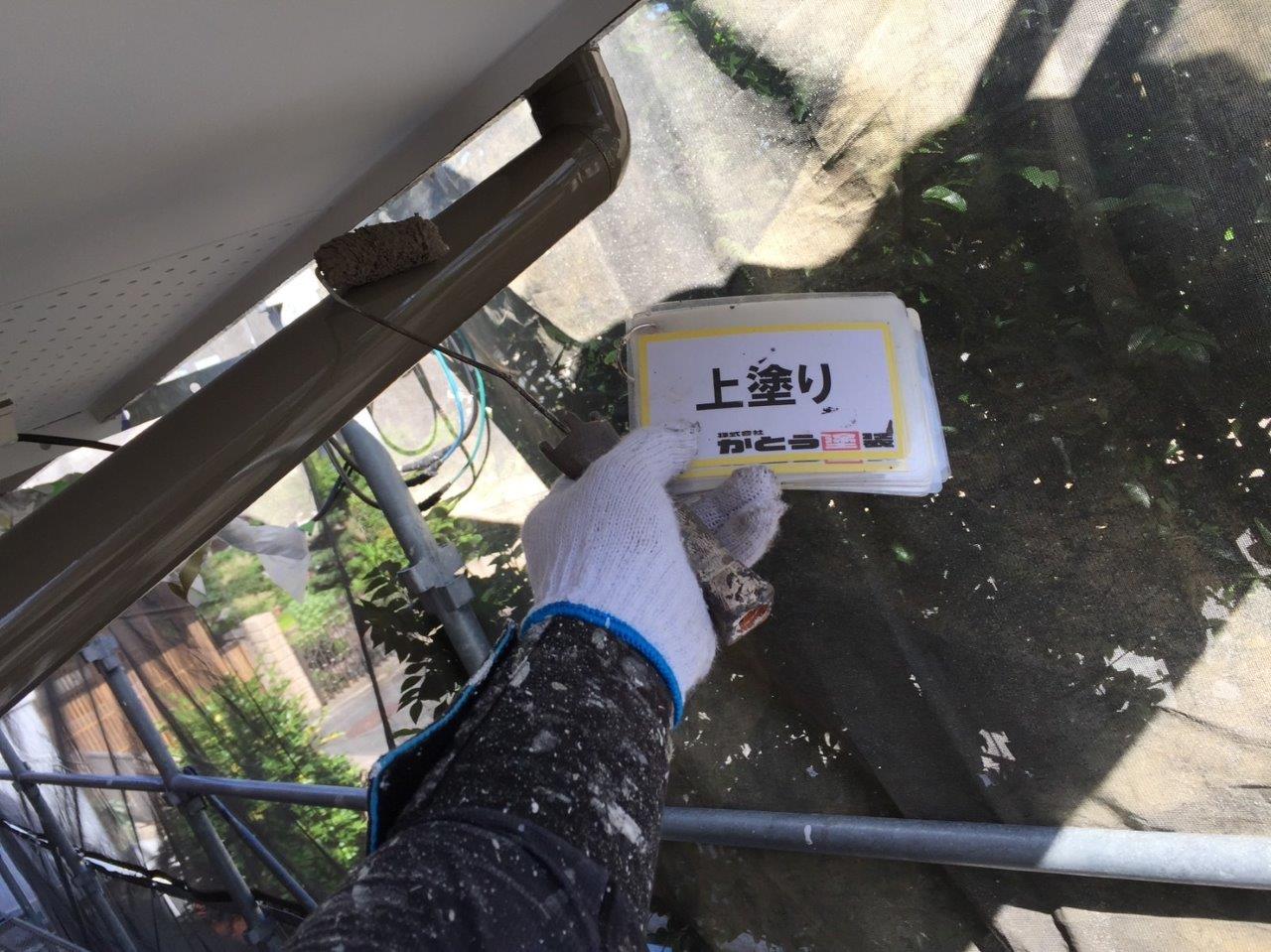 雨どい塗装 上塗り状況です。高耐候性のフッ素4Fで施工しております。普通はウレタンかシリコンでやる箇所ですが当社では高耐候性の塗料を使用しています。ここがウレタンで一回塗りだと3年もしないでだめになります。今出ている塗料は一回塗りでもツヤが伸びます、素人目ではまず違いがわかりません。弊社のようにしっかりと写真に残こしちゃんとやってるかが大事になります。
