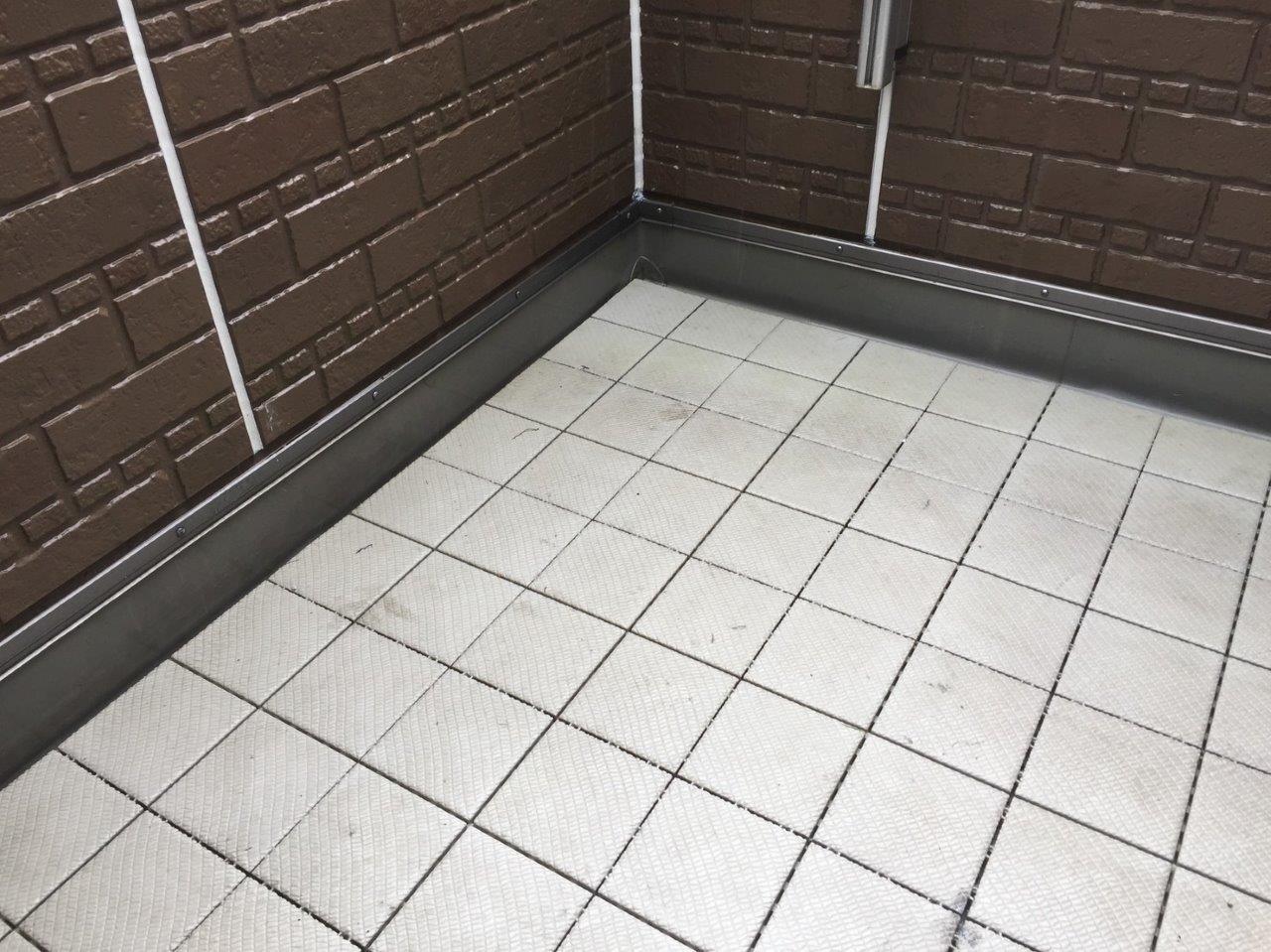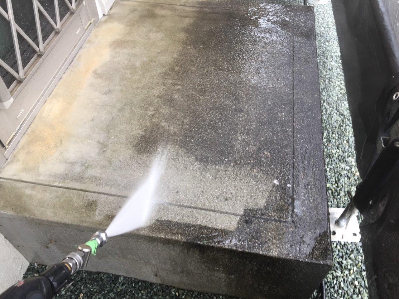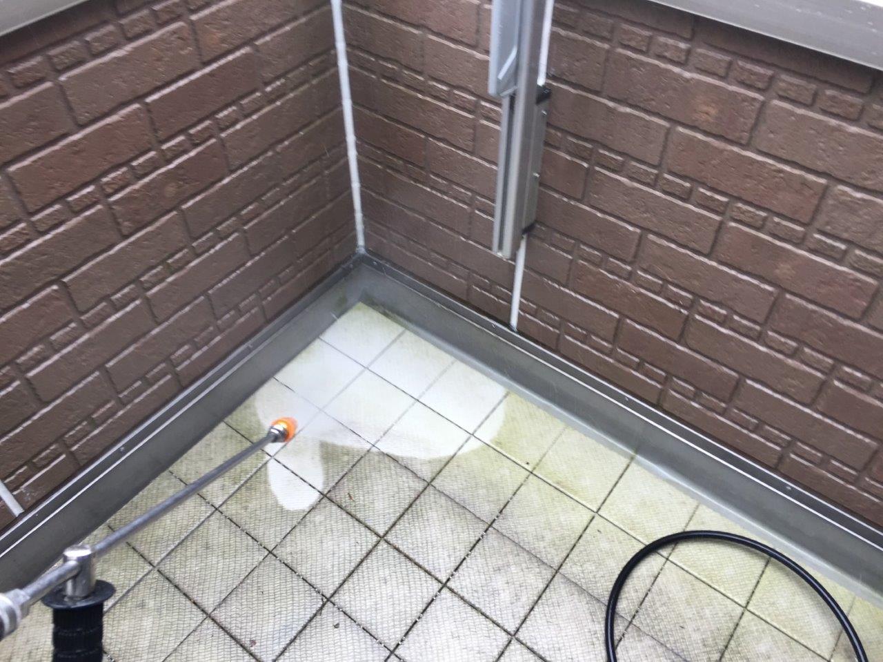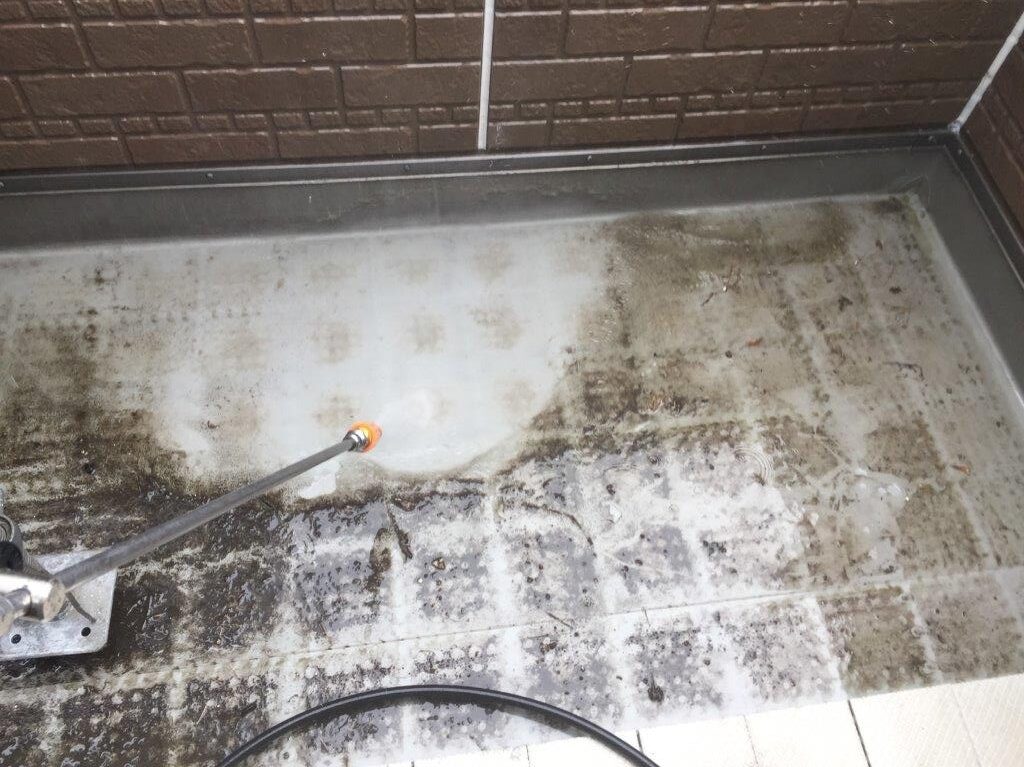 バルコニー内の防水塗装をします。敷物をまず高圧洗浄をしました。