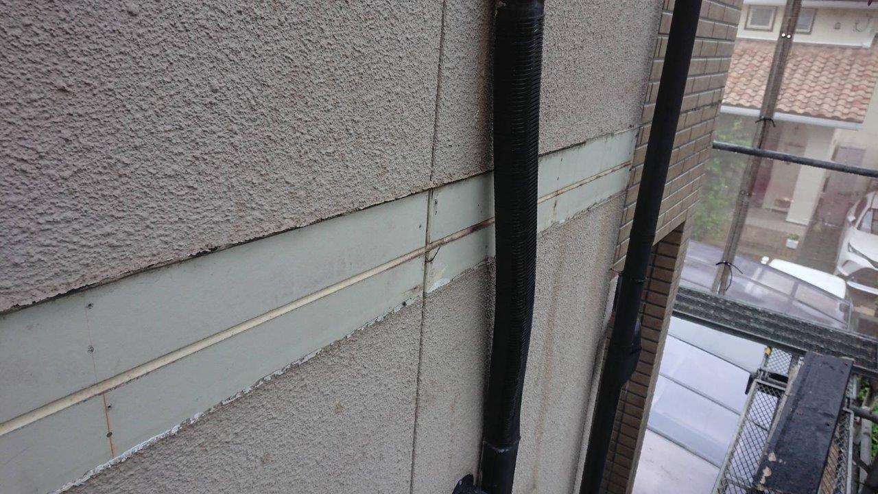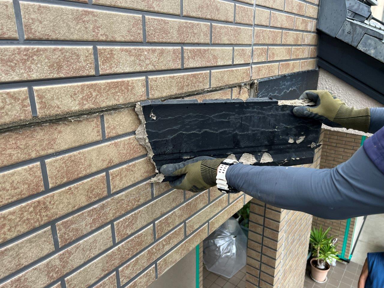 撤去すると水で湿ったような状態です。上部のシーリングが劣化して雨水が入水していました。窯業の幕板ですので裏面に水がはいると吸い込みますのでそれを何年と繰りかえすことで、このような状態になったと考えられます。