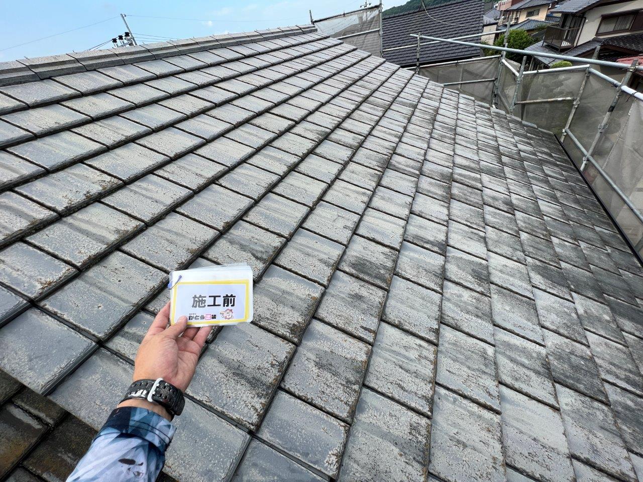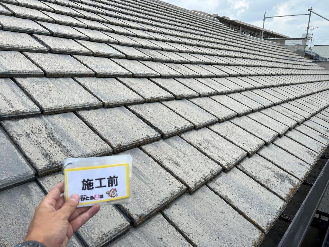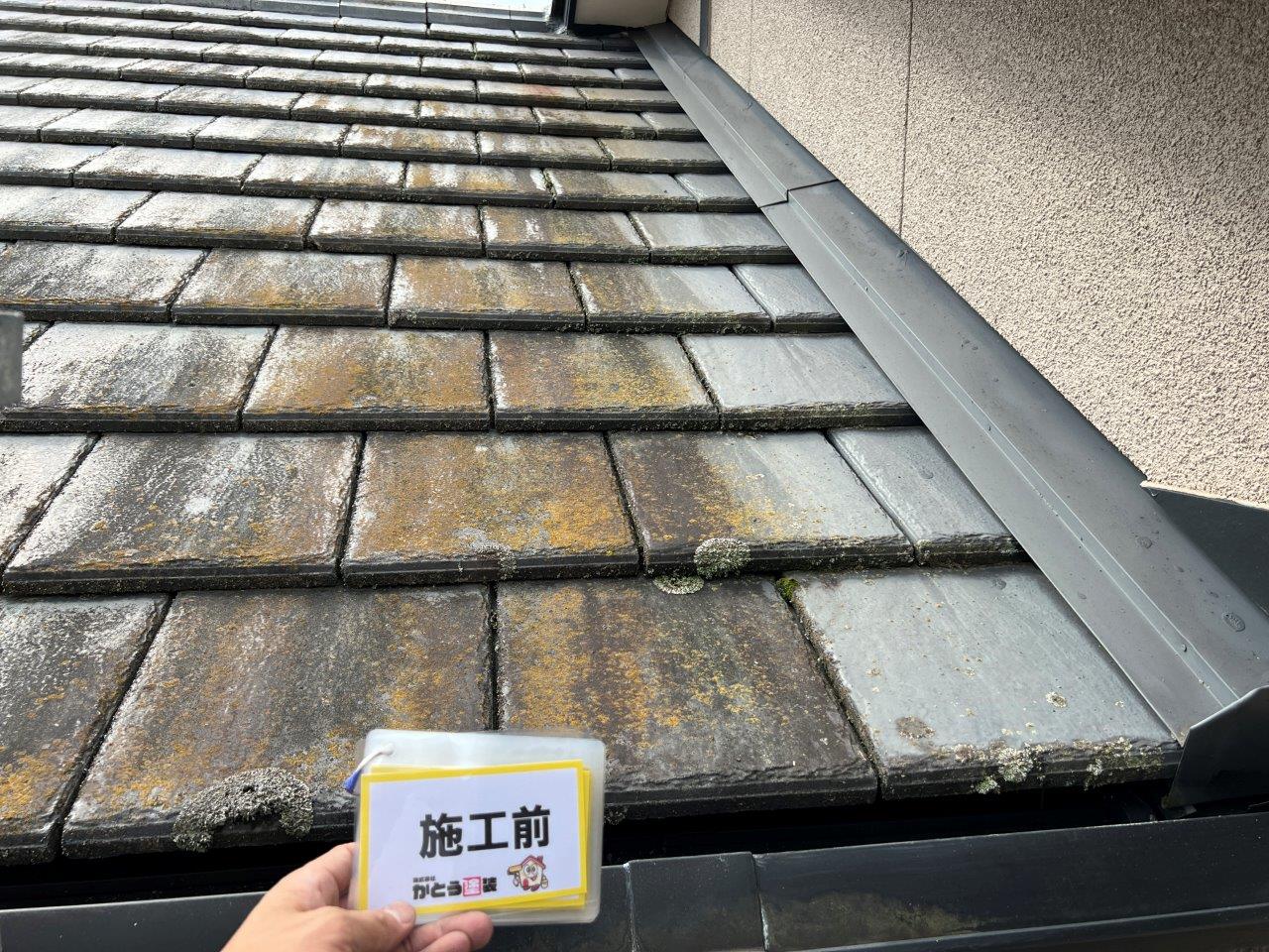 屋根瓦の施工前のお写真です。全体的に褪色していてコケや藻が発生していました。
