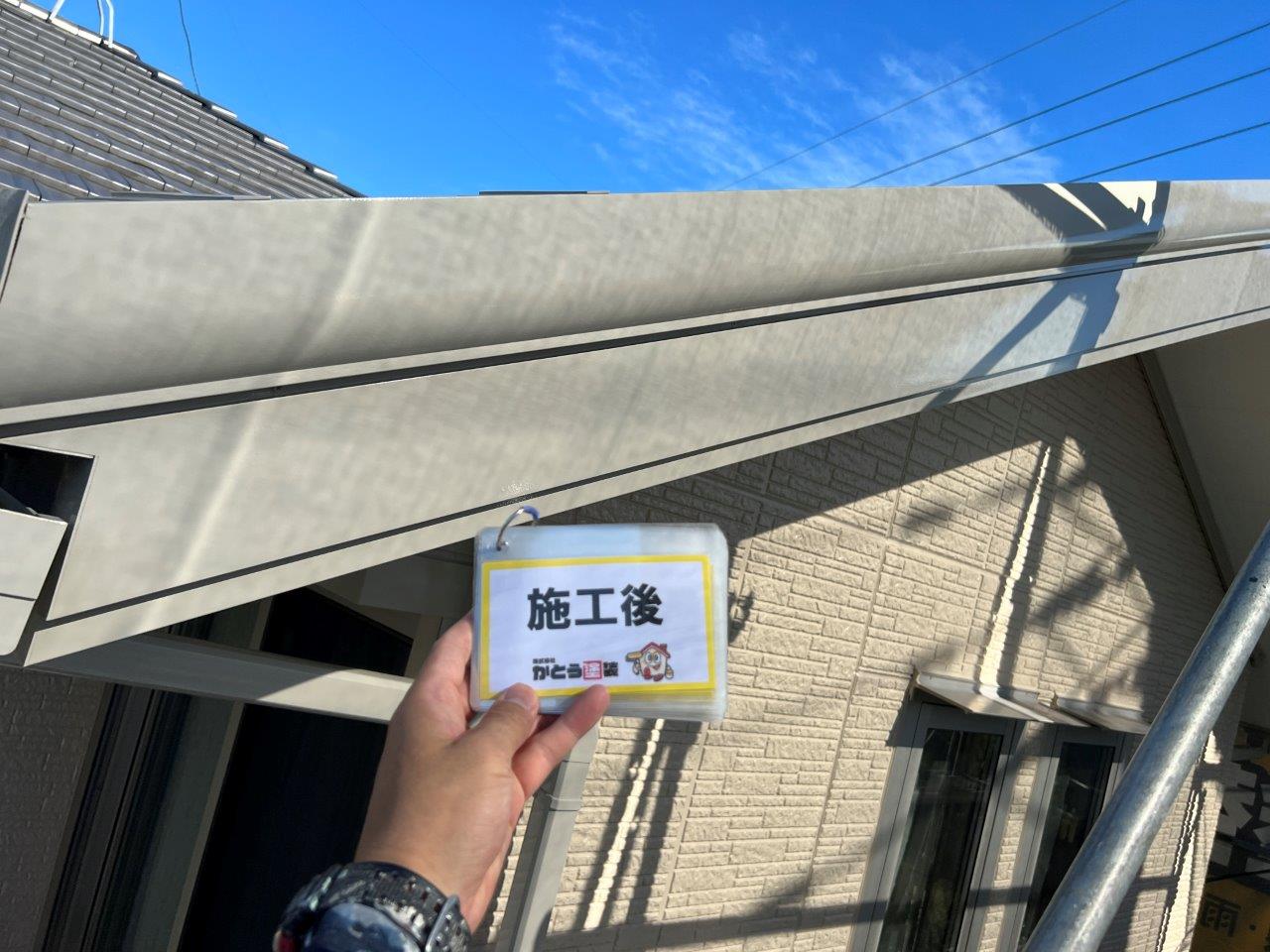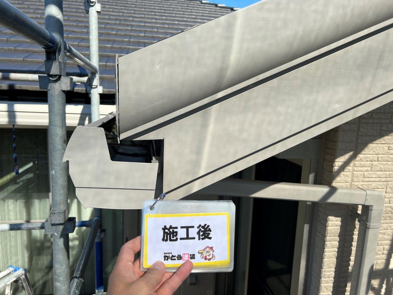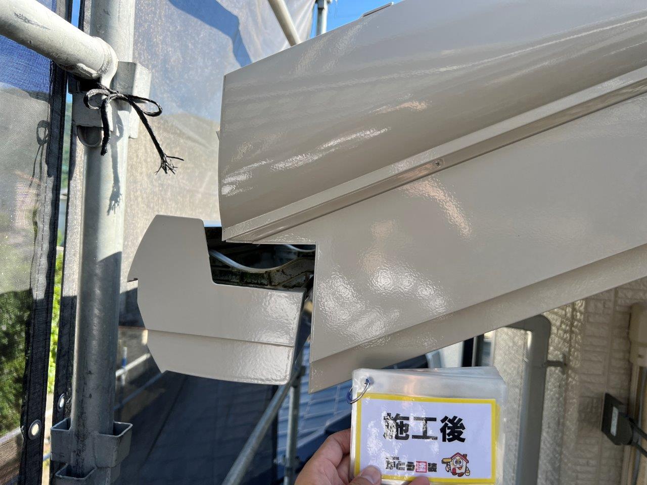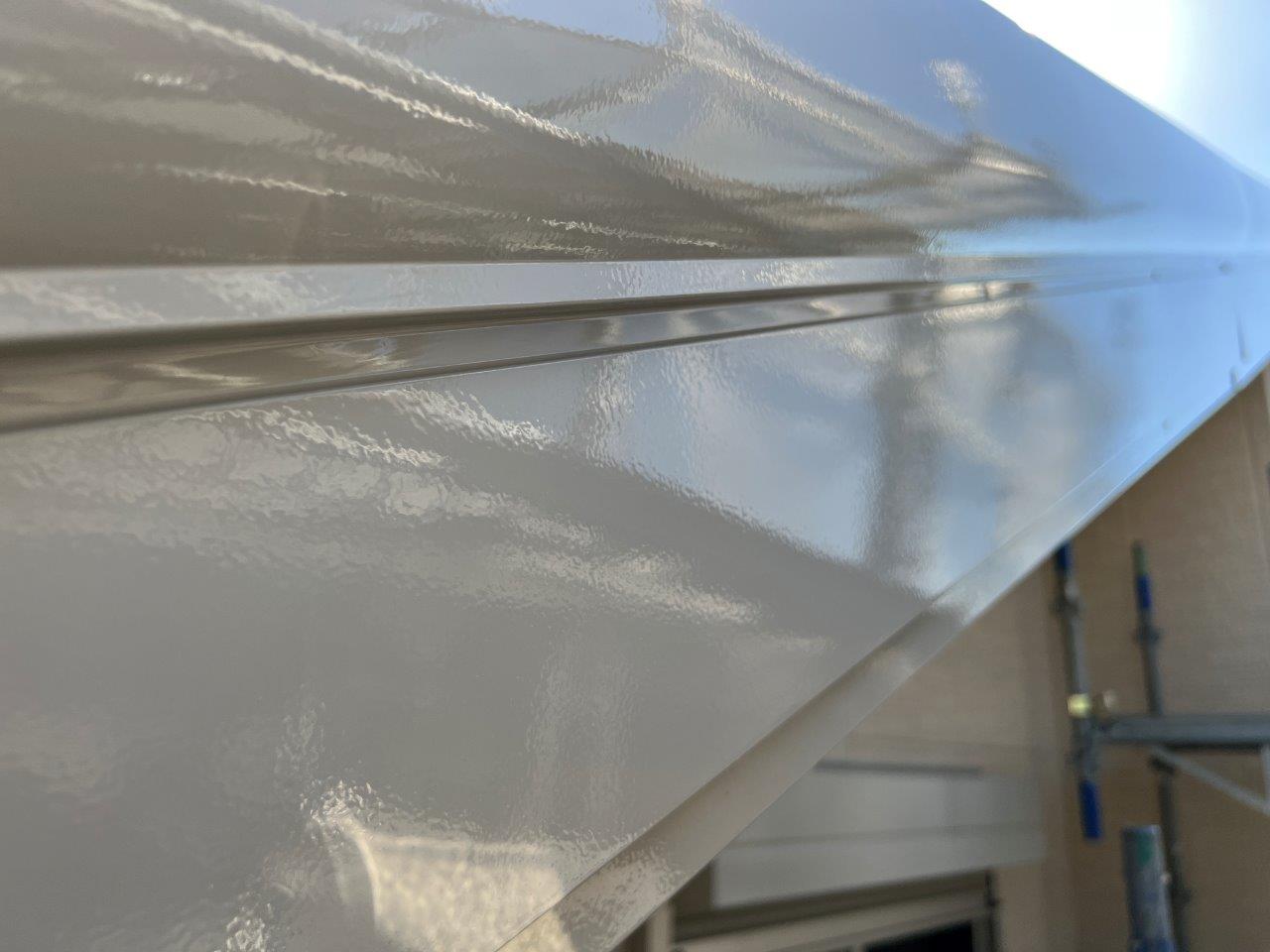 塗り重ねることでこのようにツヤがでています。外壁、屋根以外を付帯部といったりしますが、このような箇所はウレタンかシリコンで施工される場合がほとんどです。甲った箇所も高級塗料で施工しております。