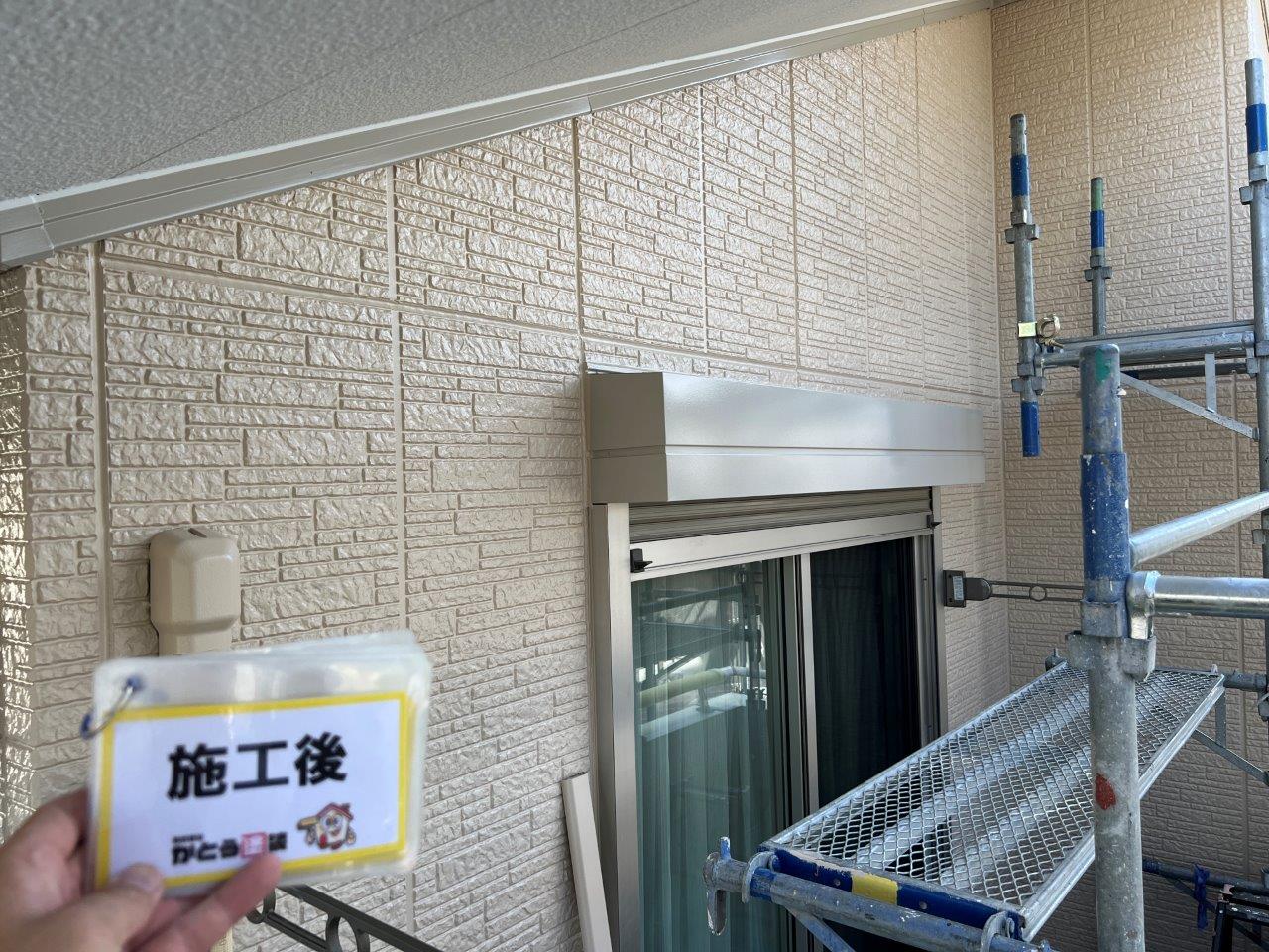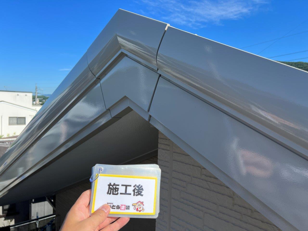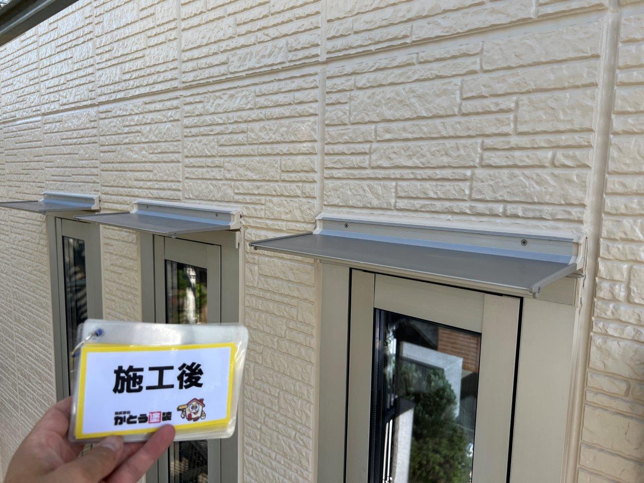 塗り重ねることでこのようにツヤがでています。外壁、屋根以外を付帯部といったりしますが、このような箇所はウレタンかシリコンで施工される場合がほとんどです。甲った箇所も高級塗料で施工しております。