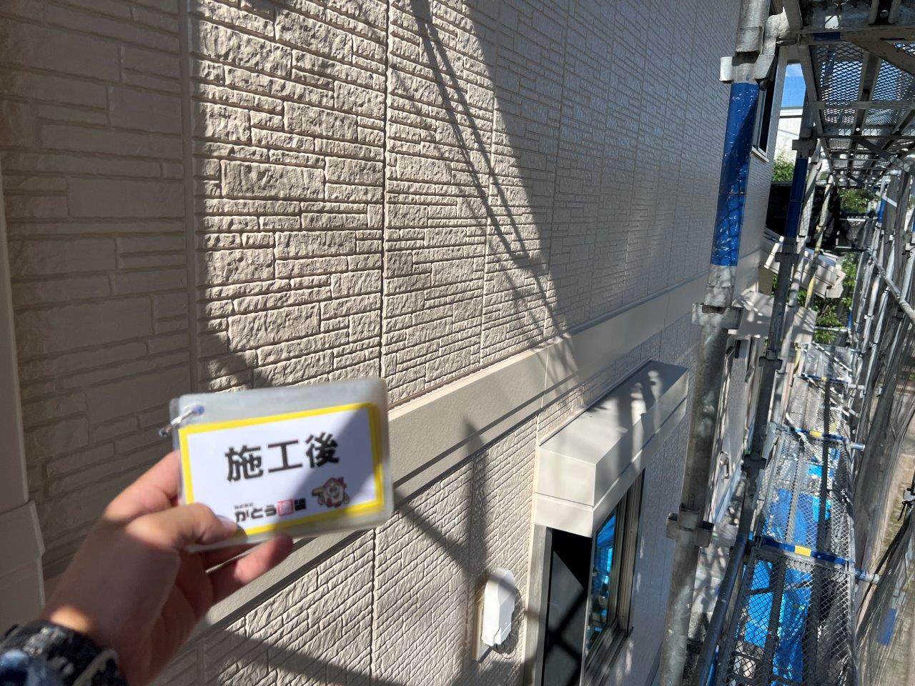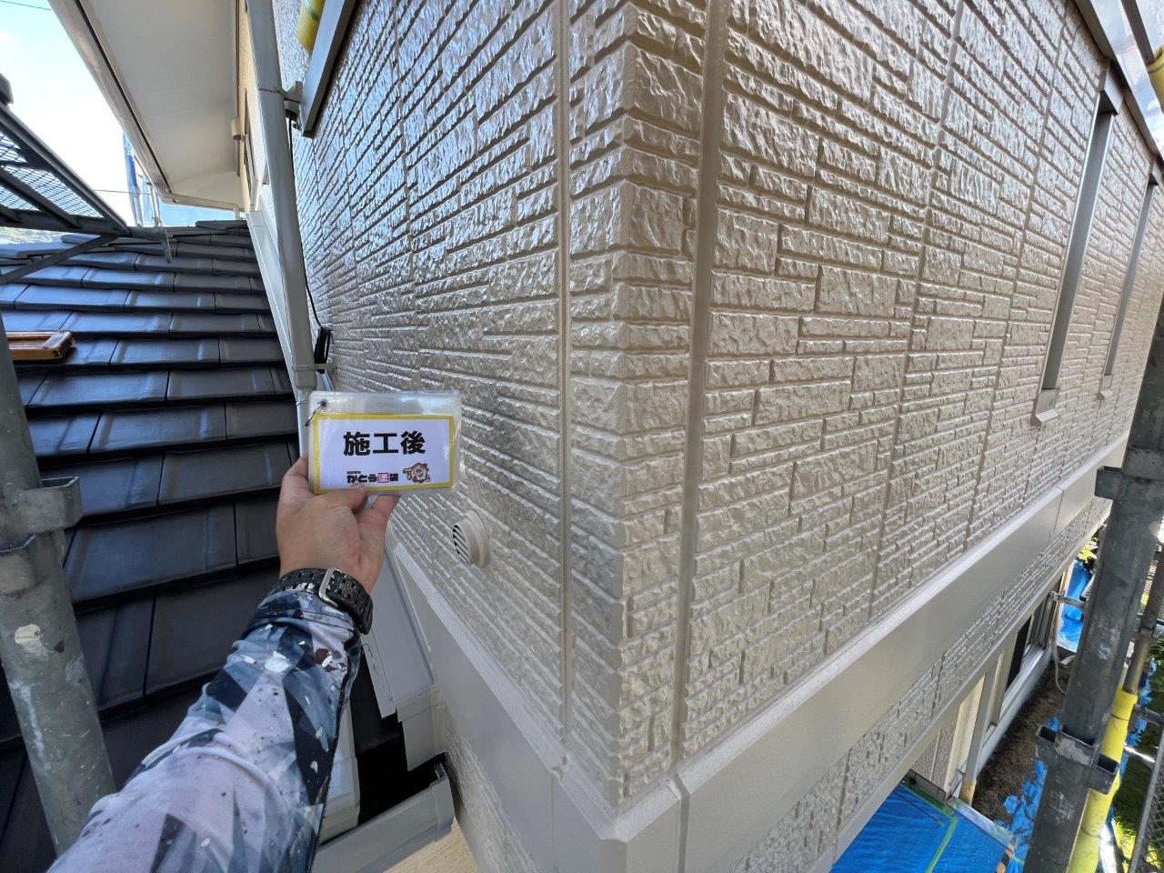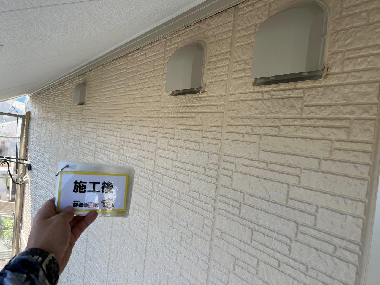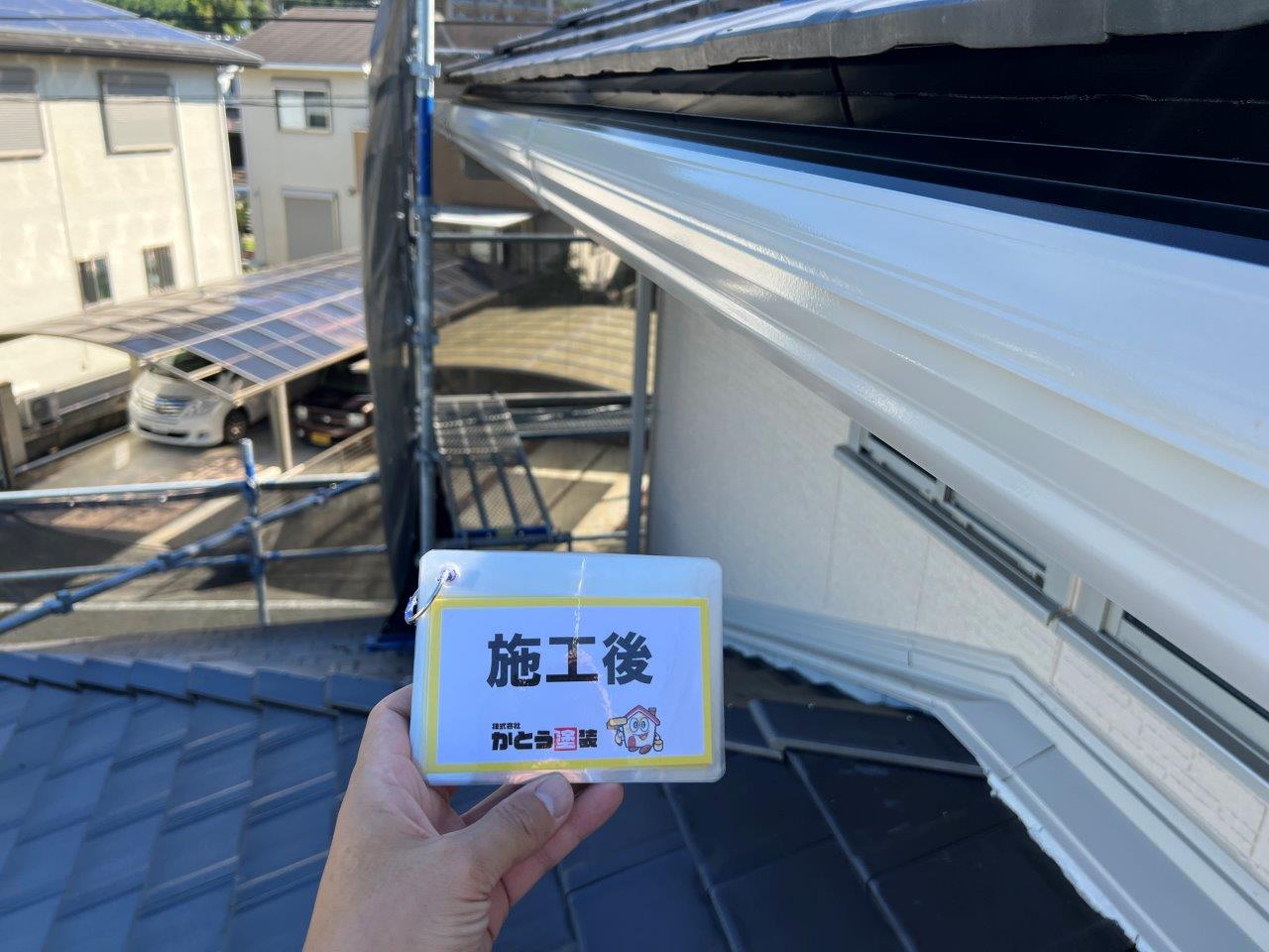 塗り重ねることでこのようにツヤがでています。外壁、屋根以外を付帯部といったりしますが、このような箇所はウレタンかシリコンで施工される場合がほとんどです。甲った箇所も高級塗料で施工しております。