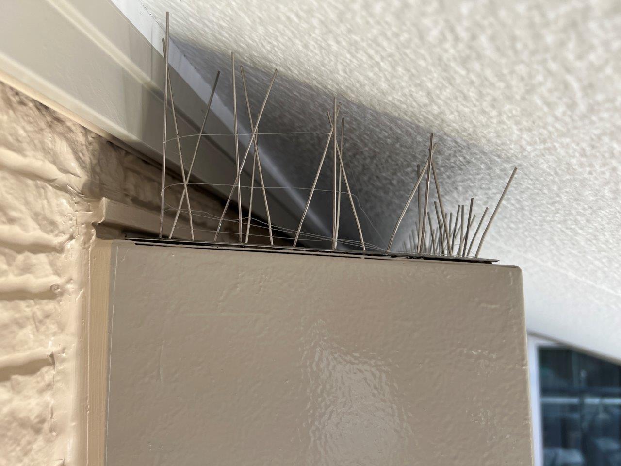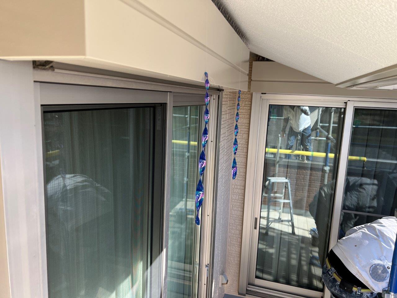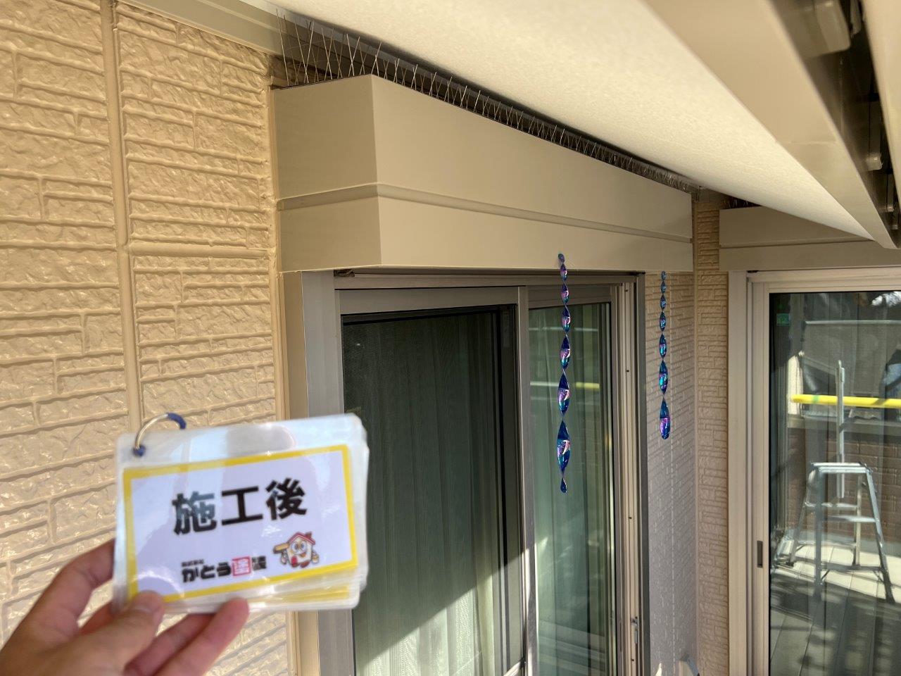 鳥がシャッターボックスの上部に巣をつくるということでこのように鳥よけを取り付けております。針金をとりつけても鳥がわらや枝を運んでいたようなので施主様が糸とキラキラを取りけられました。
