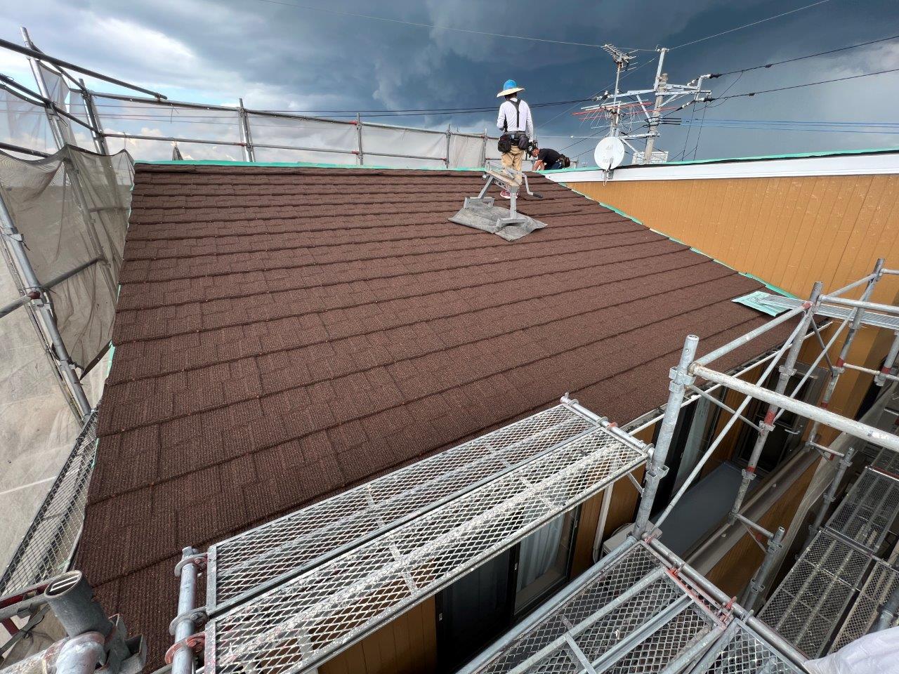 屋根カバー工法2日目、昨日は三時前くらいから大雨でした。