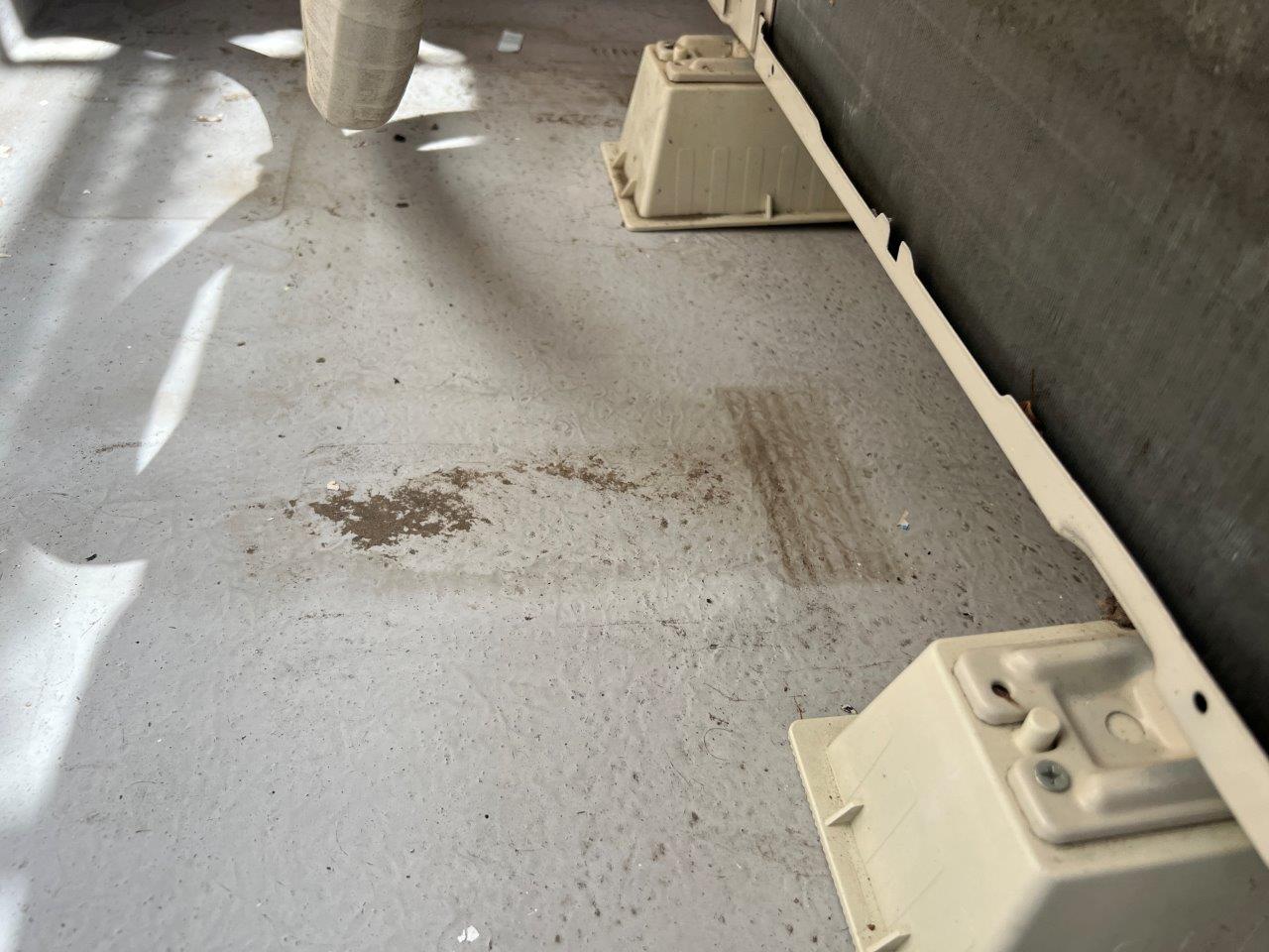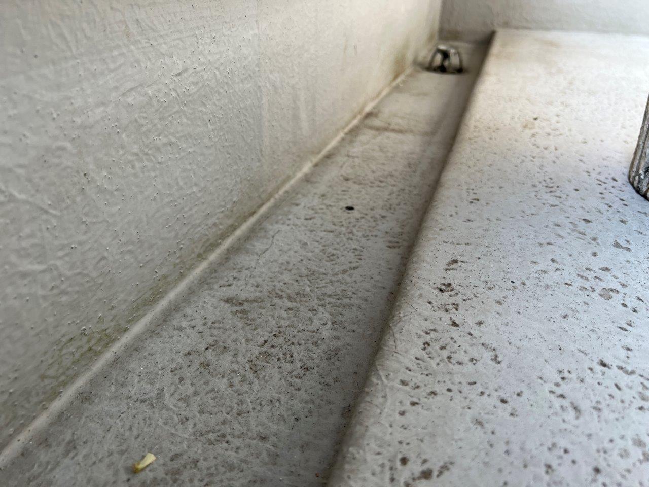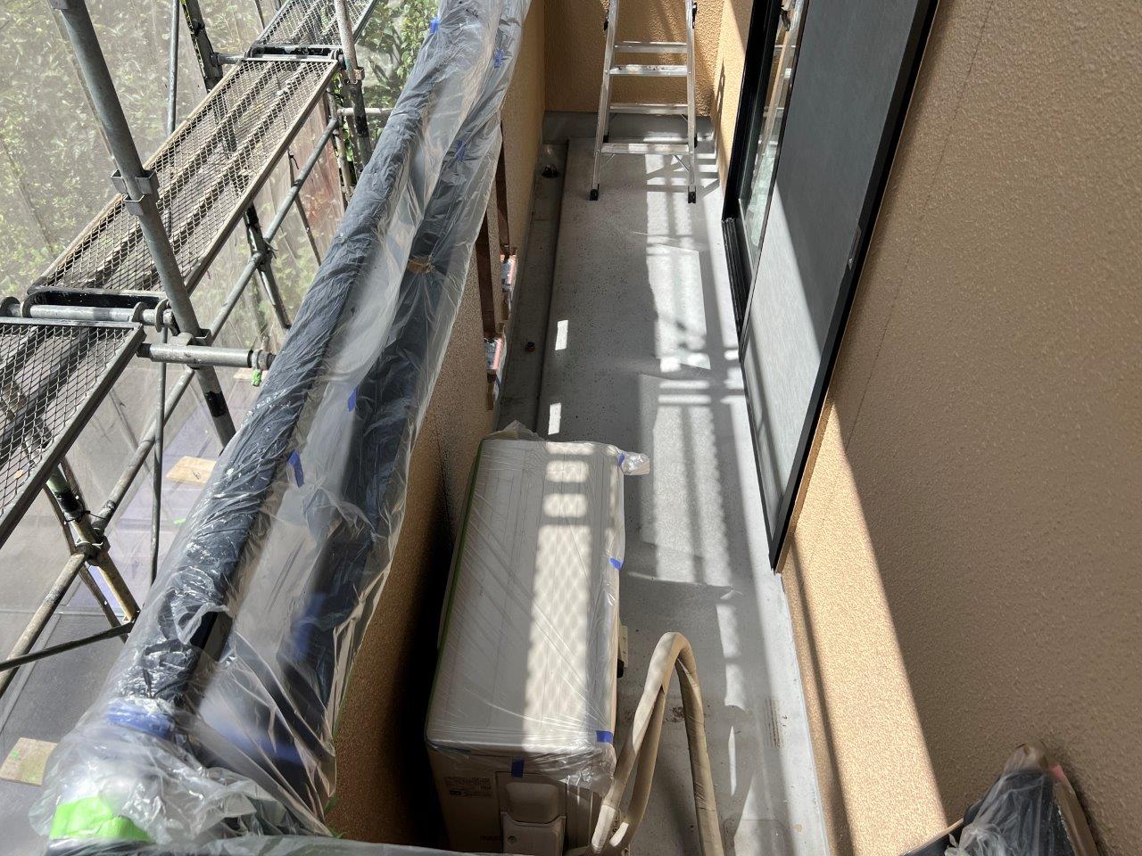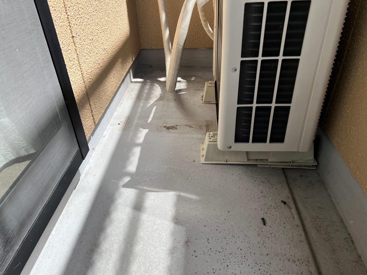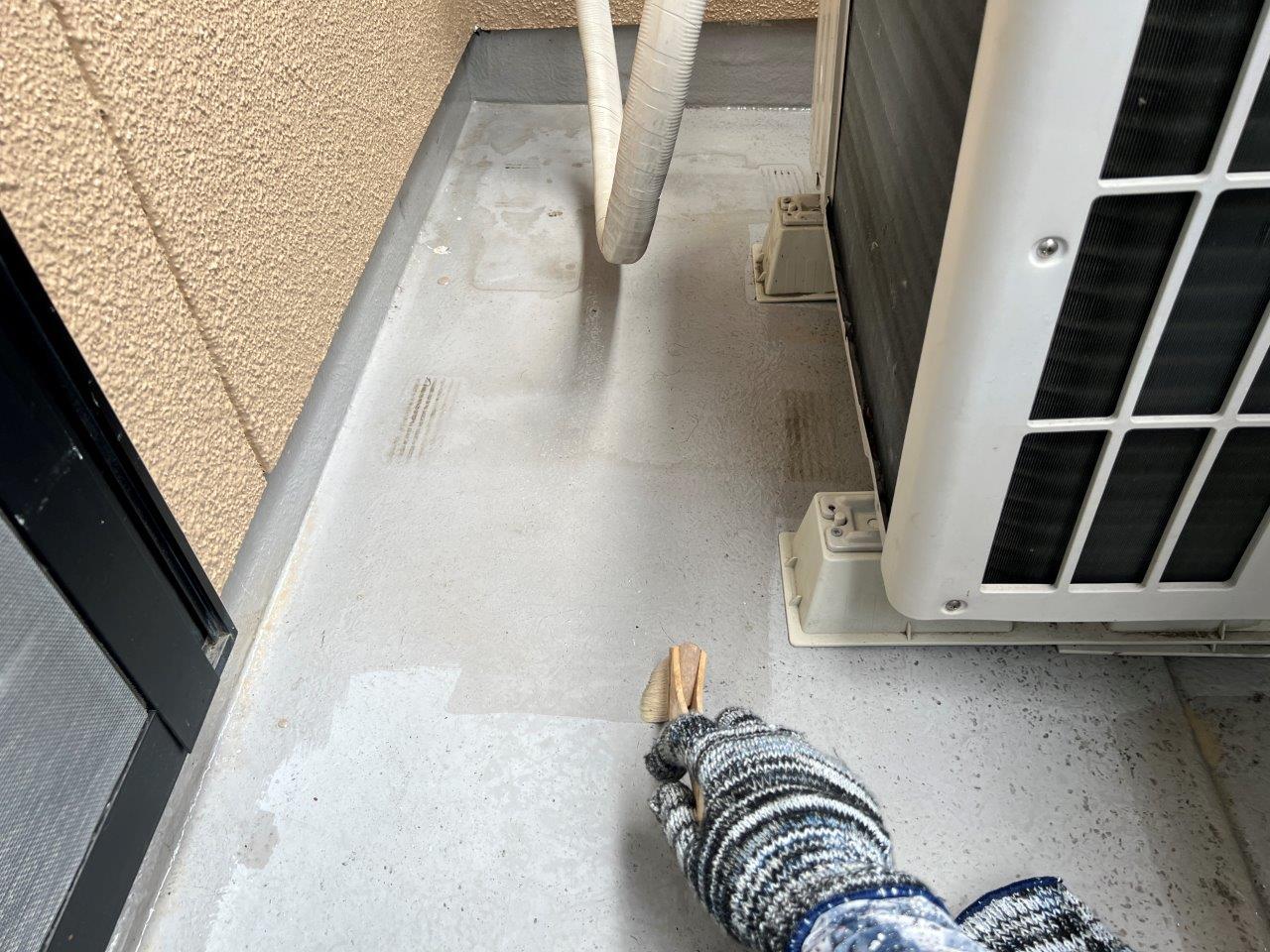 バルコニーの床の防水塗装をおこないます。まず室外機の足元から塗装します。