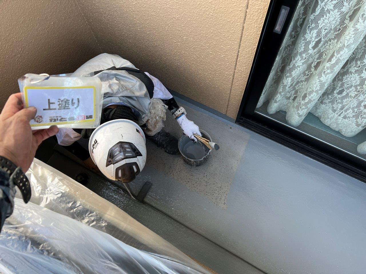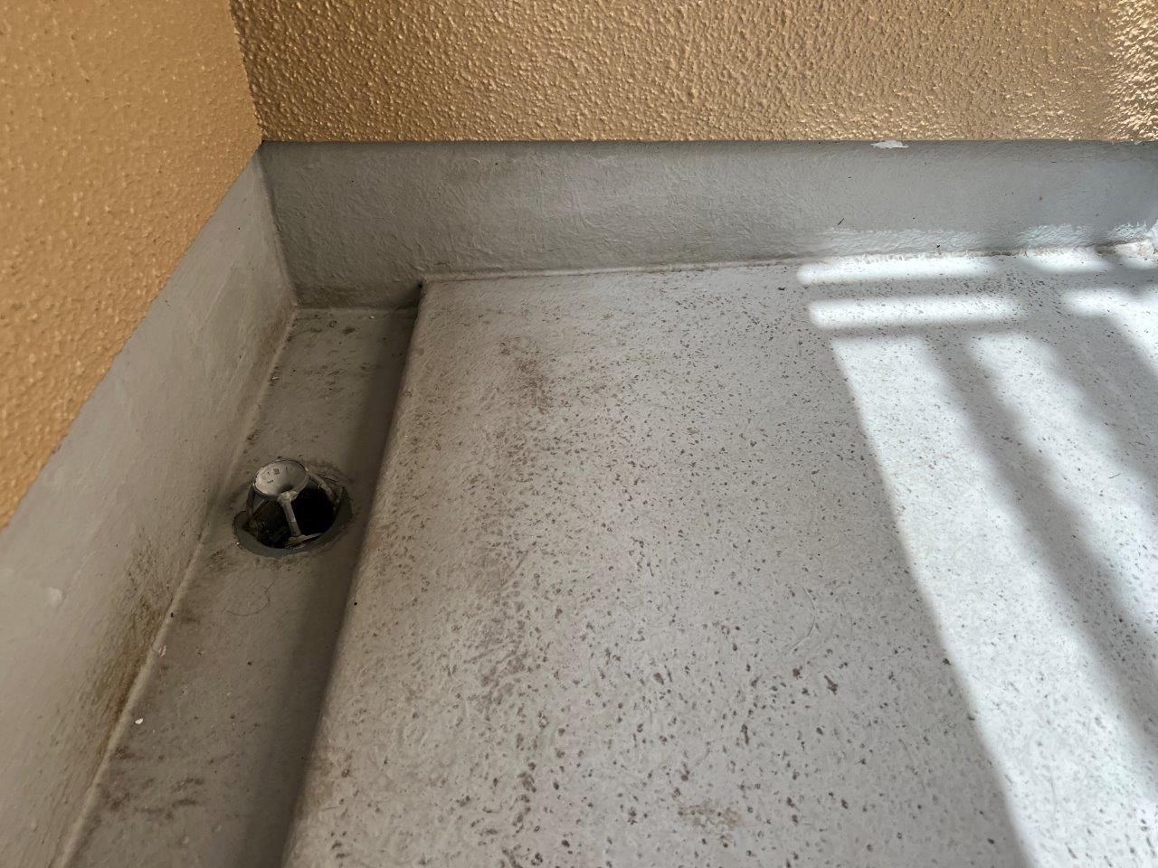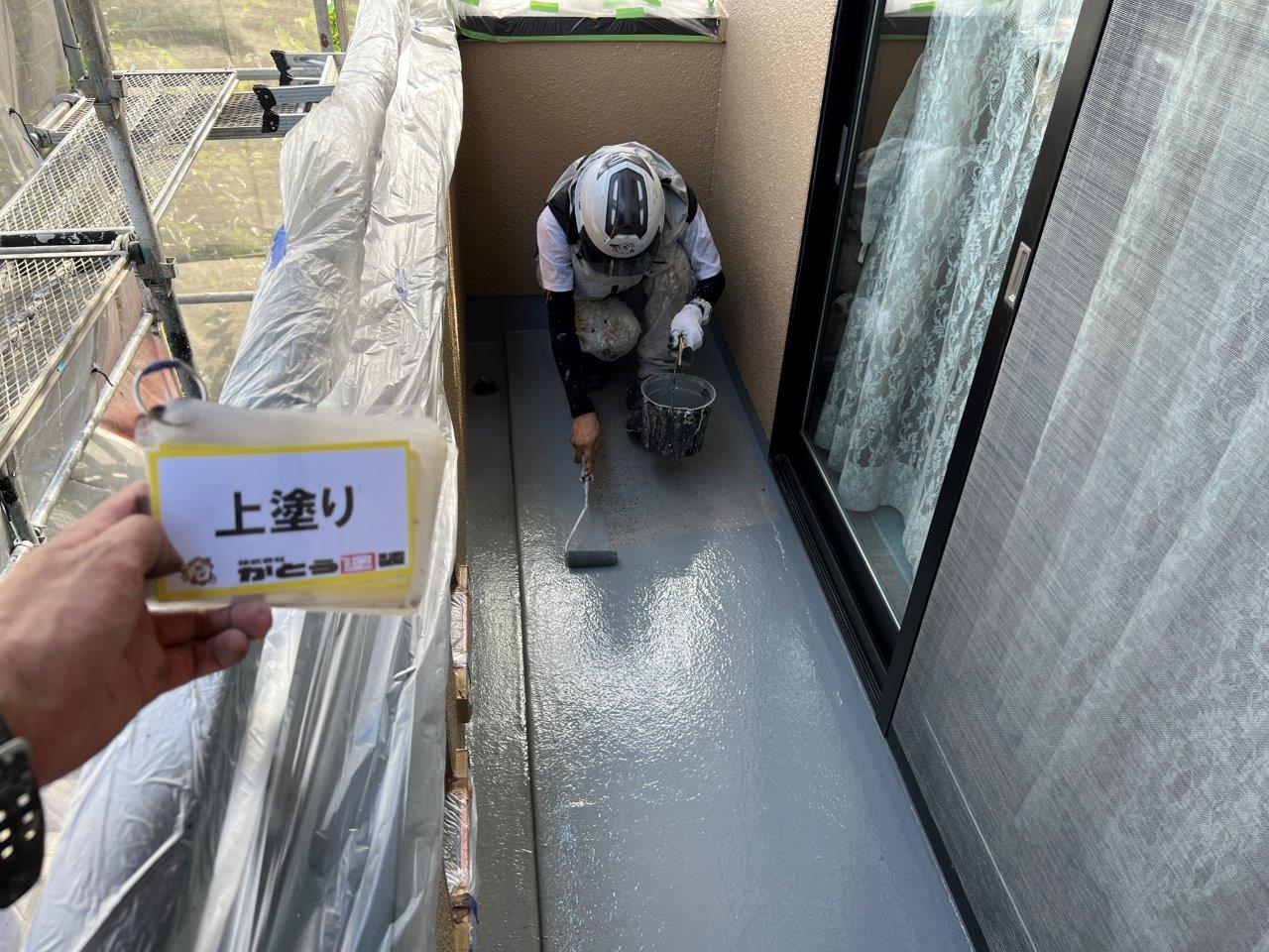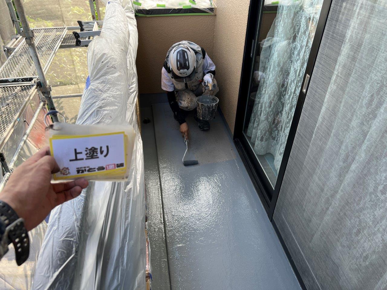 バルコニーの防水塗装、上塗り状況です。下塗り上塗りと仕上げました。防水層はきいていましたので今回の工事は二回塗りで施工しています。