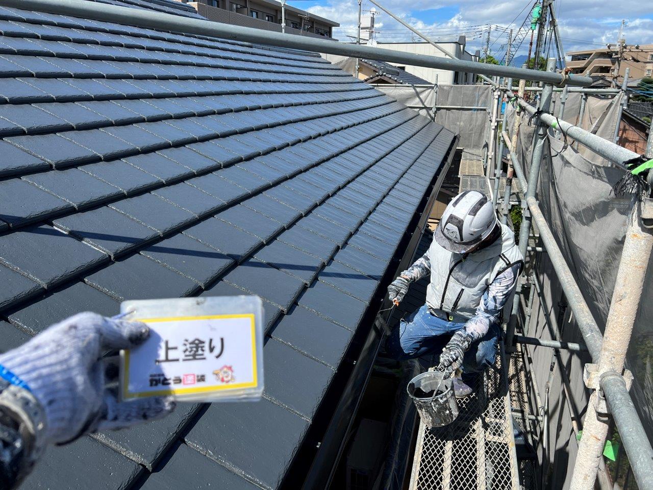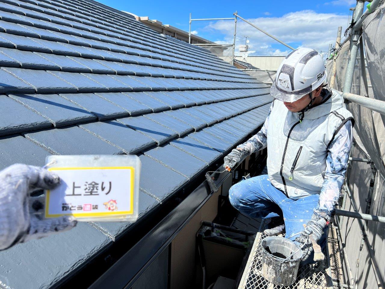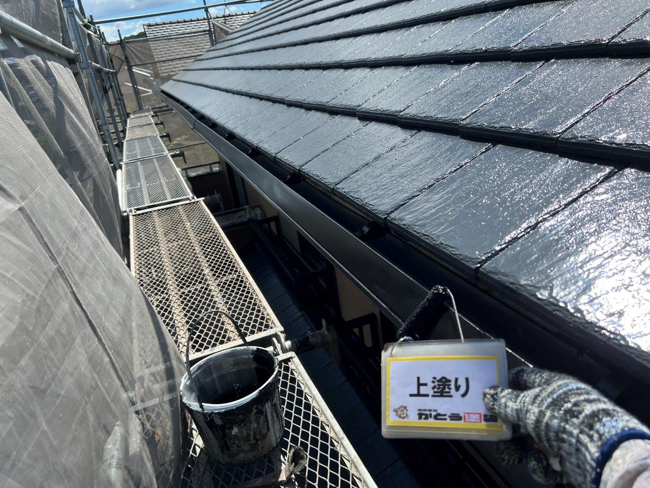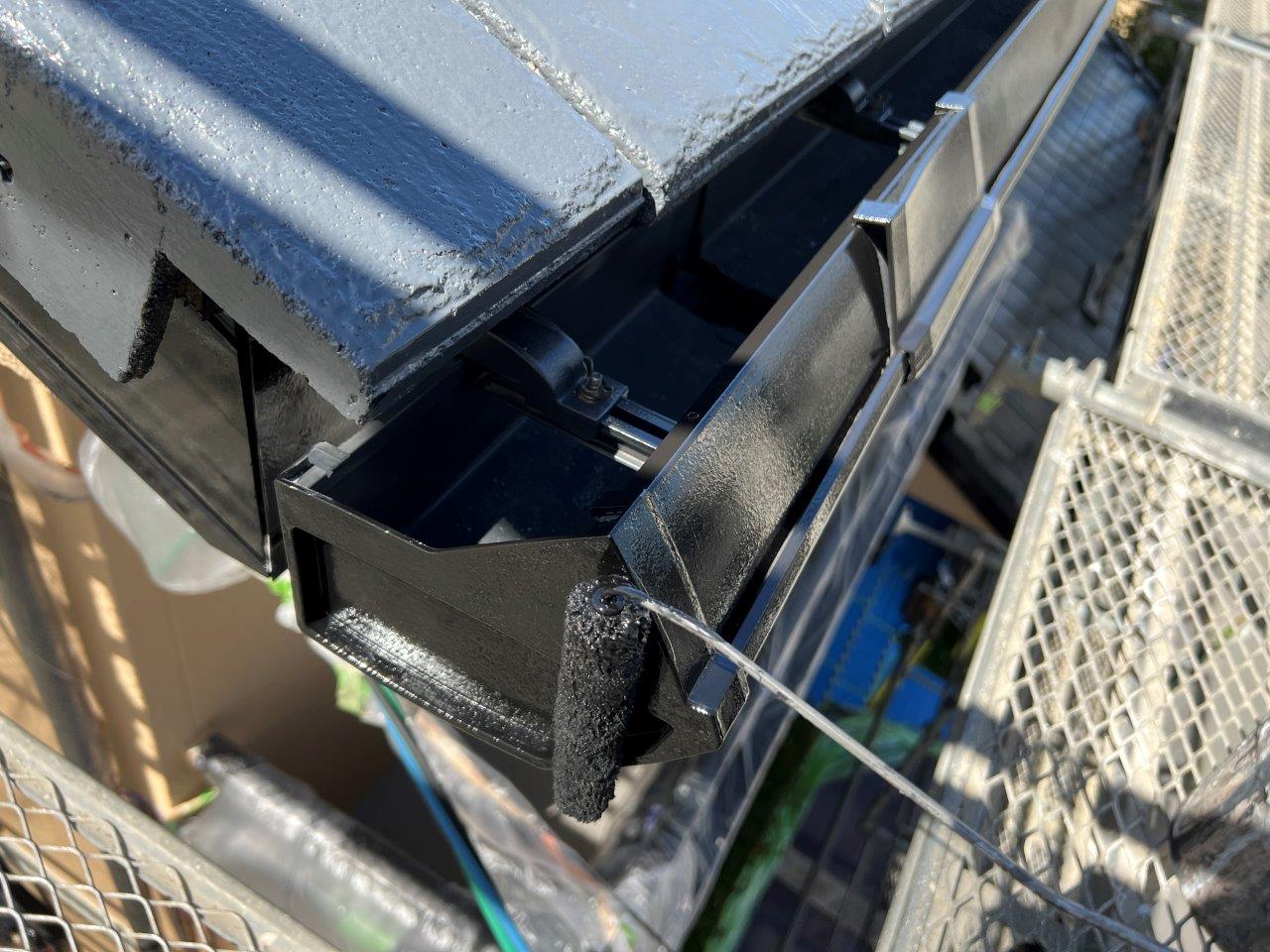 雨どい塗装、上塗り状況です。2回塗りで仕上げました。屋根は無機塗料で施工しています。