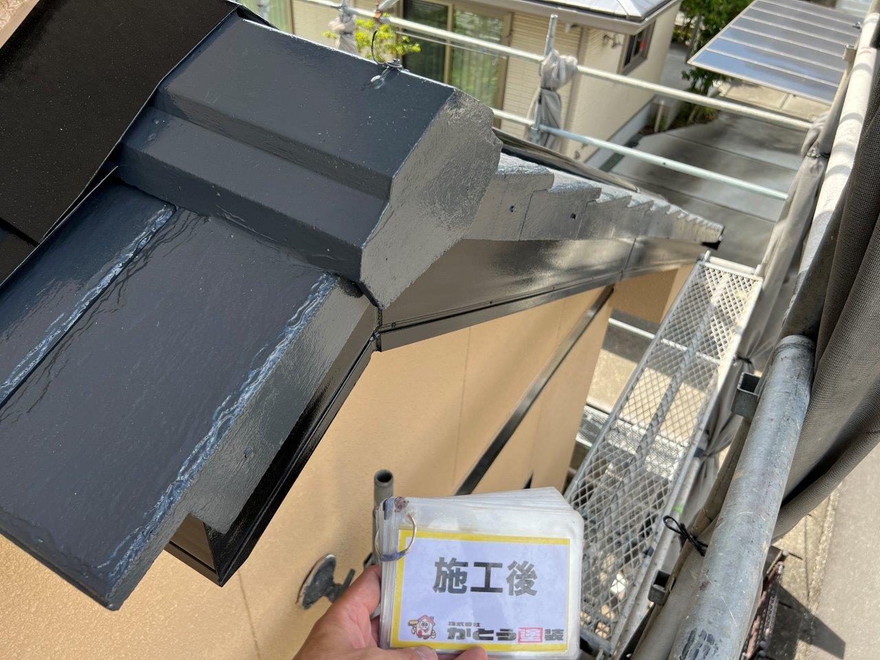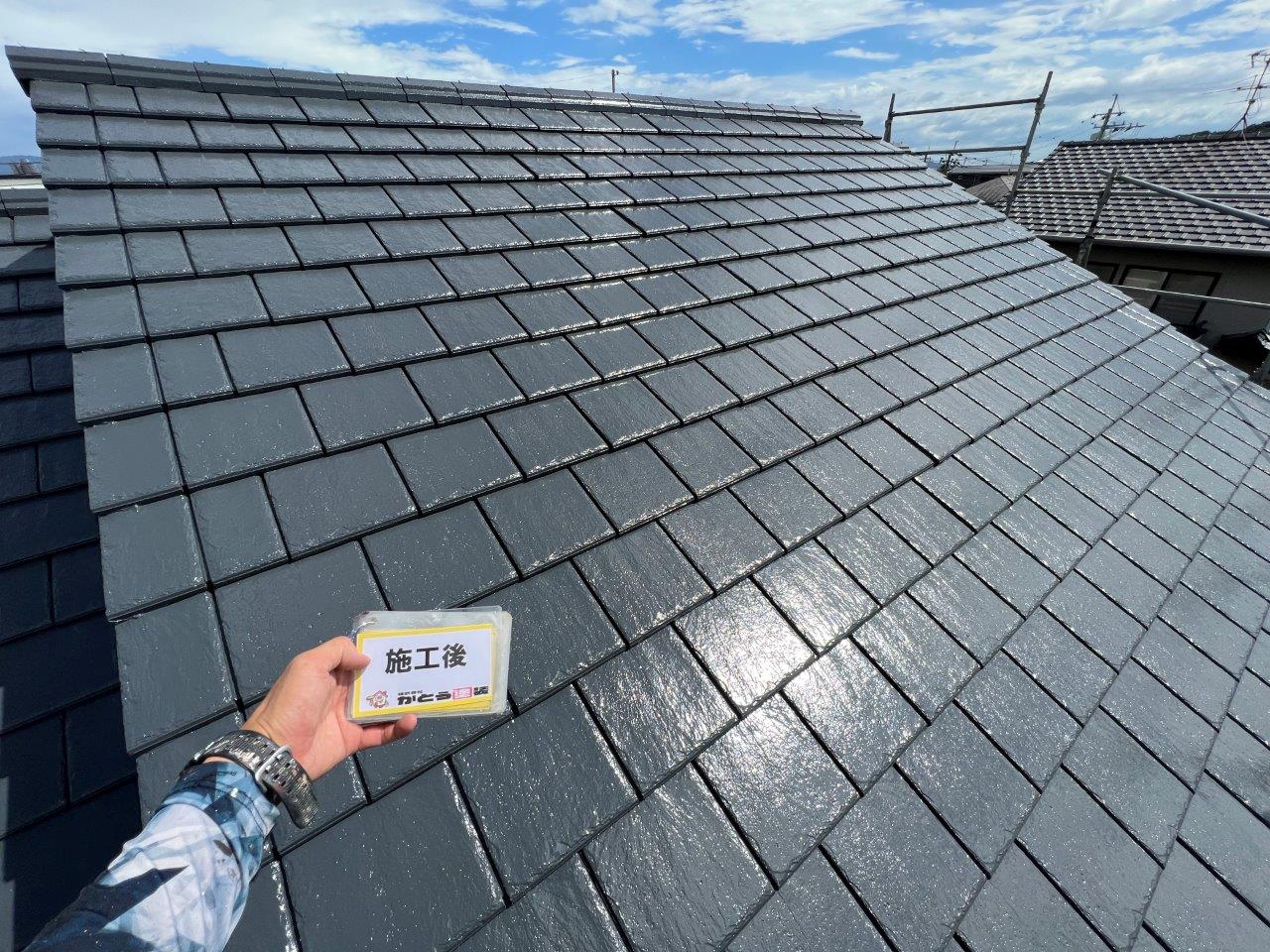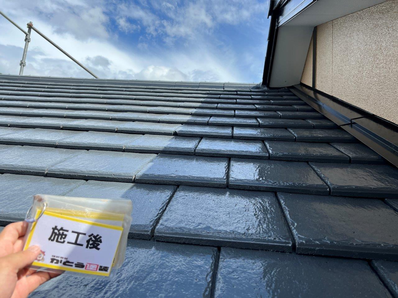 塗装工事が完了しました。屋根の施工後のお写真です。ガイソールーフ無機で施工しています。非常に高耐久の塗料です。