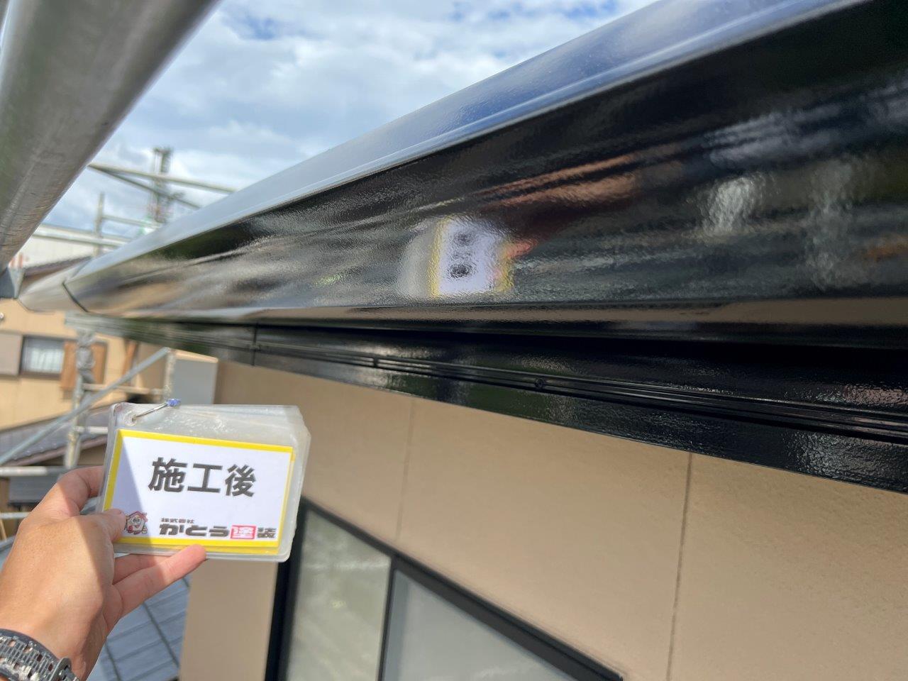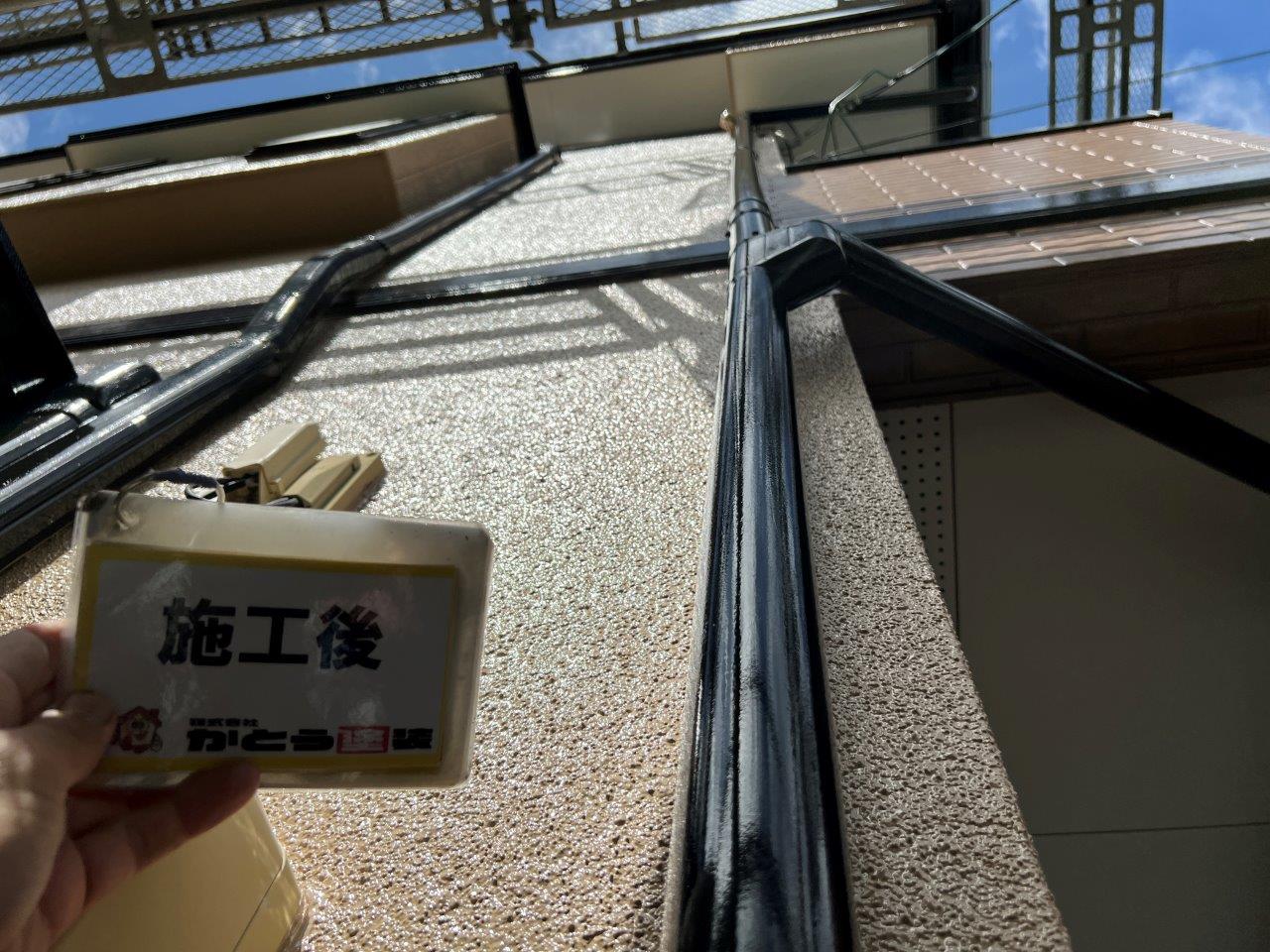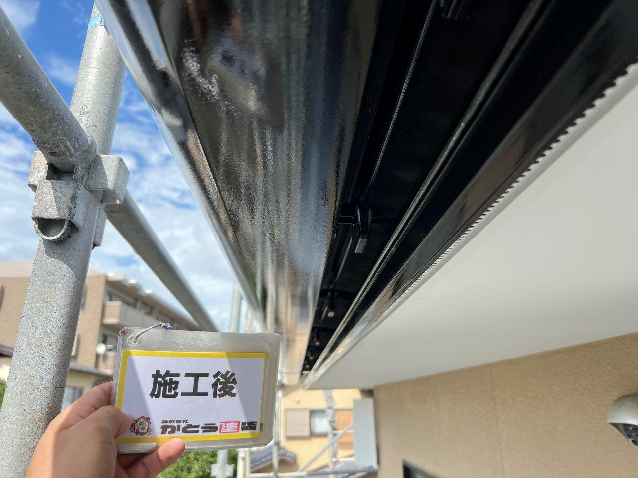 鼻隠し、雨樋、軒天の施工後のお写真です。フッ素4F塗料で塗装しました。なかなかここまで付帯部塗装でフッ素4Fを使用している業者は少ないとおもいます。実際に競合他社はウレタンかシリコンで施工しているのでウレタンだと3年で日がよく当たる箇所はチョーキングして手に粉が付着しはじめます。シリコンだと5年前後ですね。