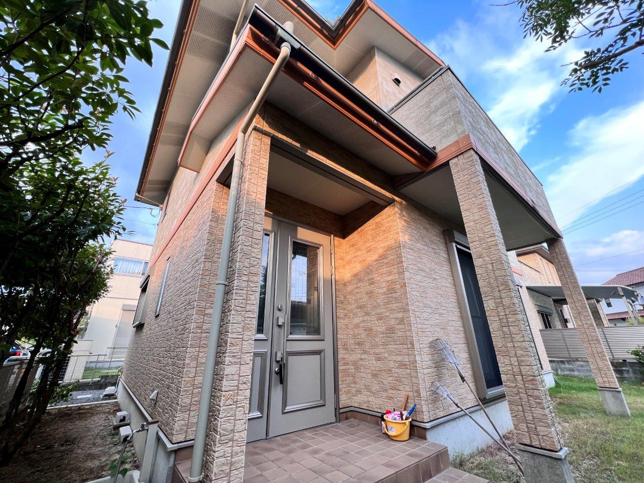 施工前のお写真です。色褪せて褪色しております。多彩色サイディングボードのため何色か色がはいっています。単色で塗りつぶしにするには勿体ないとおもい今回はWB多彩模様仕上げで意匠性ををもたせました。