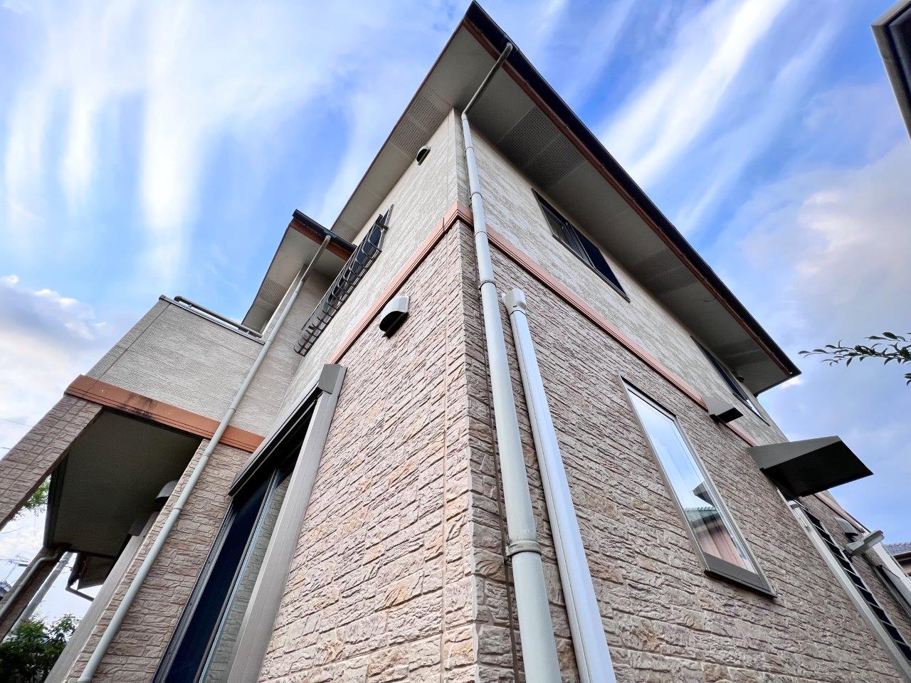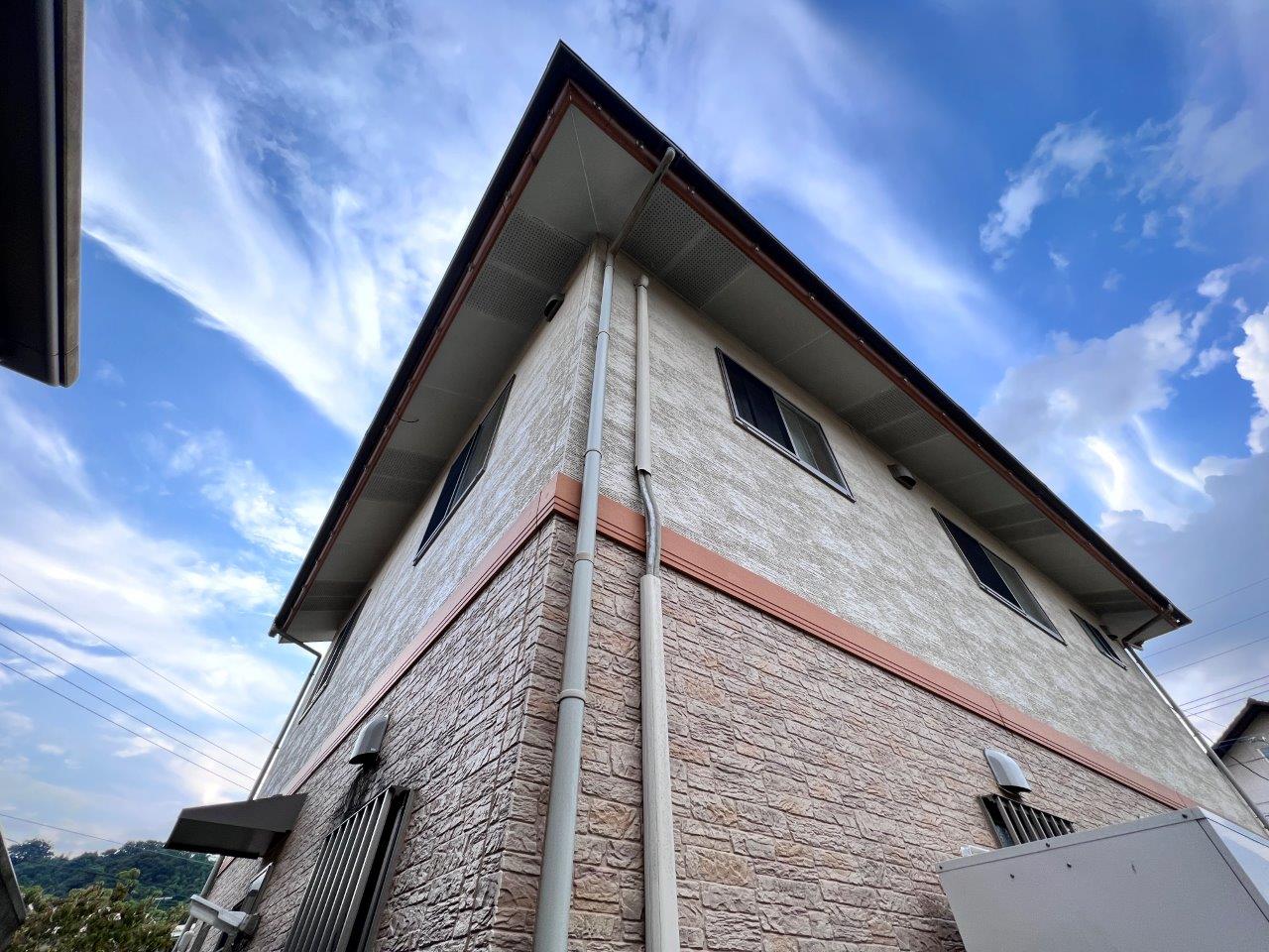 施工後のお写真です。2F部分は無機系の塗料で塗装しております。雨どいはフッ素4FⅡ、1階部分はWB多彩模様仕上げで意匠性を高め高級感ある仕上がりに、基礎のはばきの塗装もしております。屋根は石付板金のセネターをカバー工法にて施工しております。家全体が明るくなりました。