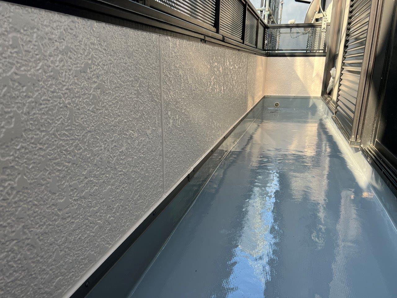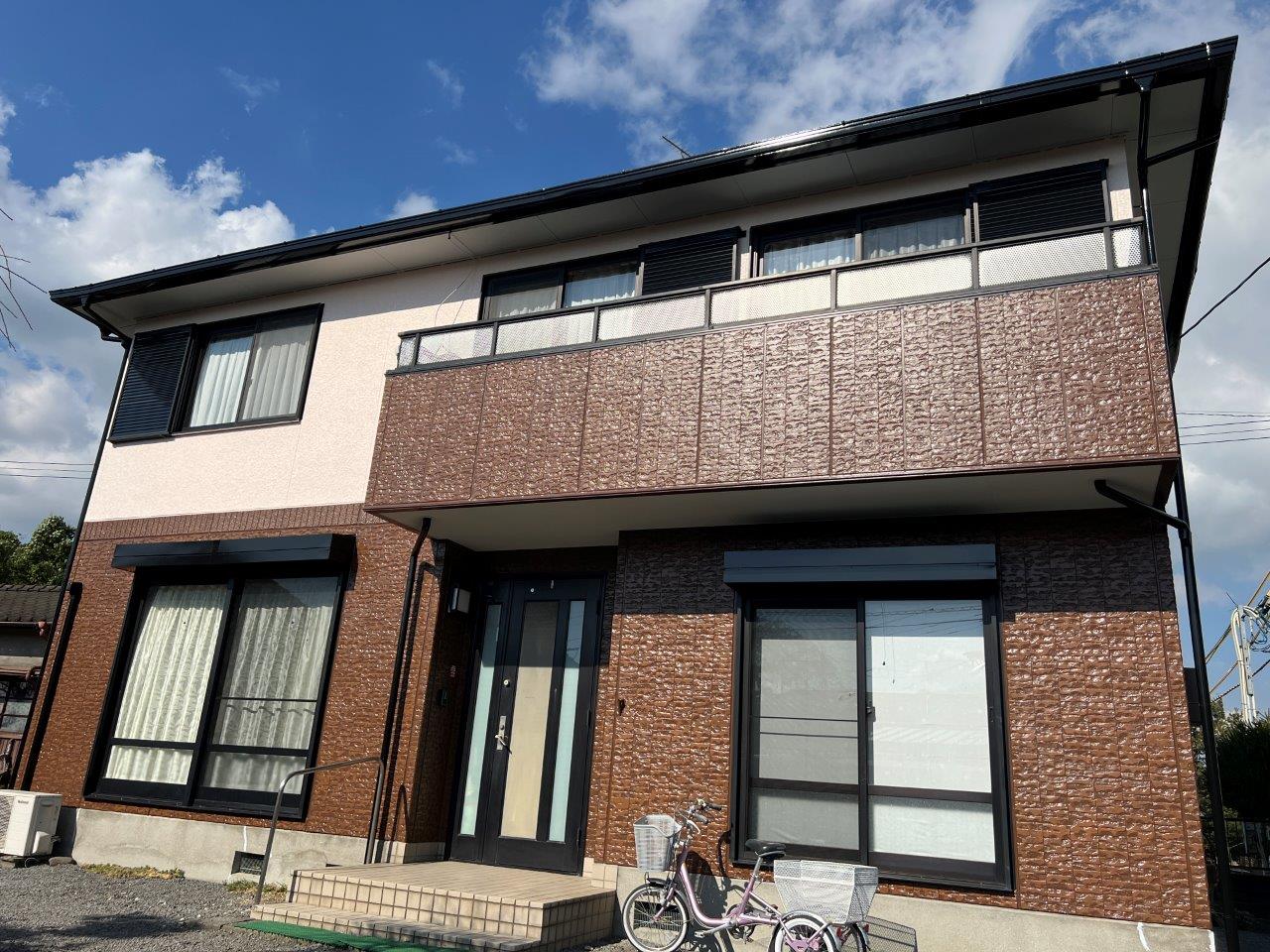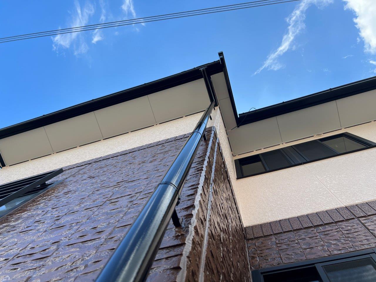 2F部分は無機塗料で施工しました。1F部分とバルコニー部分の外壁はWB多彩模様仕上げ工法にて施工しました。意匠性をもたせ単色で塗りつぶしにするよりも遥かにお家の外観がかっこよくなりました。外壁以外の箇所、シャッターボックスや雨どい、室外機のカバー、雨戸などはブラックで統一して窓のサッシに合わせて違和感なく塗装しました。また高級塗料であるフッ素4FⅡで塗装しておりますので、長期にわたってその美観を維持することができます。