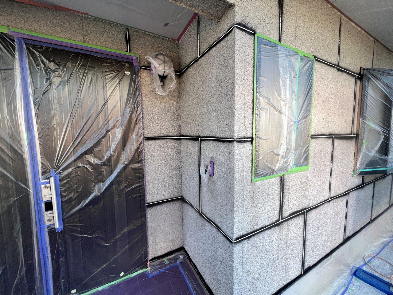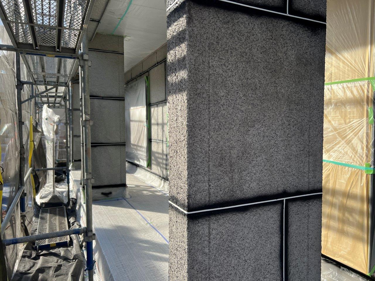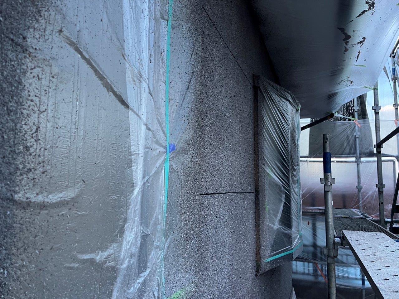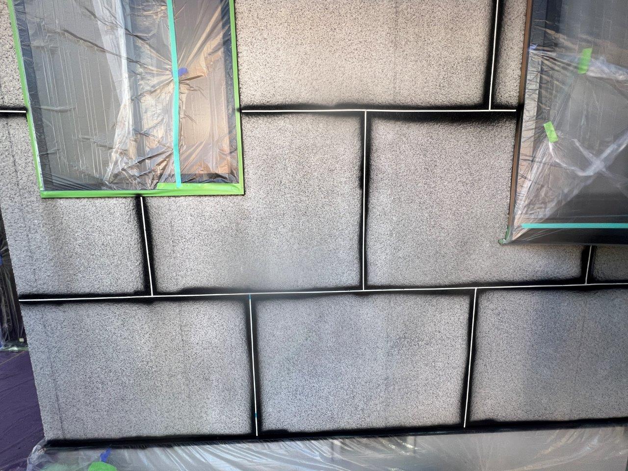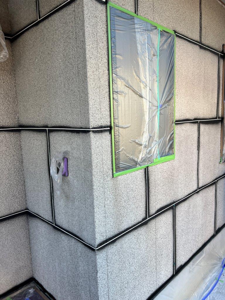 目地テープの剝がすタイミングも早過ぎてだめですし、遅すぎてもだめなので見計らってとります。早すぎると目地の回りについている石彫が剝がれたりします。遅いと目地テープの上についている石彫塗料が固まってしまい、取れななります。塗装は塗るだけではなくおういった下準備等の作業が多いです。乾燥後にはフッ素クリアー塗装して石彫をコーティングします。