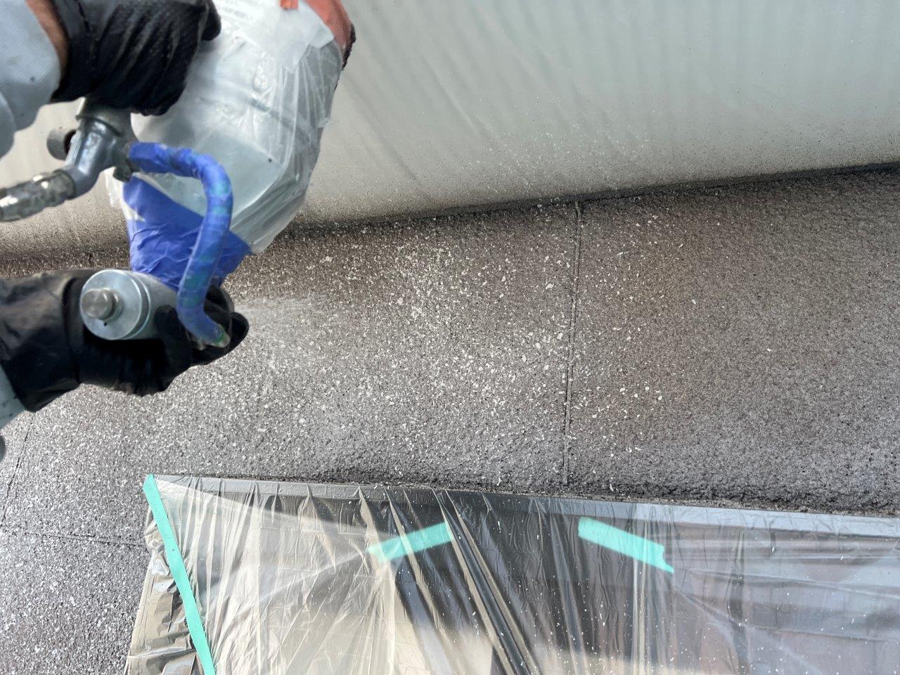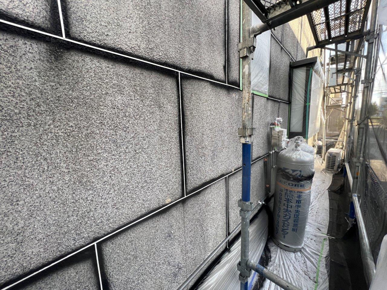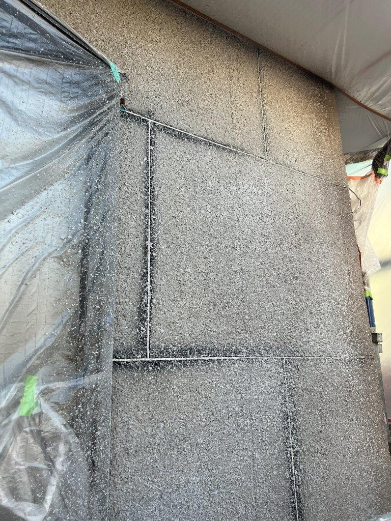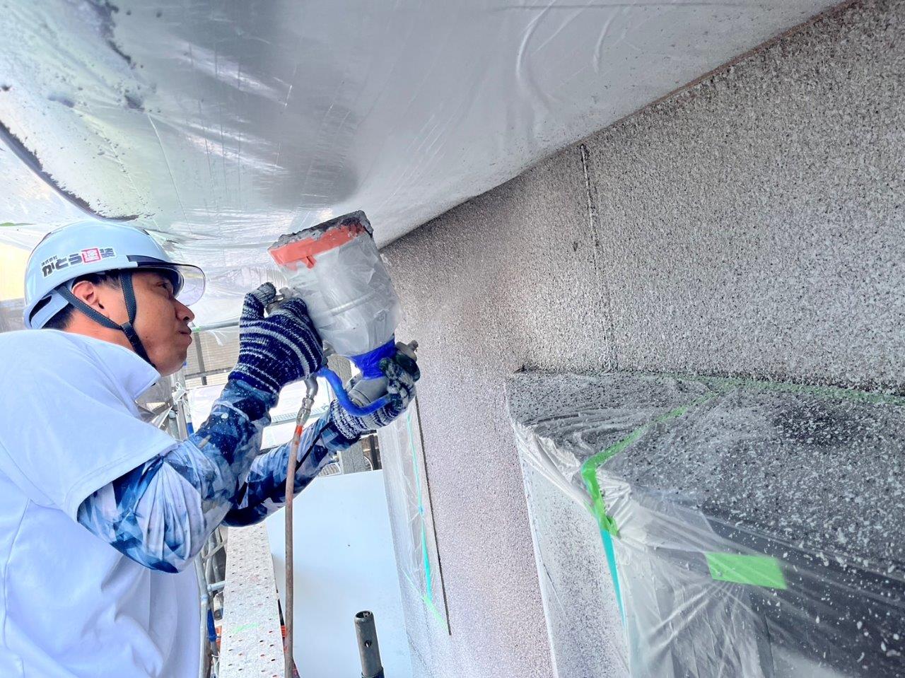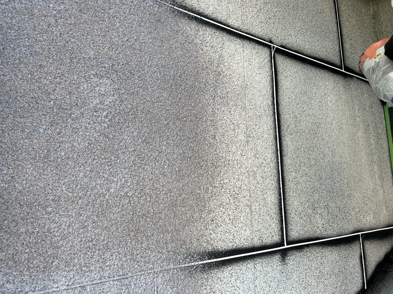 目地テープの剝がすタイミングも早過ぎてだめですし、遅すぎてもだめなので見計らってとります。早すぎると目地の回りについている石彫が剝がれたりします。遅いと目地テープの上についている石彫塗料が固まってしまい、取れななります。塗装は塗るだけではなくおういった下準備等の作業が多いです。乾燥後にはフッ素クリアー塗装して石彫をコーティングします。