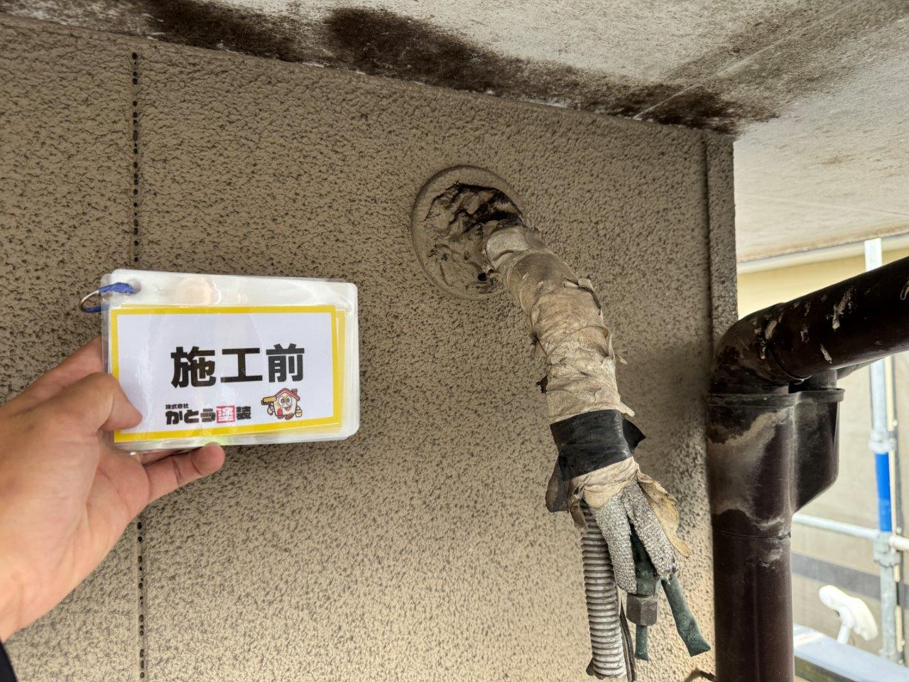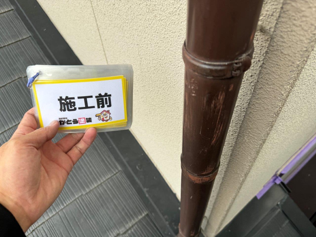 雨どいの施工前のお写真です。褪色が見受けられます。弊社かとう塗装では雨どいは2回塗り仕上げですが、前回の塗装工事では1っ回塗りで仕上げられてますね、素人目ではわかりません。
