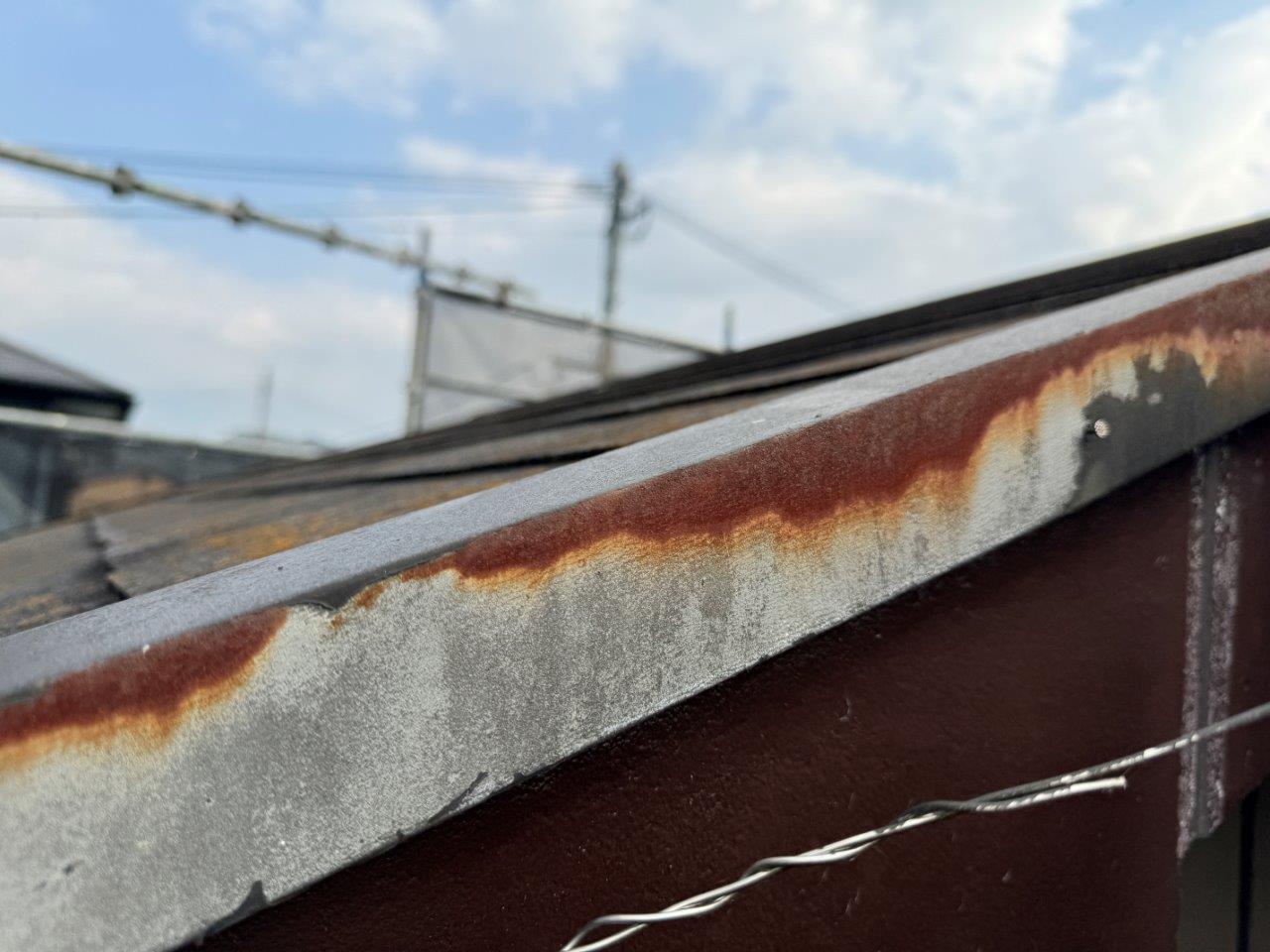 お屋根のケラバ板金はサビが発生しています。前回の塗装工事ではさび止め塗装はおこなっていませんね。釘抜け箇所もありました。塗装工事はちゃんとやればそれなりに費用もかかり手間もかかります。このように鉄部にサビ止め塗装もしない、雨どいや付帯部は1回塗りで仕上げる等やろうと思えばばなんとでもできるから怖いですよね。安かろう、高かかろうではないんです。弊社かとう塗装で綺麗がつずく塗装、できるだけ長持ちする塗装をいたします。